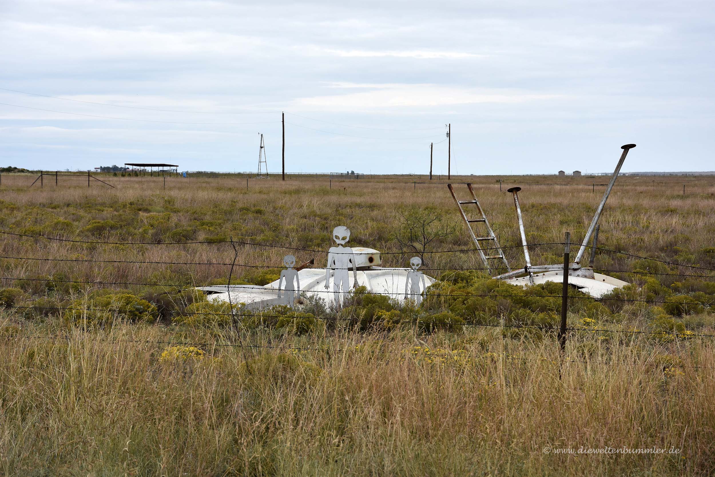 Hinter Tatum versuchte ein Farmer nochmal ein wenig Humor in die Landschaft zu bringen und stellte am Straßenrand ein paar metallene Außerirdische mit ihrem Ufo auf. Die standen aber schon so lange dort, dass man erkennen konnte, Ufos rosten auch.