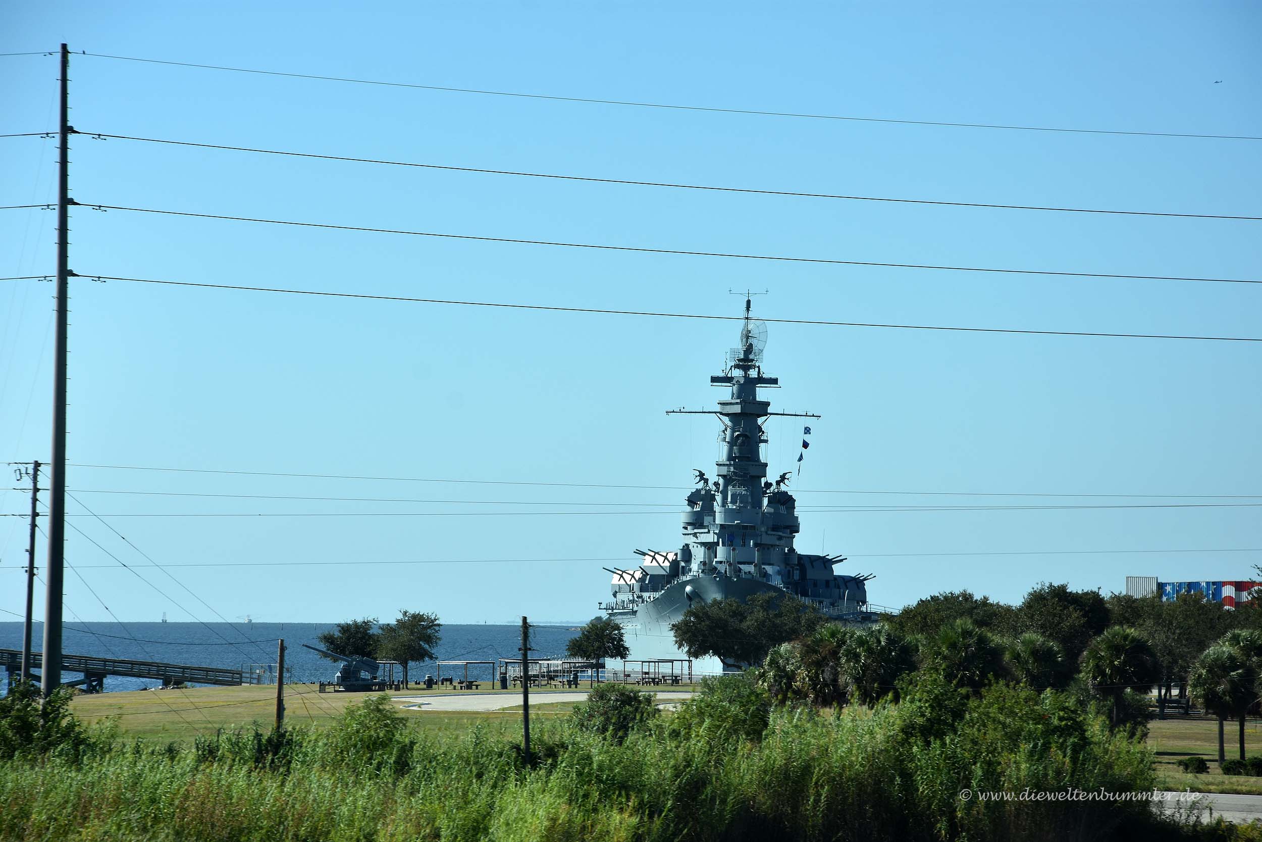 Im Nachhinein war es aber bemerkenswert, dass unsere einzigen Bilder aus Alabama – abgesehen von dem Willkommensschild – militärisches Material zeigen. Am Rastplatz stand ein Projektil, das von der USS Alabama abgefeuert wurde. Und genau dieses Schiff sahen wir im Vorbeifahren, als wir die Stadt Mobile passierten.