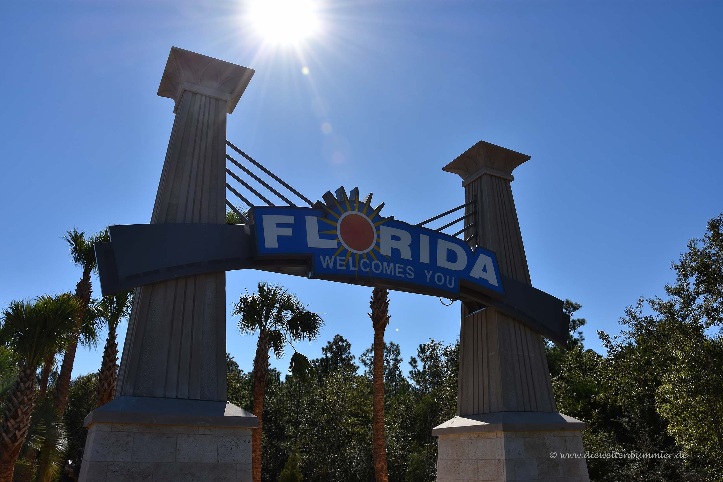 Auf der Interstate 10 erreichten wir das Willkommensschild von Florida, dass sich mit einigen Palmen passend in der Sonne zeigte. Das Schild war nicht ganz so einfach zu erreichen, denn die Interstate war hier vielbefahren und schon alleine am Straßenrand stehen zu bleiben, war nicht ganz so ohne. Außerdem mussten wir wieder durch eine Wiese staken, die die gleichen Kletten beherbergte wie die Wiese am Baumwollfeld in Texas.