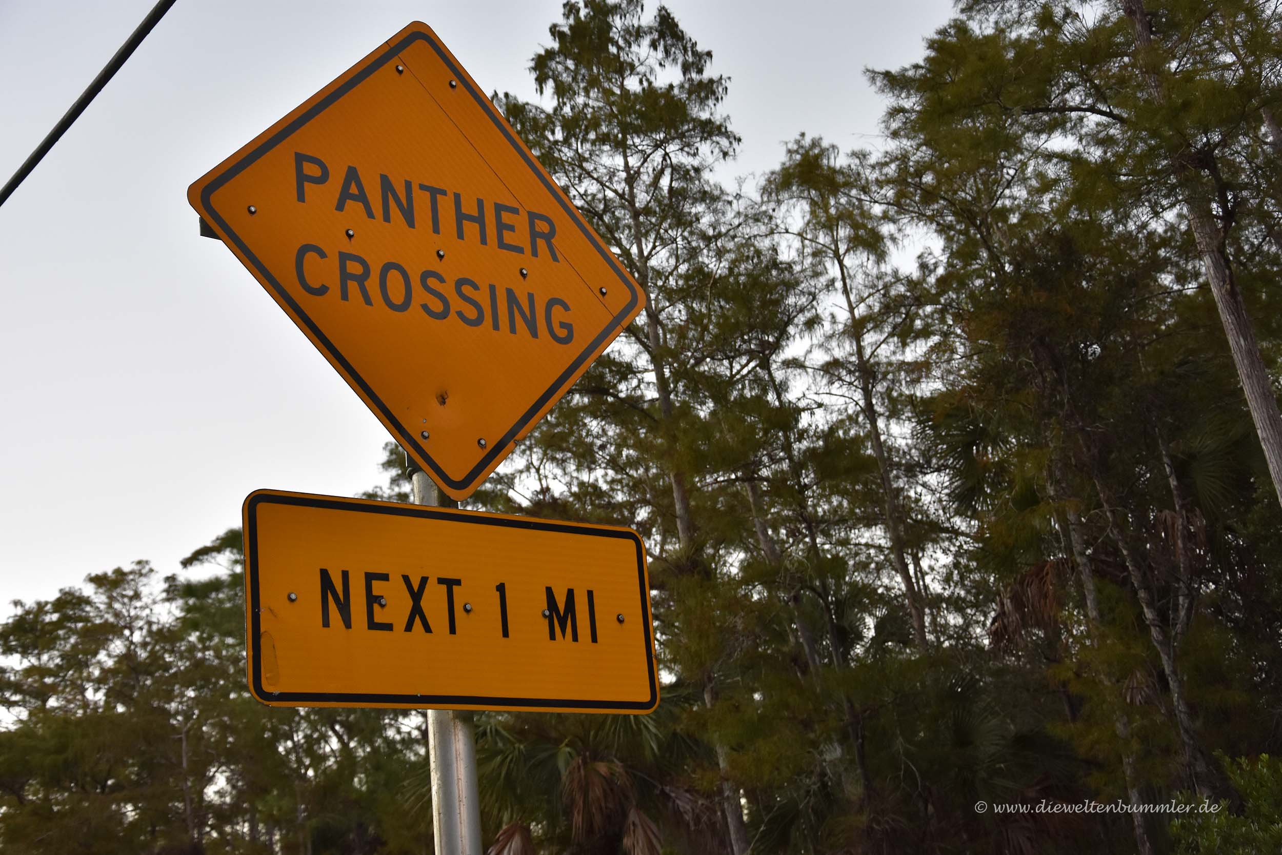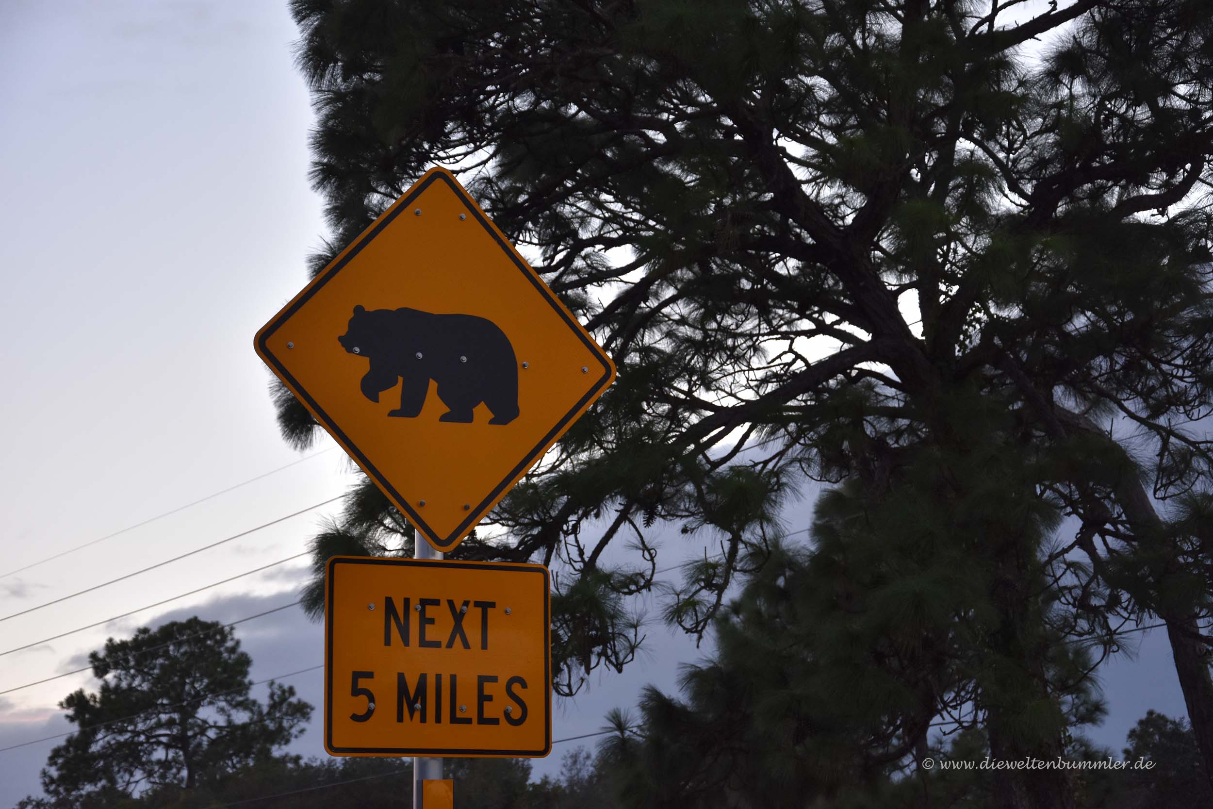 Auf dem weiteren Weg hielten wir auch an anderen Orten des Nationalparks noch einmal an und machten uns dann langsam auf den Weg nach Norden. Weil wir auch gerne noch die Landschaft links und rechts des Highways 41 kennenlernen wollten und ohnehin nicht vorgehabt hatten, in Miami zu übernachten, fuhren wir Richtung Naples. Allerdings war der Highway wenig spektakulär. Wir hielten zwar immer wieder mal Ausschau, ob wir irgendwo noch mal Wildtiere sehen würden, doch das einzige, was wir sehen konnten waren, Verkehrsschilder, auf denen vor Panthern und Bären gewarnt wurde.