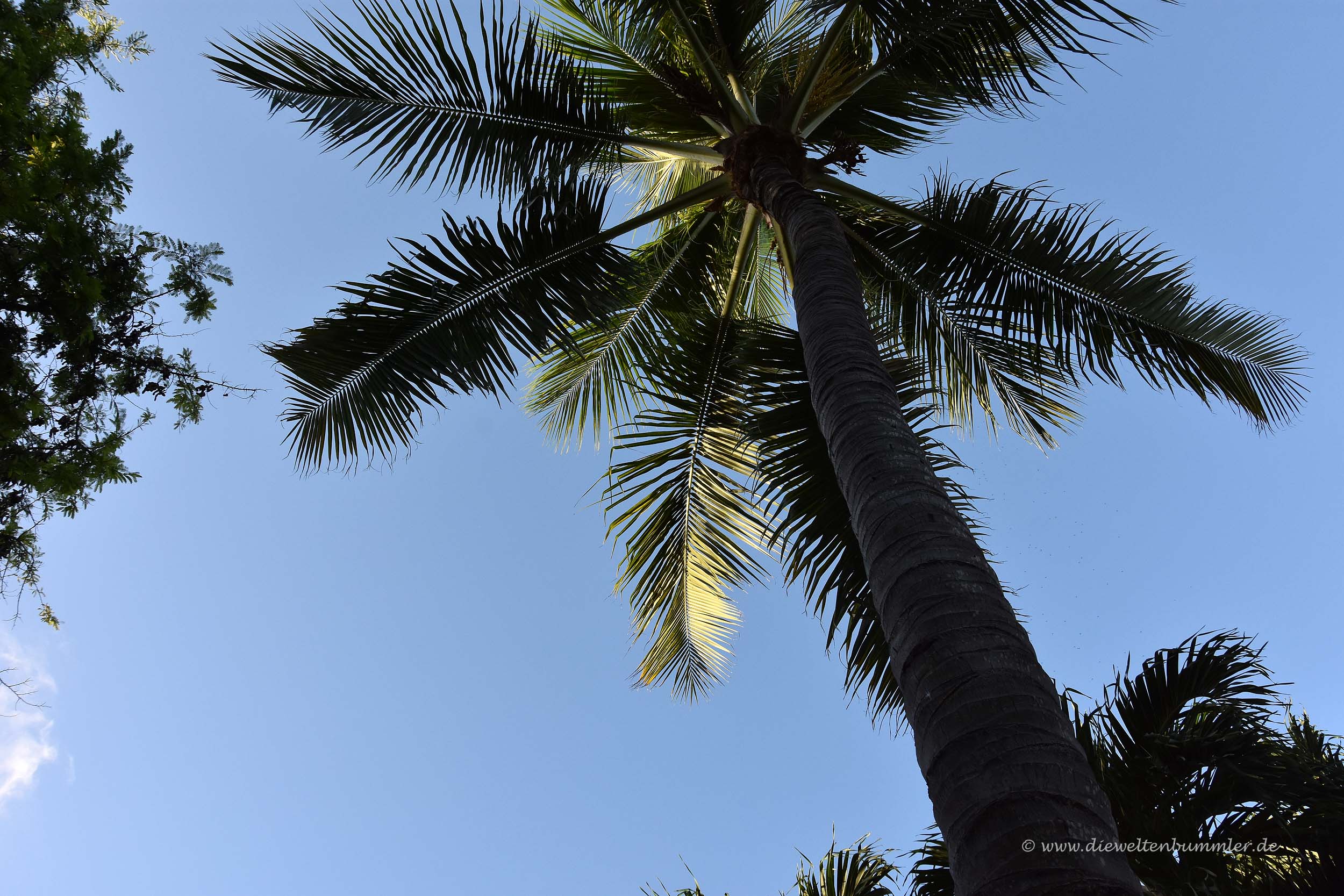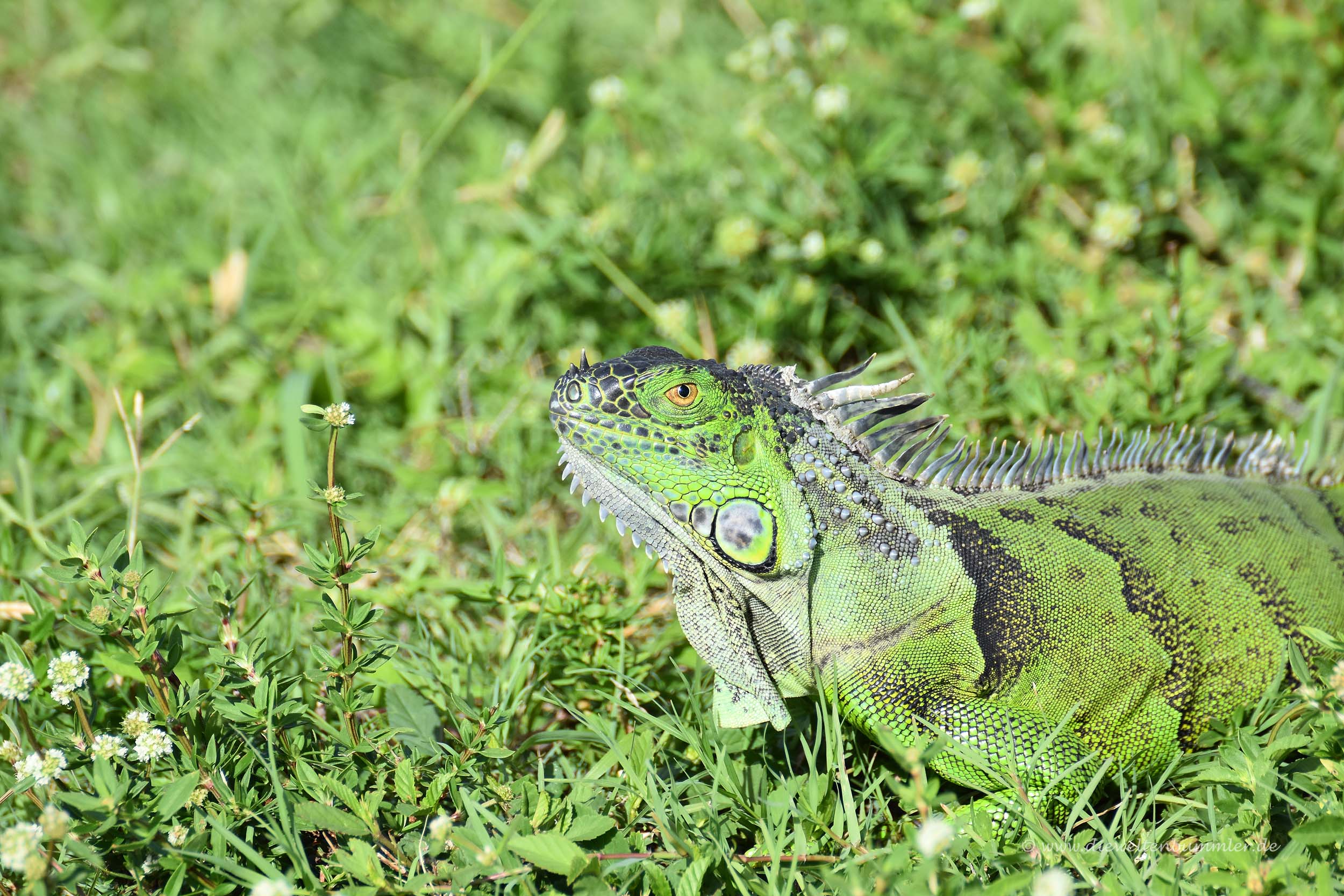 Doch die Enttäuschung legte sich kurze Zeit später. Wir fanden nämlich endlich mal einen Parkplatz, von dem aus man ein bisschen Meerblick genießen konnte. Also stiegen wir aus und spazierten ein wenig umher, als mir Moni plötzlich von Weitem Zeichen gab. Sie hatte einige grüne Leguane entdeckt, die völlig entspannt über den Gehweg marschierten und sich in die Sonne legten. Erst danach erkannte ich, dass überall um uns herum im grünen Gras grüne Leguane saßen. Das war natürlich toll. Wieder ein Tier in freier Wildbahn, dass es bei uns in Deutschland nicht gibt. Der Blick auf das Meer war nun völlig nebensächlich und wir machten natürlich von jedem einzelnen Leguan einige Aufnahmen aus gebührendem Abstand.