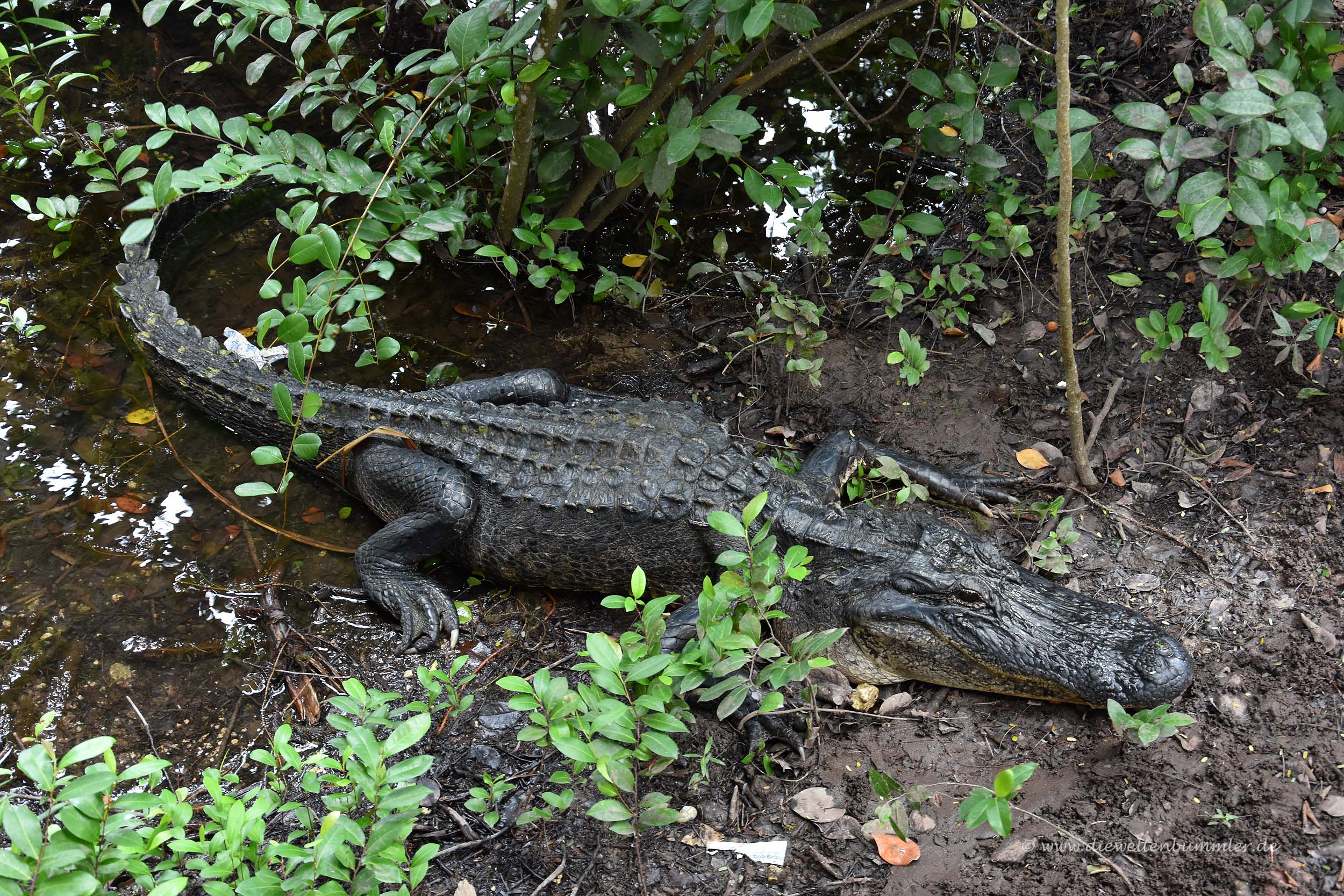 Unseren ersten Stopp hatten wir am Besucherzentrum, wo wir gerade an der Infotheke eine Karte vom Park erhielten, als eine andere Besucherin von einer Besucherterrasse hereinkam und mitteilte, dass draußen ein Alligator zu sehen wäre. Das wollten wir uns nicht entgehen lassen, gingen durch die Tür und gleich mal direkt durch bis zum Ende der Terrasse. Damit spazierten wir mal eben an dem Alligator vorbei. Dieser lag nämlich direkt neben der Tür halb unter der Terrasse. Völlig ungefährlich für uns, weil er uns nicht erreichen konnte, aber trotzdem eindrucksvoll. Es wirkte zwar ein wenig, als wären wir in einem Zoo, wo wir über ein Geländer auf ein wildes Tier blicken würde. Doch der Unterschied zu einem Zoo war eben der, dass diese Tier sich frei bewegen konnte und nur freiwillig so nah kam. Es gab um das Areal keinen Zaun und kein Gehege.