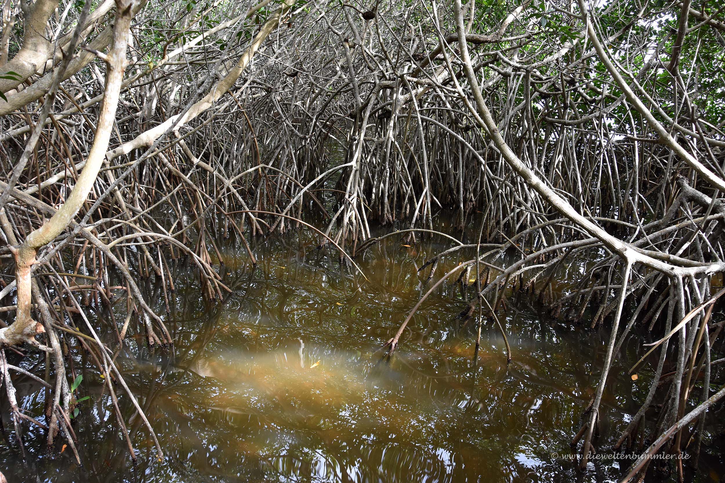 Auf dem Rückweg passierten wir noch den West Lake, wo wir ebenfalls anhielten. Dort gab es einen Holzbohlenweg durch einen wunderbaren Mangrovenwald. Das dichtgewachsene Holz auf dem nassen Boden war echt eindrucksvoll und wir fanden es gut, dass man hier einen kleinen Weg angelegt hat, um mal einen Eindruck davon zu bekommen, wie es in so einem Mangrovenwald aussieht. Der Holzweg führte direkt bis in den See hinein, wo schon einige deutsche Touristen standen und auf das Wasser zeigten. Irgendwo in der Ferne schwamm ein Krokodil durch den See und es war auch für uns noch einen kurzen Augenblick sichtbar. Aber ob es nun ein Krokodil oder ein Alligator war, war für uns aus der Entfernung nicht erkennbar. Leider tauchte das Tier auch nicht mehr auf.