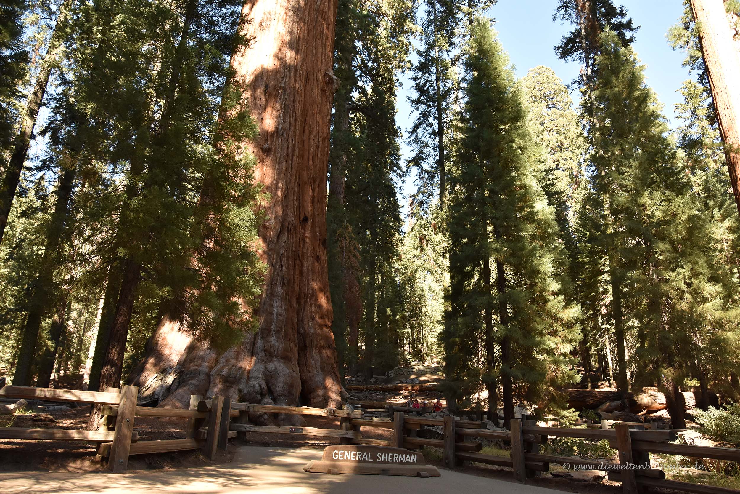 Doch für die Hauptsehenswürdigkeit mussten wir noch ein deutliches Stückchen weiter fahren und tatsächlich einen kleinen Spaziergang vom Parkplatz aus unternehmen. Da hatten wir natürlich überhaupt nichts gegen, aber es war schon ungewöhnlich. Die Rede ist vom General Sherman, dem zweitältesten Lebewesen auf diesem Planeten.