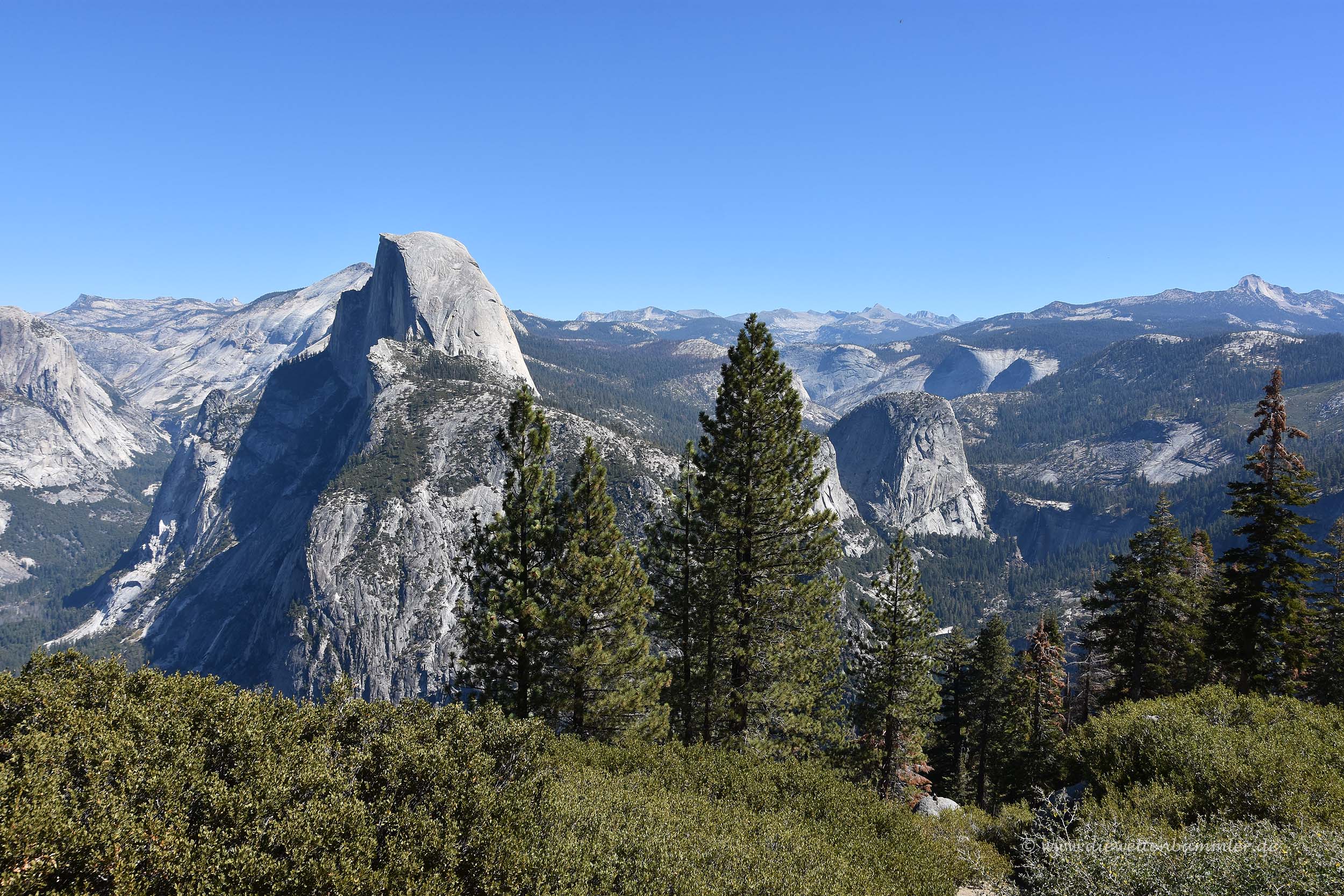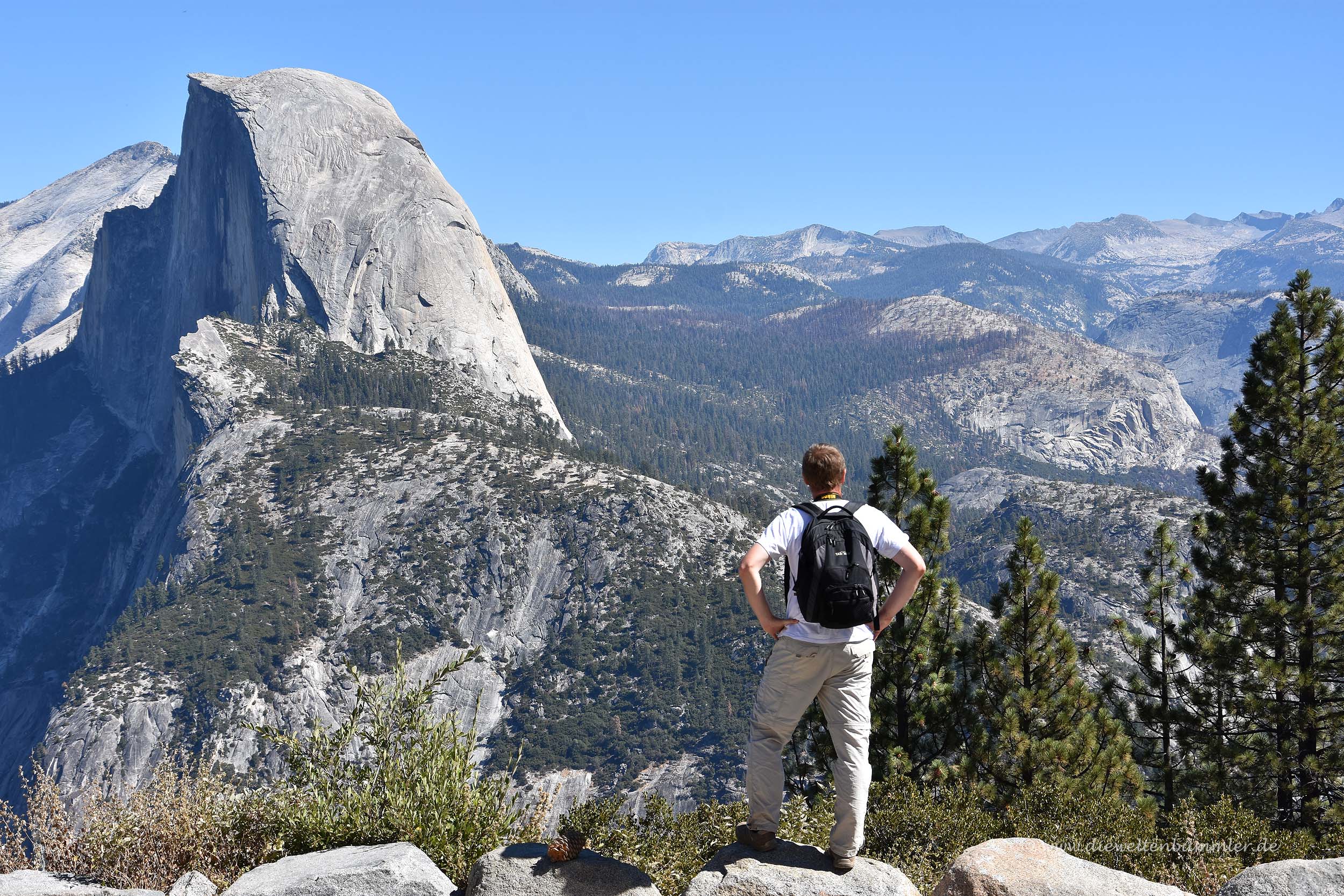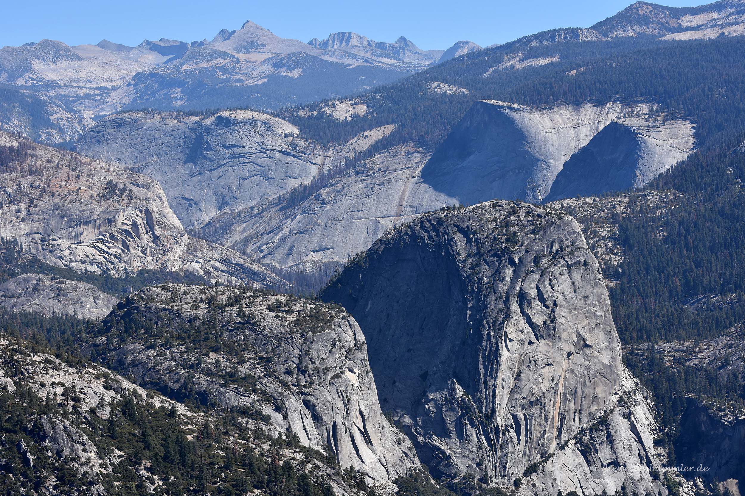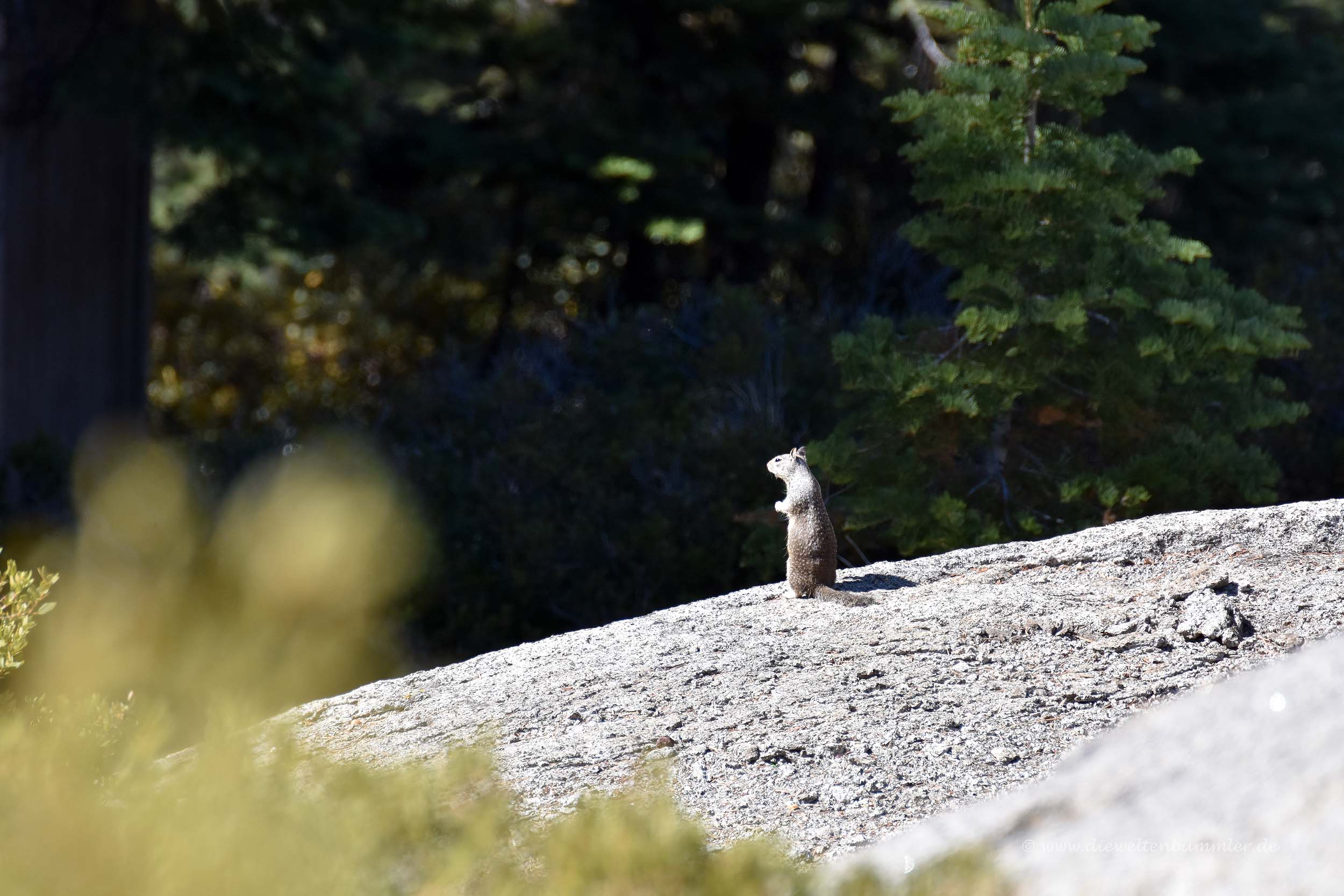 Besonders markant ist dabei der Half Dome, der seinen Namen verdientermaßen trägt. Wie die eine Hälfte einer Kuppel ragt er deutlich erkennbar aus der Landschaft empor. Mit dem Teleobjektiv konnten wir gut erkennen, dass selbst auf diesem Berg einige Bergsteiger unterwegs waren. Aber auch unten im Tal war eine ganze Menge los, genauso wie hier oben auf dem Glacier Point. Hier befinden sich übrigens nicht nur Touristen, sondern auch Murmeltiere, die am Waldrand standen und ihre typischen Pfiffe ausstießen.