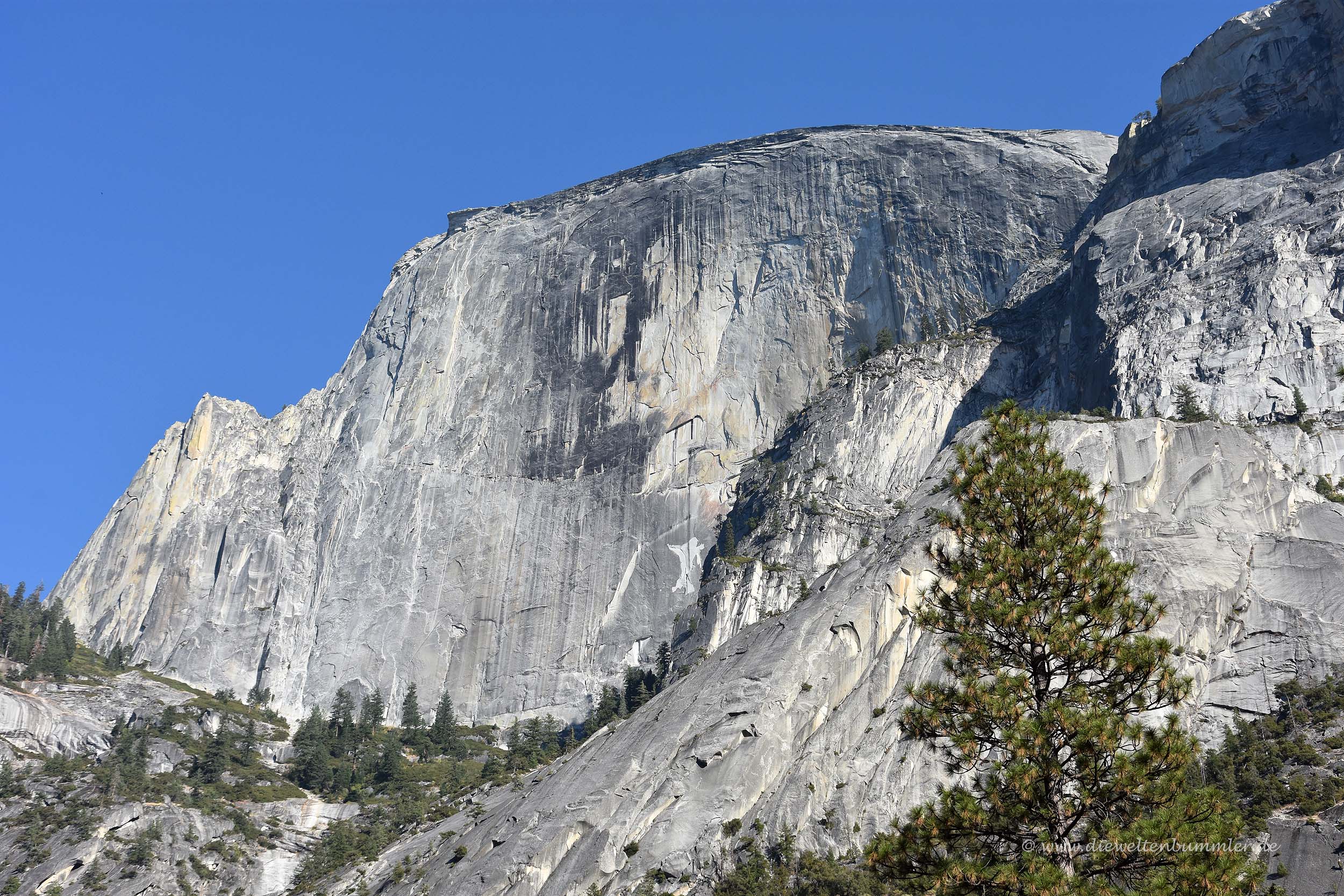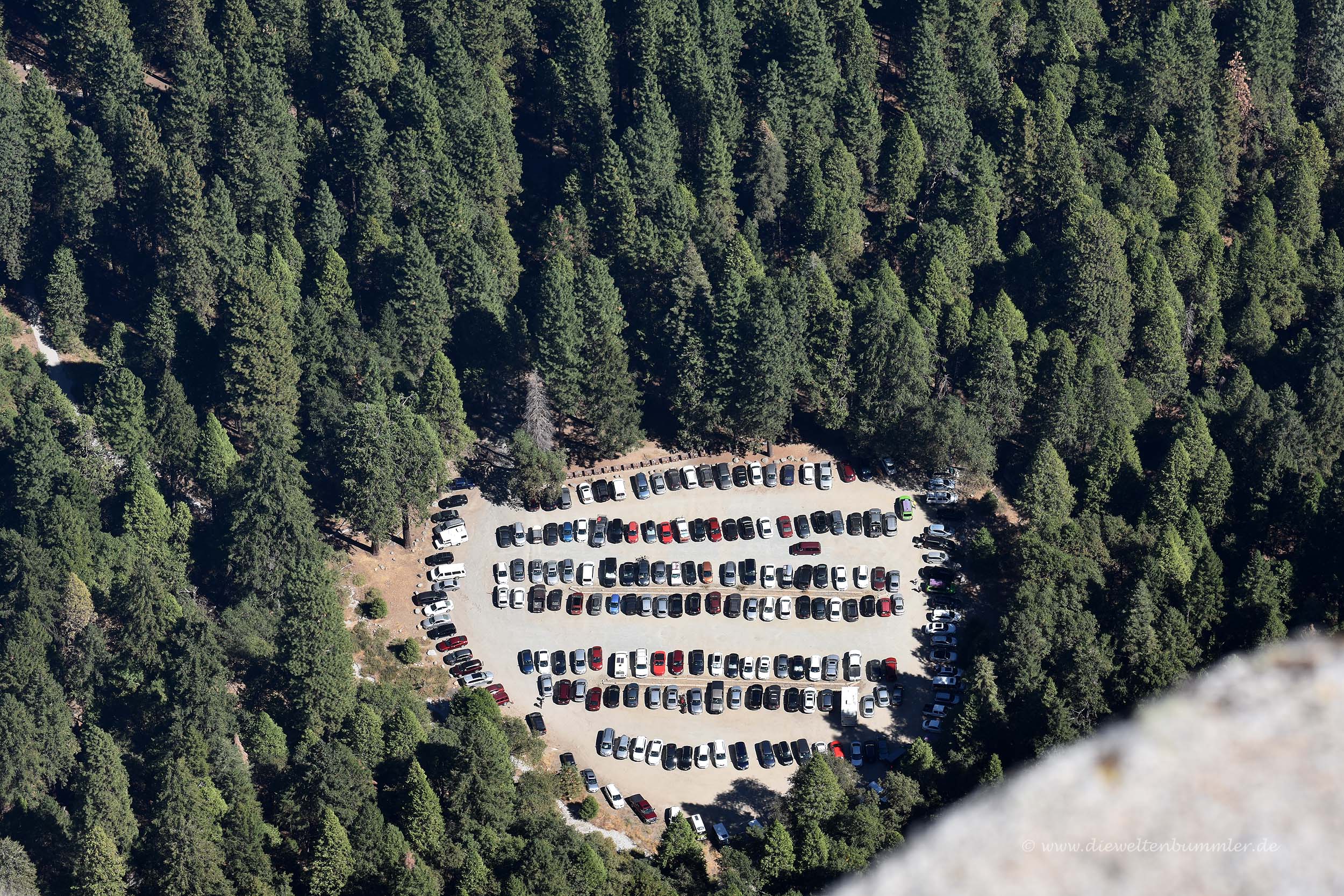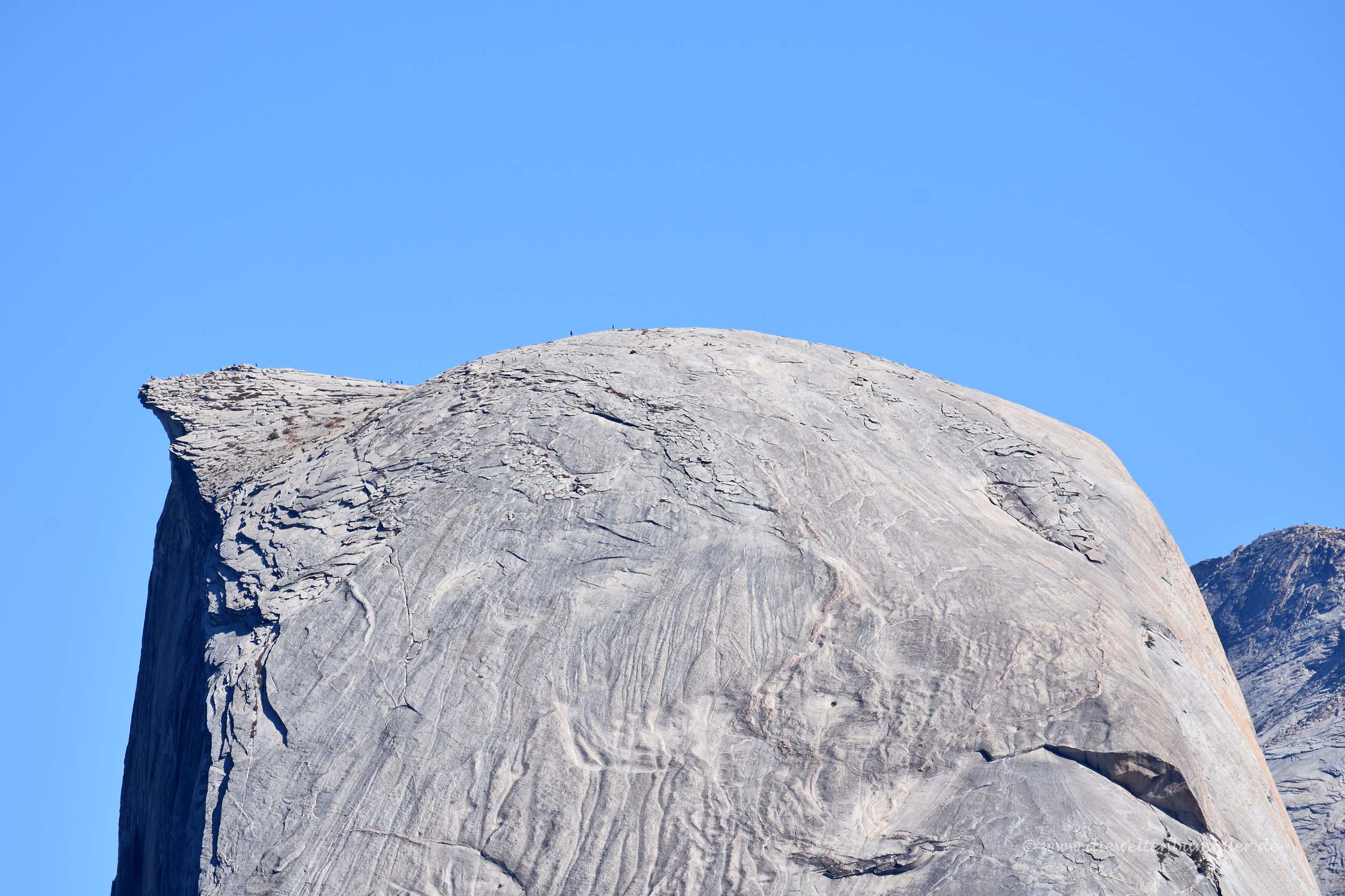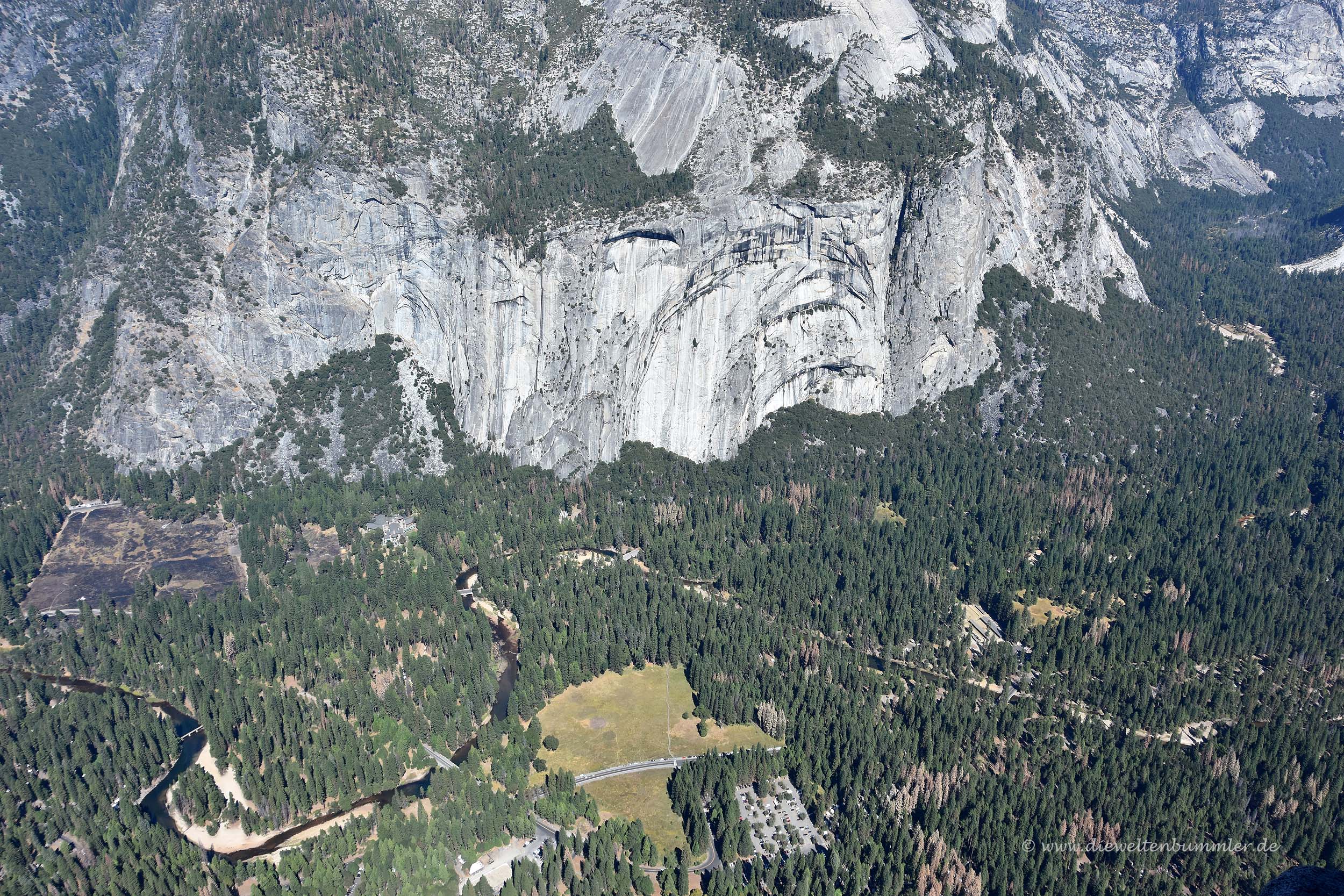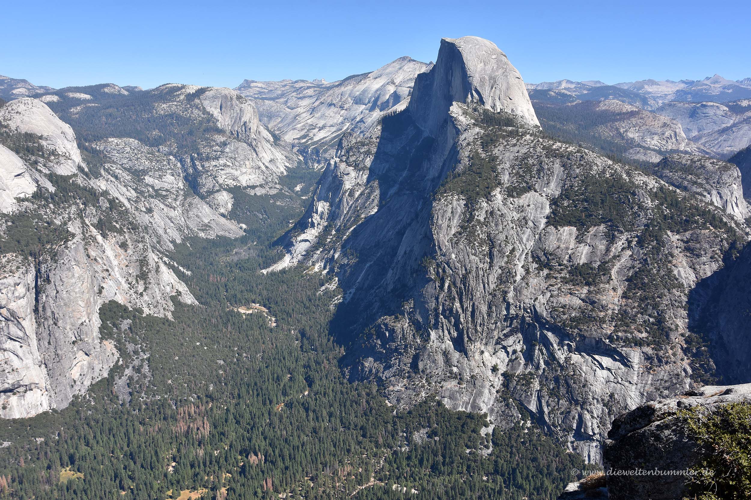 Besonders markant ist dabei der Half Dome, der seinen Namen verdientermaßen trägt. Wie die eine Hälfte einer Kuppel ragt er deutlich erkennbar aus der Landschaft empor. Mit dem Teleobjektiv konnten wir gut erkennen, dass selbst auf diesem Berg einige Bergsteiger unterwegs waren. Aber auch unten im Tal war eine ganze Menge los, genauso wie hier oben auf dem Glacier Point. Hier befinden sich übrigens nicht nur Touristen, sondern auch Murmeltiere, die am Waldrand standen und ihre typischen Pfiffe ausstießen.