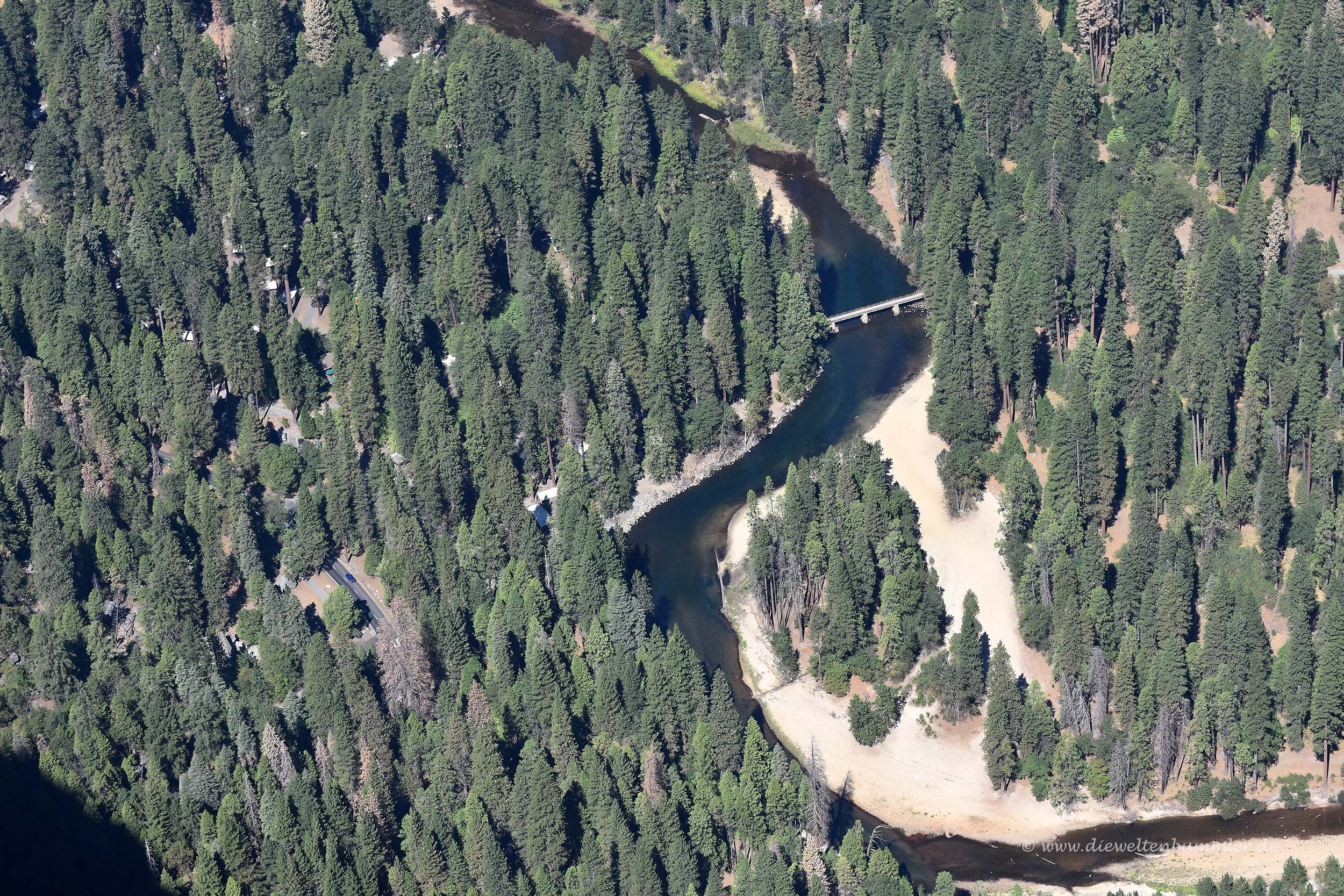 Wir fuhren unterhalb des El Capitan vorbei in das Tal hinein und fanden einen kleinen Parkplatz an der Yosemite Kapelle. Diese hübsche Holzkapelle interessierte uns allerdings weniger, denn auf der anderen Straßenseite sahen wir einen Holzsteg, wie wir ihn von Wanderungen durch das Hohe Venn und anderen Orten kannten. Er war nicht sehr lang und führte eigentlich nur zum Ufer des Merced River hinab, doch das wollten wir uns nicht nehmen lassen. Immerhin standen wir inmitten des Yosemite Valleys und konnten die steil aufragenden Felswände um uns herum genießen.