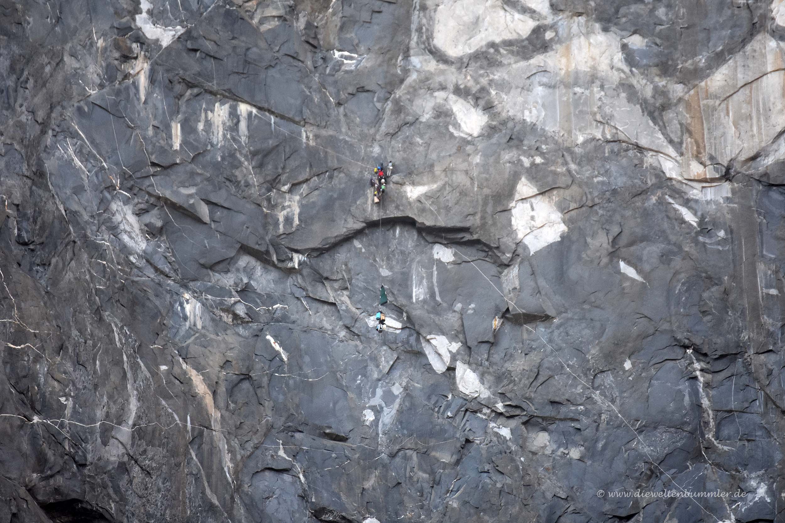 Ein paar Squirrels begegneten uns noch unterwegs und zum Schluss des Yosemite-Aufenthaltes ließen wir noch ein paar Dollar im Besucherzentrum zurück, um ein paar Andenken zu kaufen. Danach begannen wir damit, den Nationalpark langsam zu verlassen. Aber immer wieder hielten wir natürlich an und machten noch ein paar Bilder. Genau unterhalb des El Capitan erkannten wir dann auch bei der Rückfahrt, dass dort im Fels einige Kletterer unterwegs waren. Wenn man so direkt davor steht, ist das natürlich Schwindel erregend, den Leuten dabei zuzuschauen, wie sie sich mit großem Gepäck an der Wand entlang hangeln.
