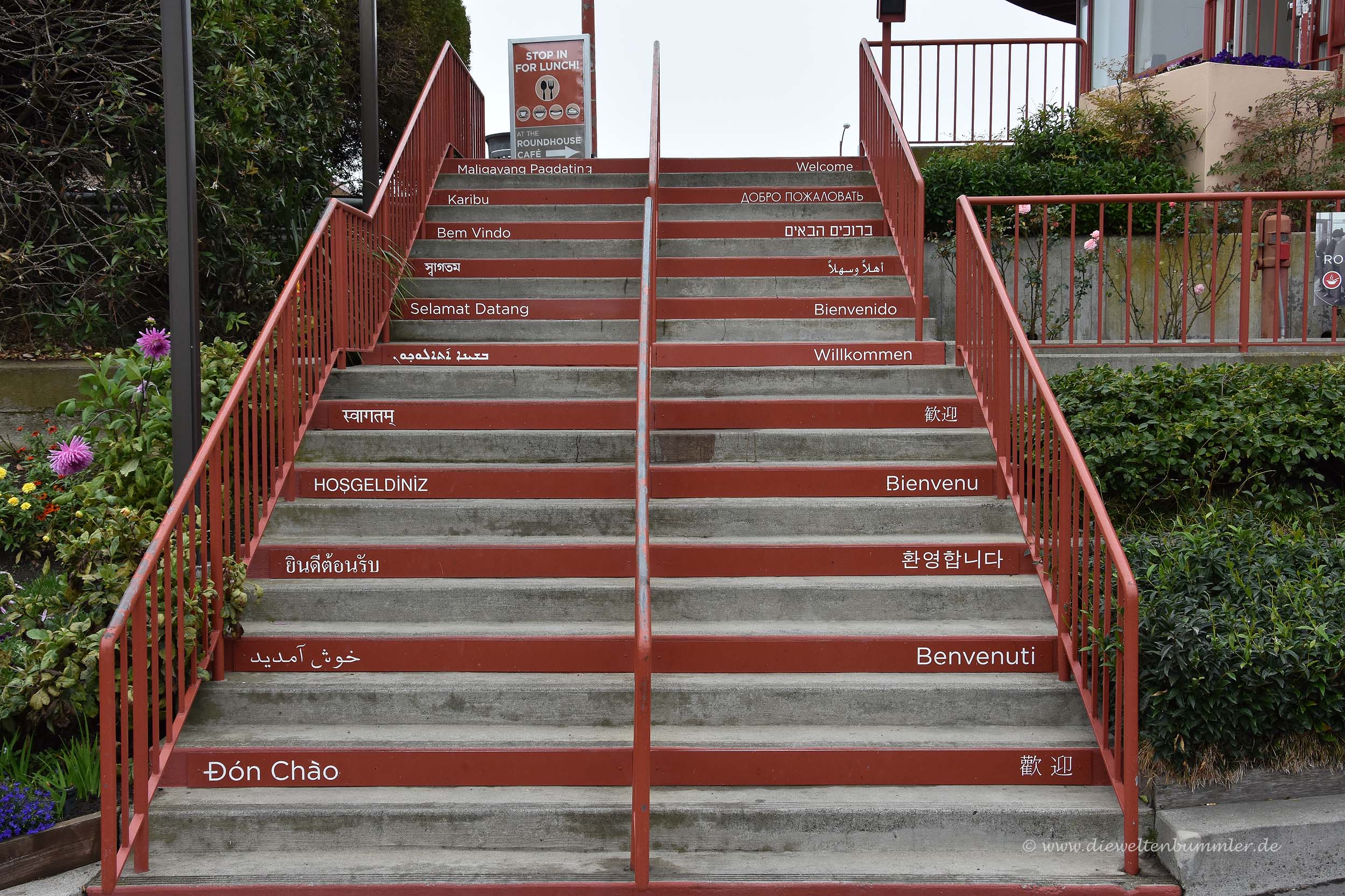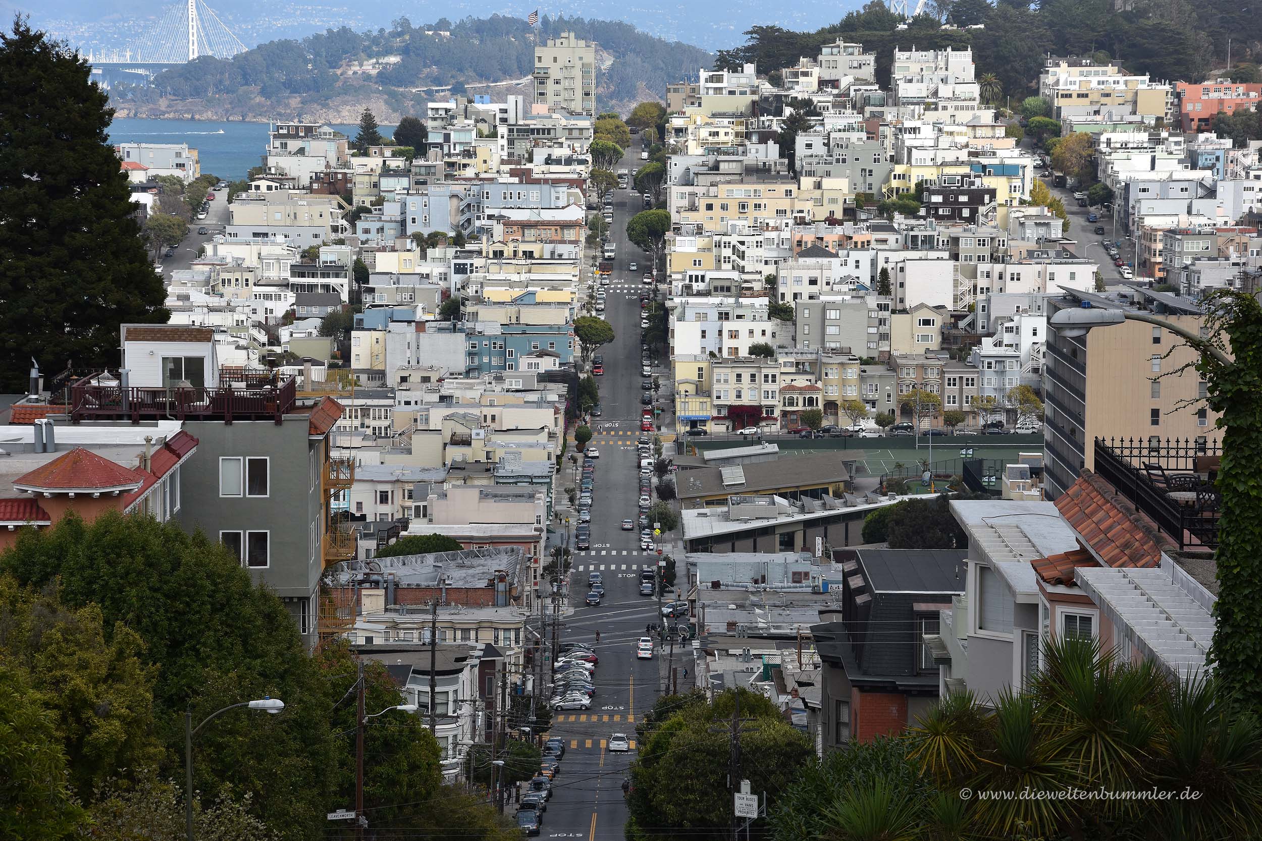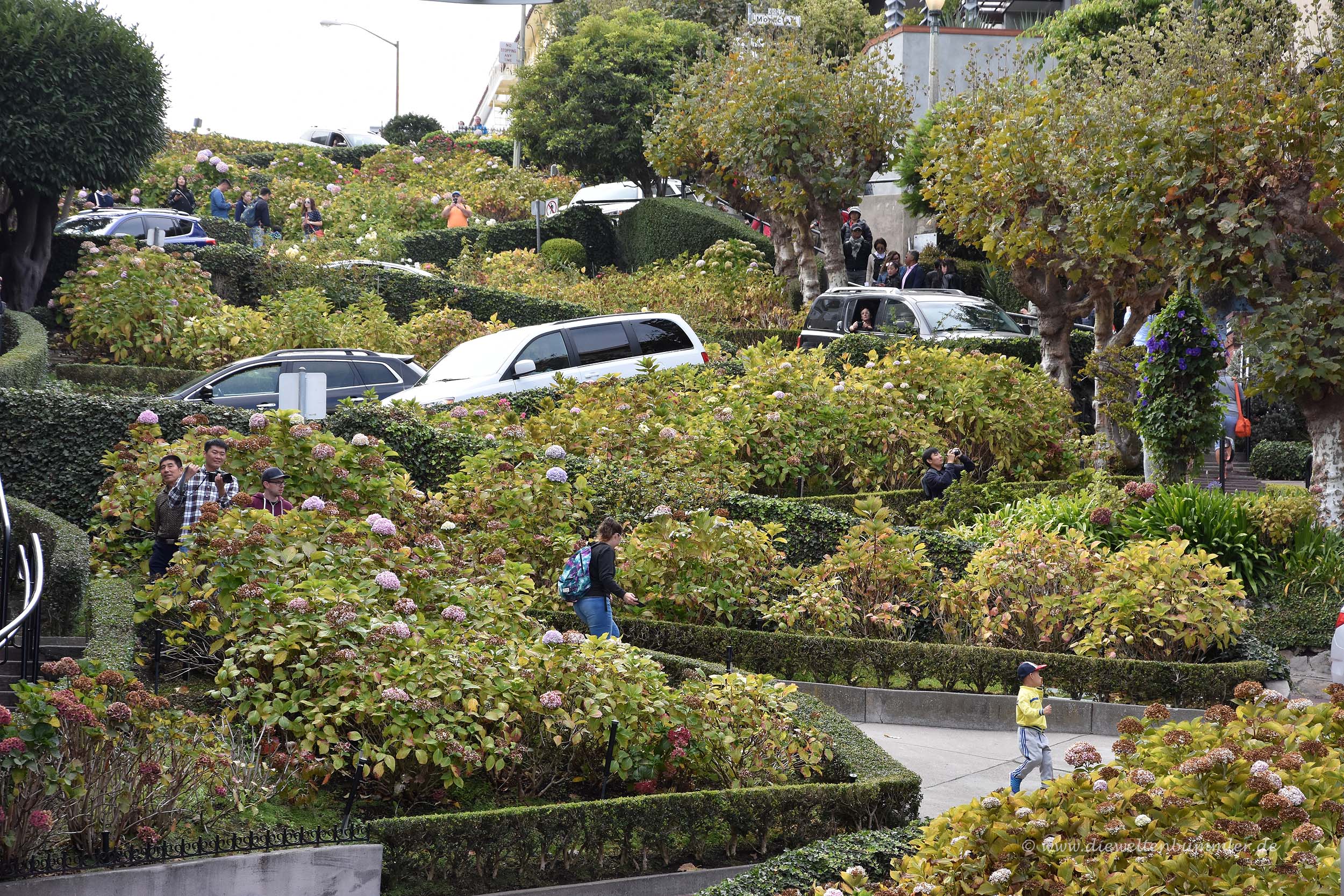 Außerdem wollten wir natürlich zur Lombard Street. Auf dieser sehr steilen Straße durchfährt man auf einer Strecke von gerade mal 130 Metern immerhin acht Kurven. Am unteren Ende der Straße stehen zahlreiche Touristen, die diesen Anblick filmen und fotografieren. Auch wir wollten davon ein paar Fotos machen und die Straße natürlich auch befahren.