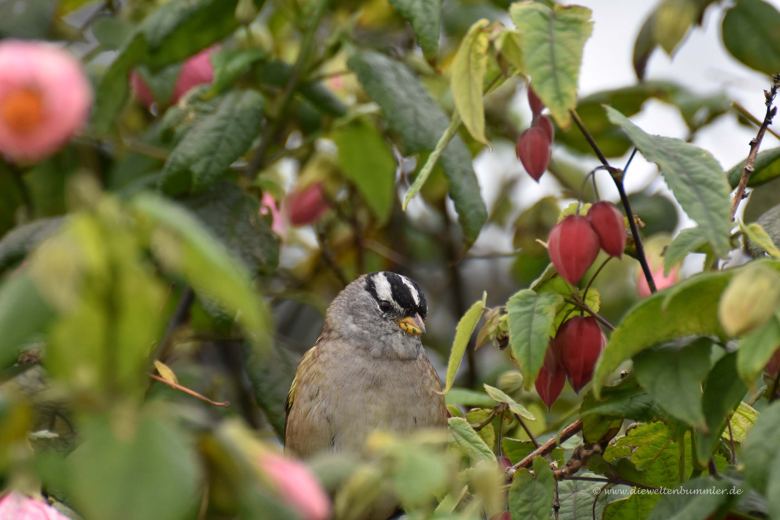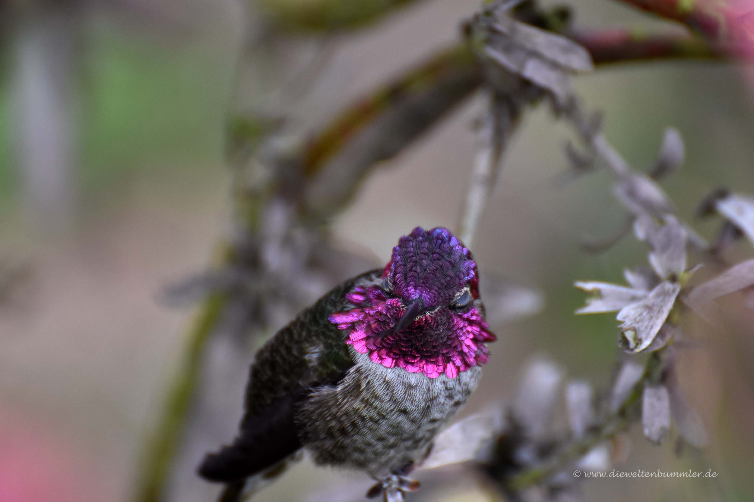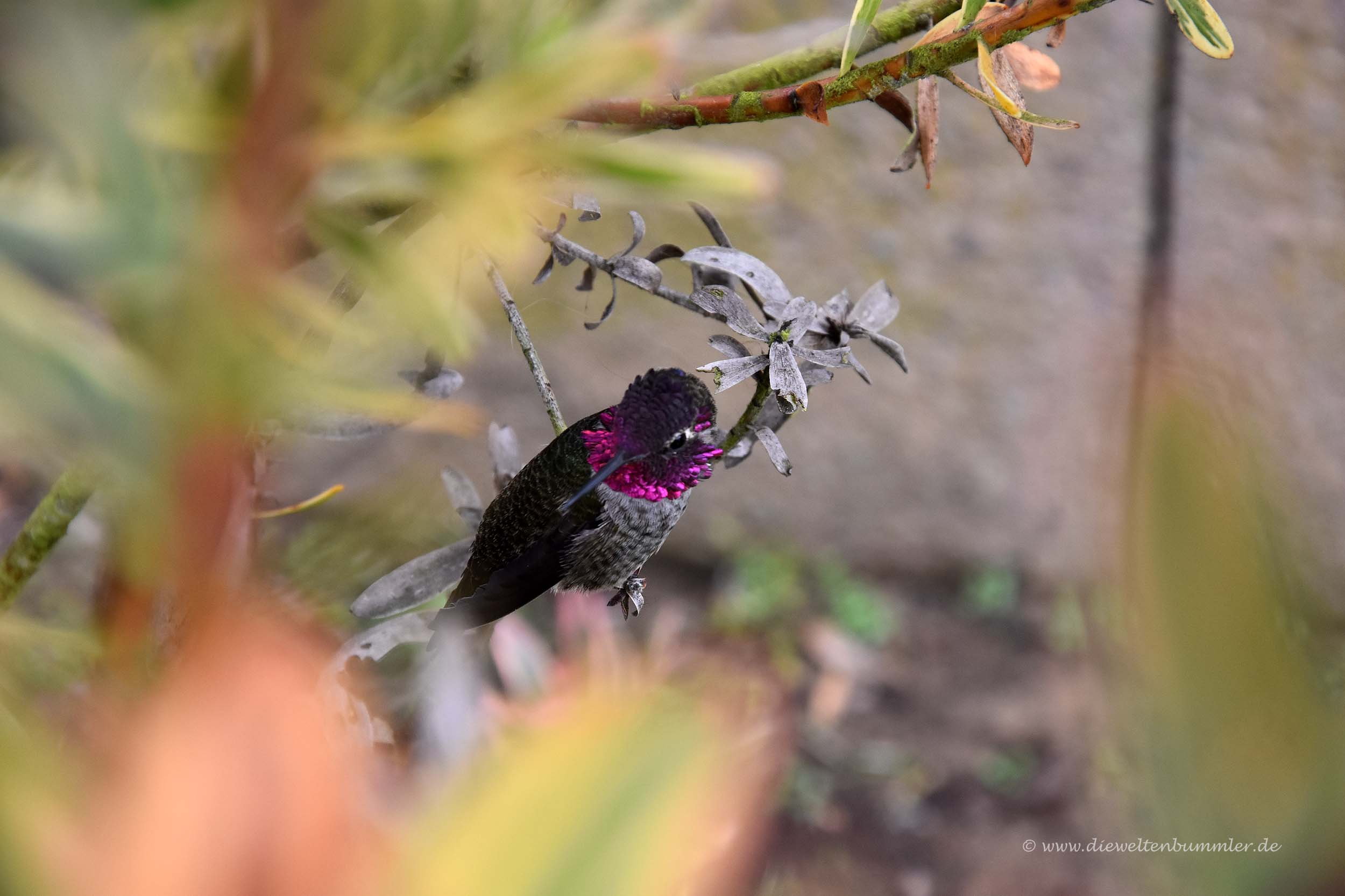 Für uns war es natürlich ein Grund mehr, nun die Golden Gate-Bridge aus nächster Nähe zu sehen, sprich sie zu überqueren. Doch während ich noch dabei war, ein paar Fotos von der Brücke im Nebel zu machen, hielt Moni ihre Kamera in die andere Richtung. Verdutzt fragte ich, was sie da machen würde und sie zeigte nur lautlos in ein ganz kleines Gebüsch. Dort saß doch tatsächlich ein Kolibri. Kein Mensch hatte den Kolibri bemerkt, außer Moni und plötzlich war die vernebelte Brücke für uns Nebensache.