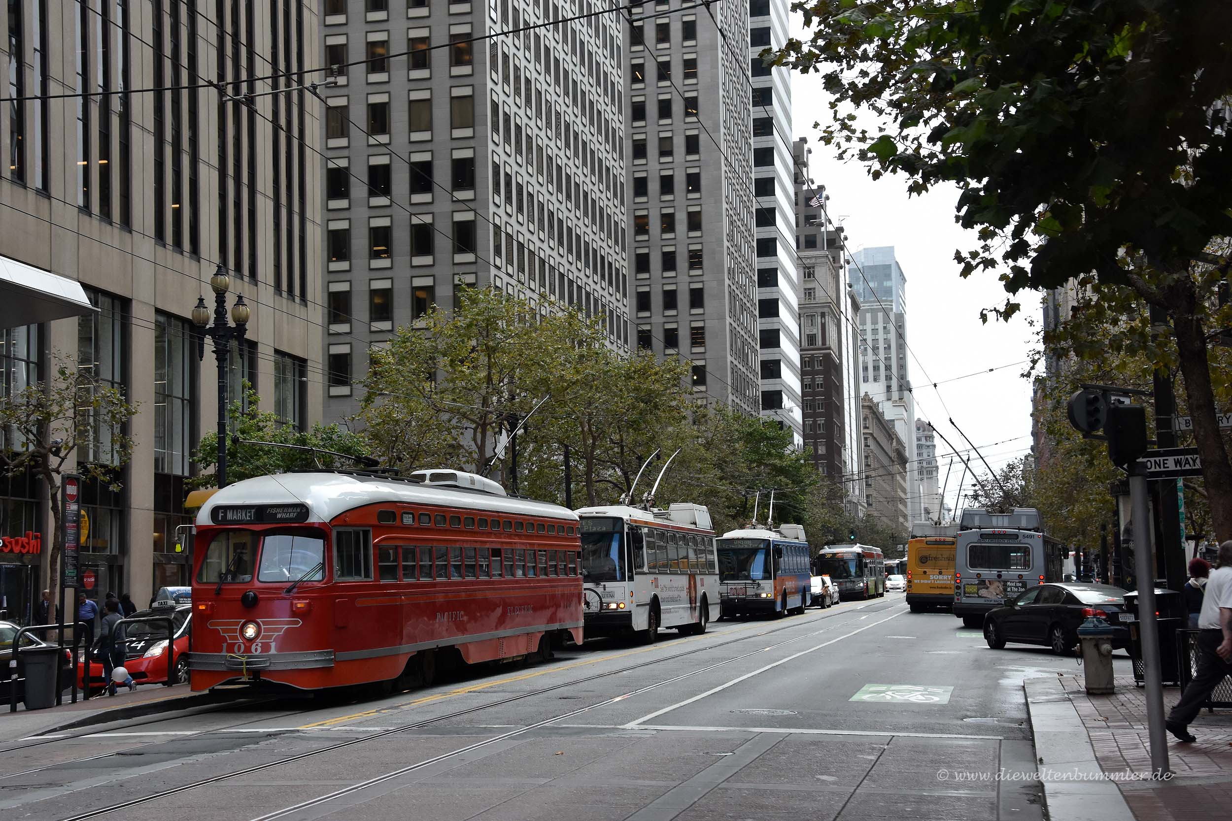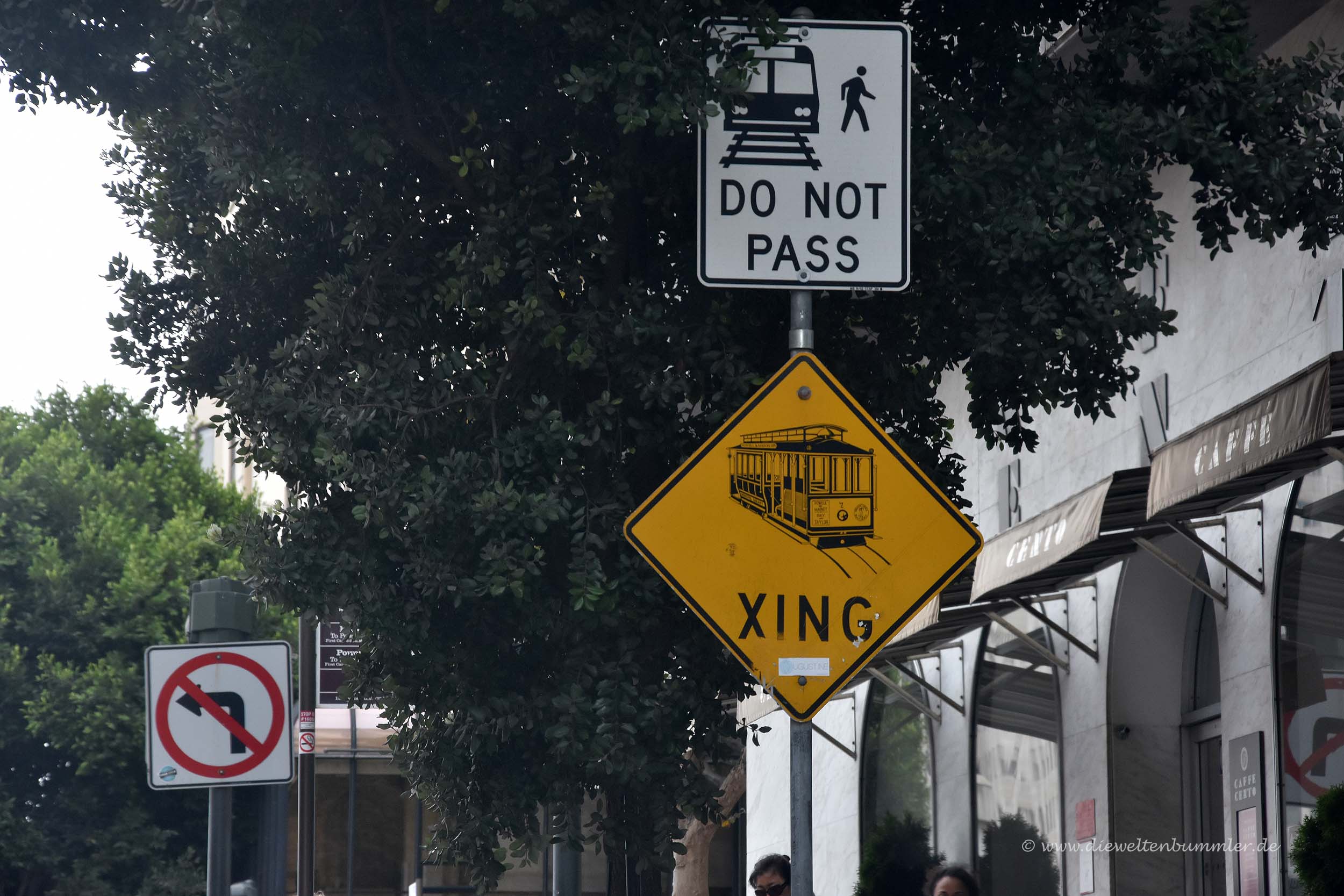 Aber gleich einen Block weiter fanden wir eine weitere Parklücke, quetschten uns hinein und bezahlten diese. Auf der Straße gingen wir hinab und beäugten die Cablecar-Straßenbahn. Gerne wollten wir auch damit ein Stück fahren. Immerhin hatten wir schon die Straßenbahn auf der Isle of Man erlebt, genauso wie die dortige Pferdestraßenbahn und die Kirnitzschtalbahn. Einige Zeit schauten wir uns an, wie und wo die Straßenbahn hält, wie man am besten einsteigt und wollten es dann den anderen Passagieren nachmachen. Es reichte uns eigentlich, wenn wir nur eine Haltestelle fahren würden, denn dort stand unser Auto. Wir hatten nicht vor, die gesamte Straßenbahnlinie abzufahren.