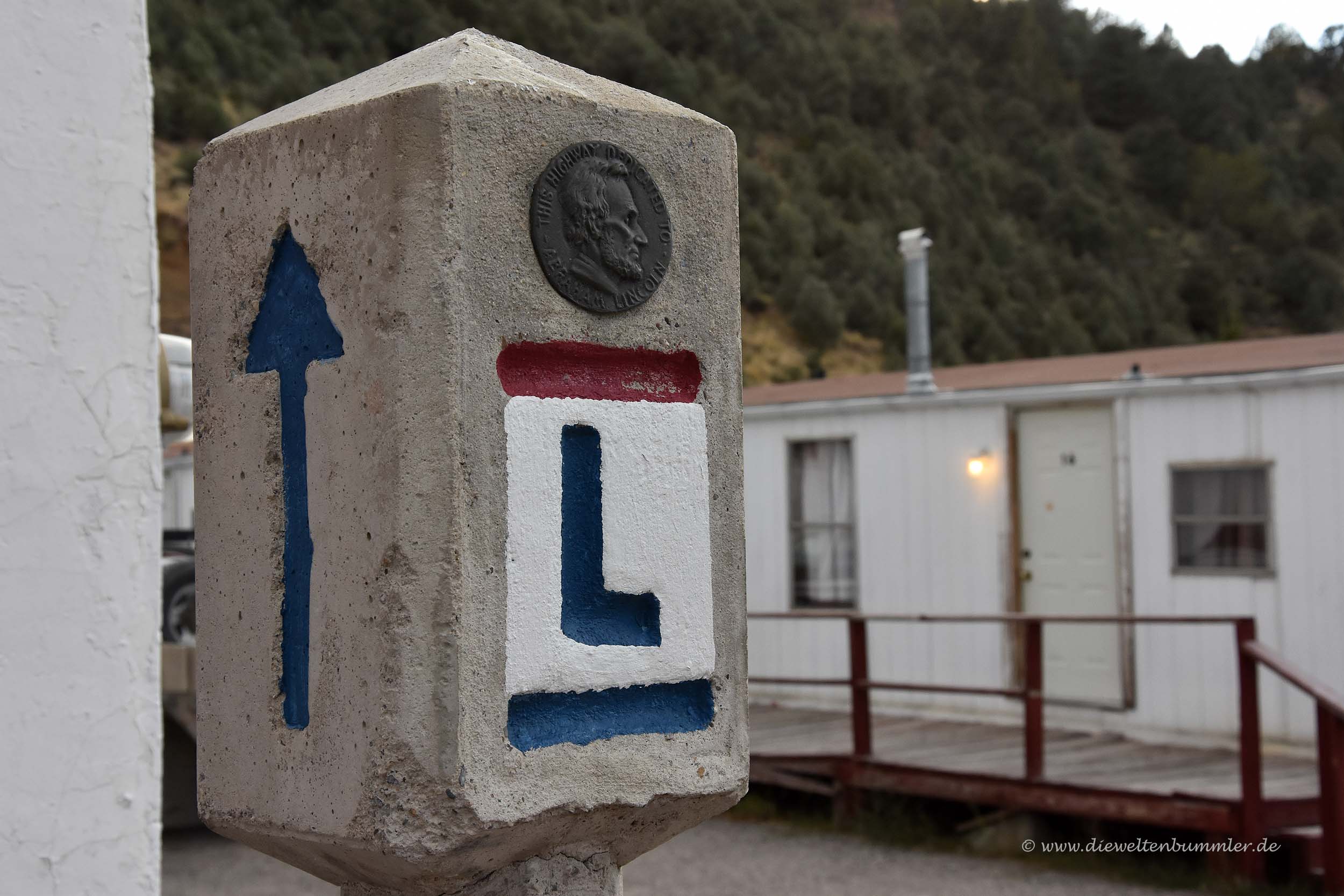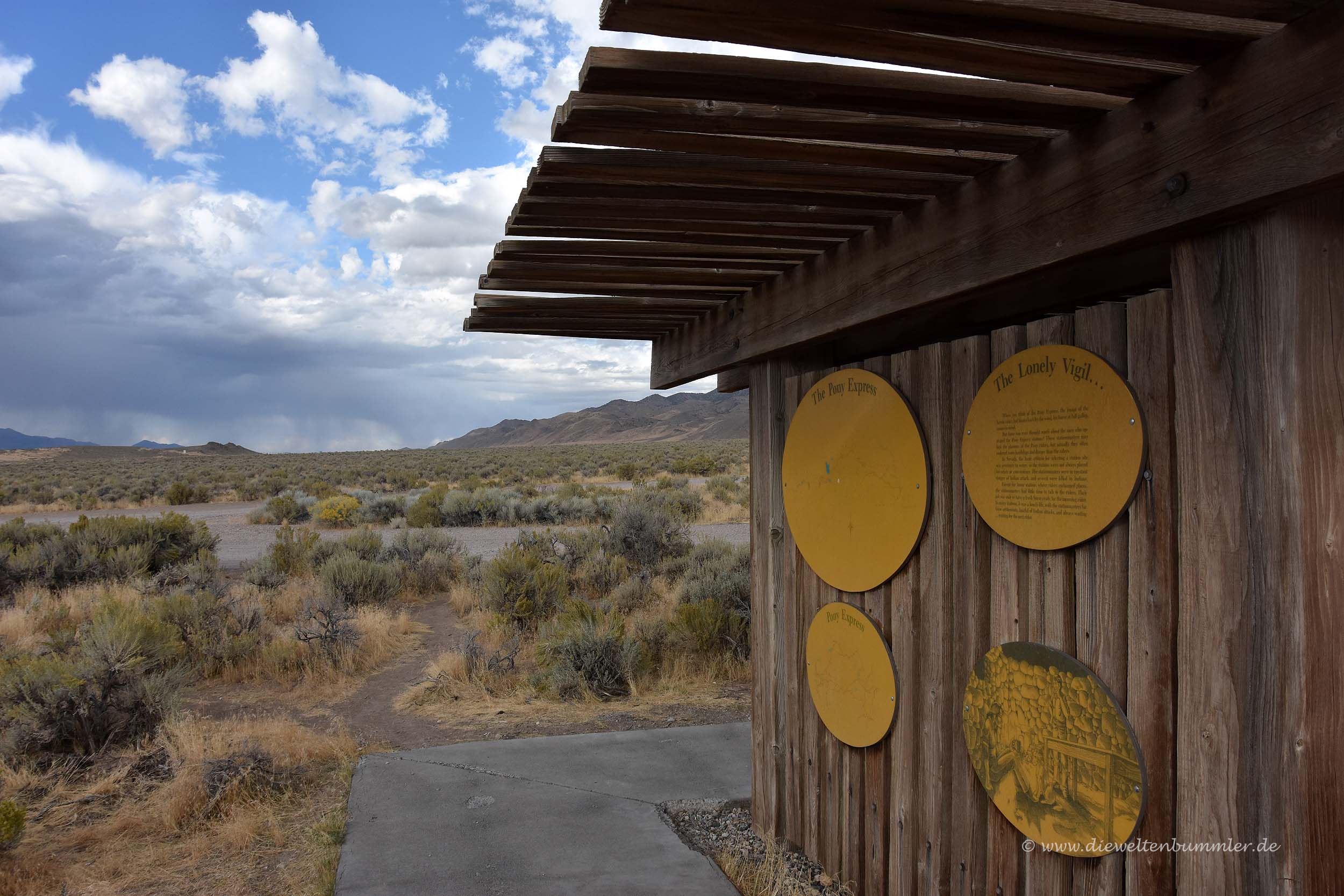 Unseren nächsten Stopp legten wir an einer Holzhütte ein. Sie erinnerte an den Pony Express, der von 1860 bis 1861 auf dieser Route unterwegs war. Nachrichten wurden auf dem Pony Express übermittelt, in dem die Reiter von einer Station zur nächsten Station ritten, um dort ein frisches Pferd übernehmen zu können. Das Thema fand ich ziemlich interessant und es waren auch noch originale Reitwege und Gebäudeteile erhalten geblieben. Doch mit dem Aufkommen der Telegraphie verschwand der Pony Express bereits nach eineinhalb Jahren wieder. Interessant fand ich dabei, dass die Reiter immer ein wenig glorifiziert werden. Doch die eigentlichen Helden waren diejenigen, die sich in den Stationen um die Pferde kümmerten. Denn diese Menschen waren oft tagelang alleine ohne jeglichen Kontakt zu anderen Menschen, außer zu den Indianern, deren Angriffe ganz nebenbei auch noch abgewehrt werden mussten. Es war also auch für die Leute in den Poststationen ganz sicher keine leichte Arbeit.