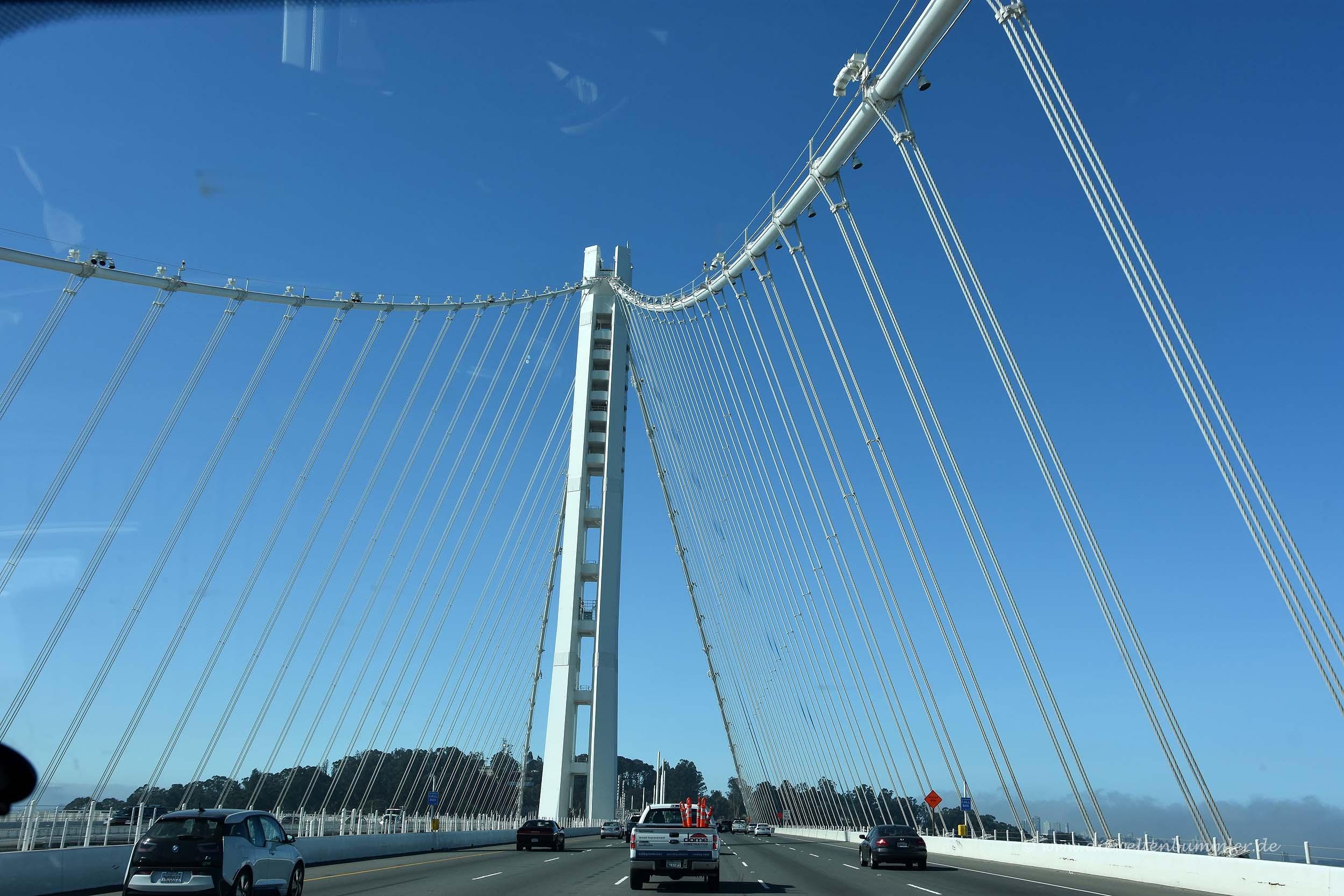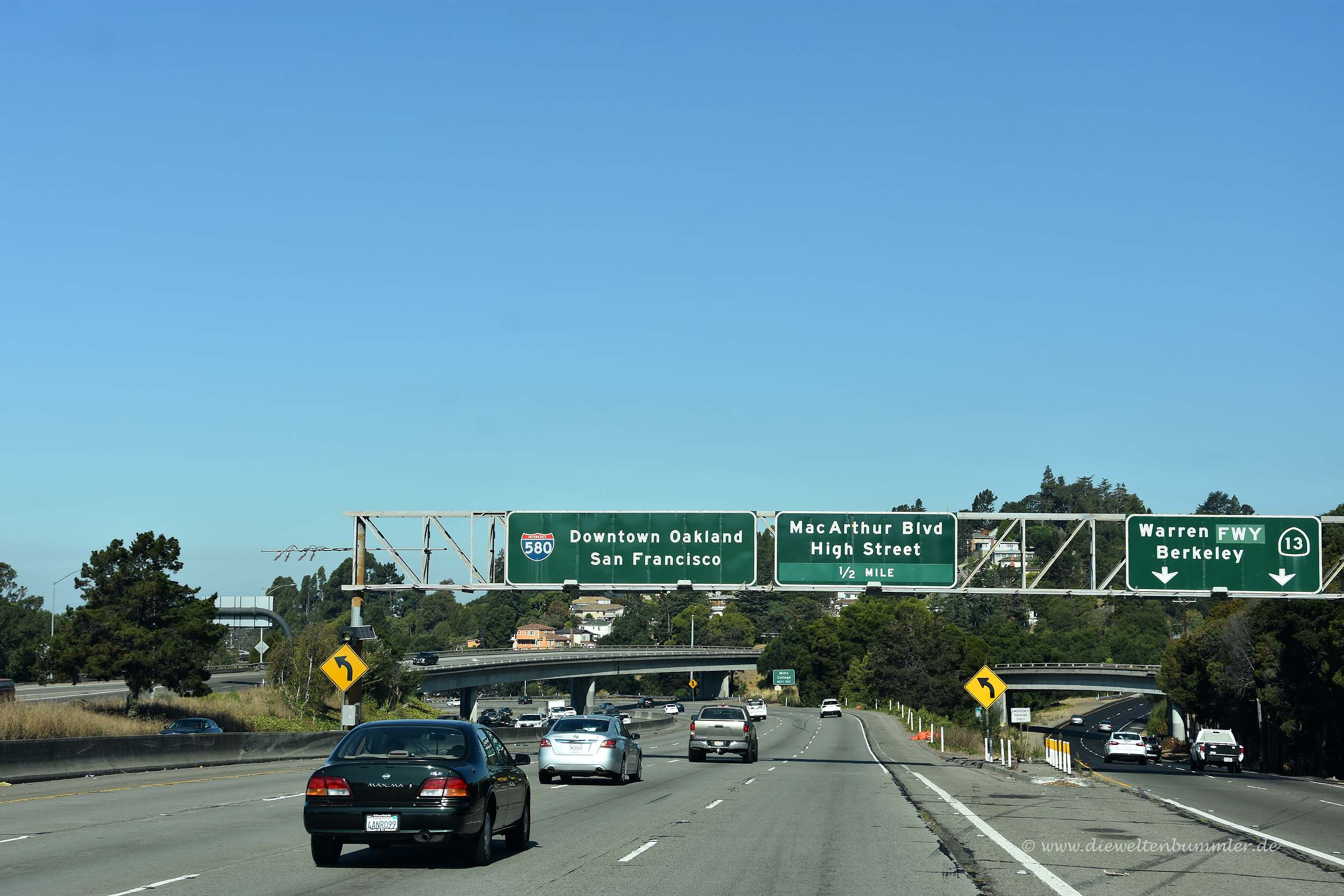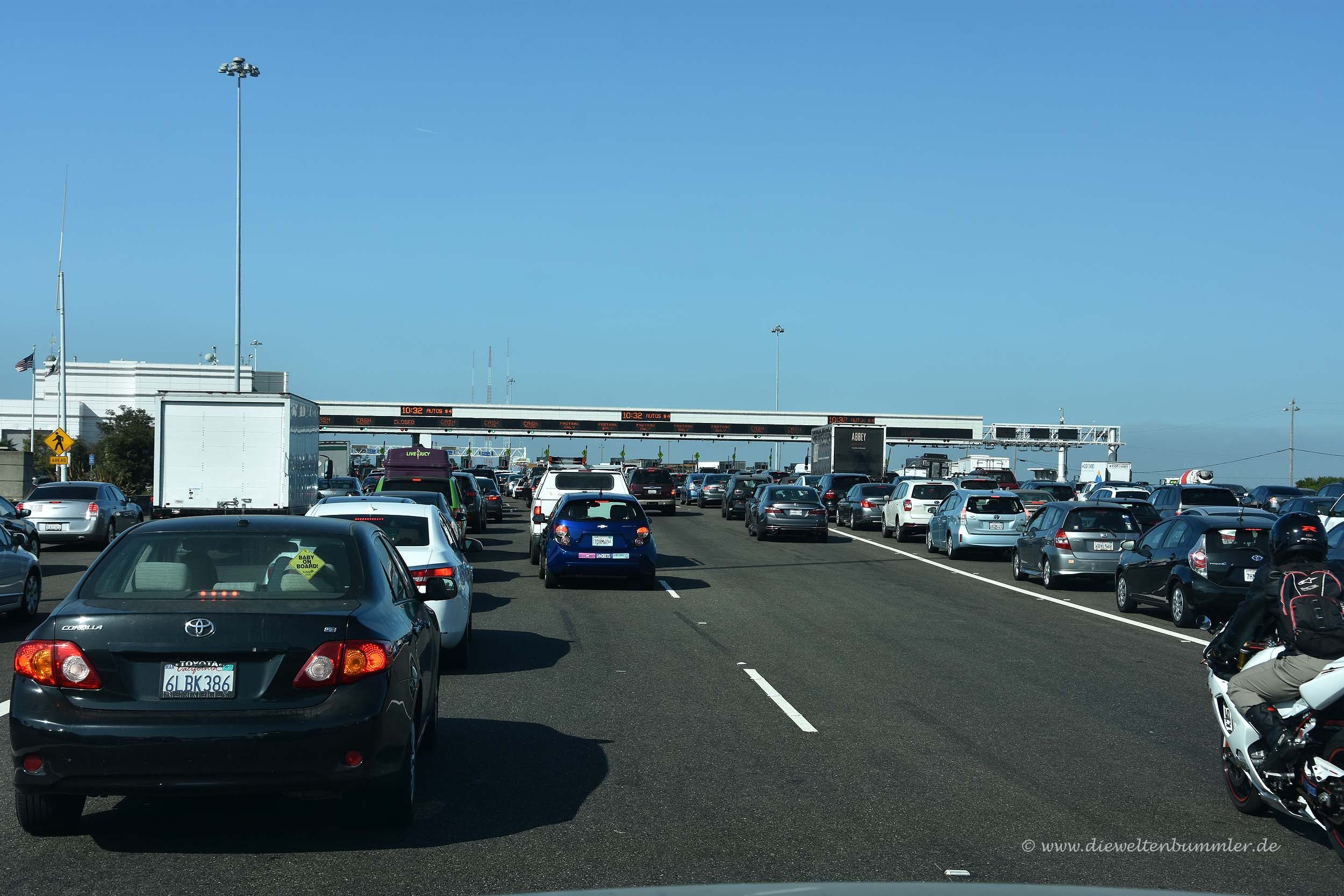 Der Plan funktionierte ganz gut. Wir kamen zwar nicht ganz so gut durch den Verkehr und sind auch nicht schon um acht Uhr unterwegs gewesen, doch um halb elf waren wir mal wieder auf der Interstate 80 und standen an der Mautstation der Bay Bridge, die sich zwischen San Francisco und Oakland befindet. Auf 16 Spuren konnte man sich den Mauthäuschen nähern, was trotzdem ein paar Minuten dauerte. Danach überquerten wir die Bucht von San Francisco und hatten schon einen interessanten Blick auf die Skyline der Stadt und konnten auch die Gefängnisinsel Alcatraz erkennen.