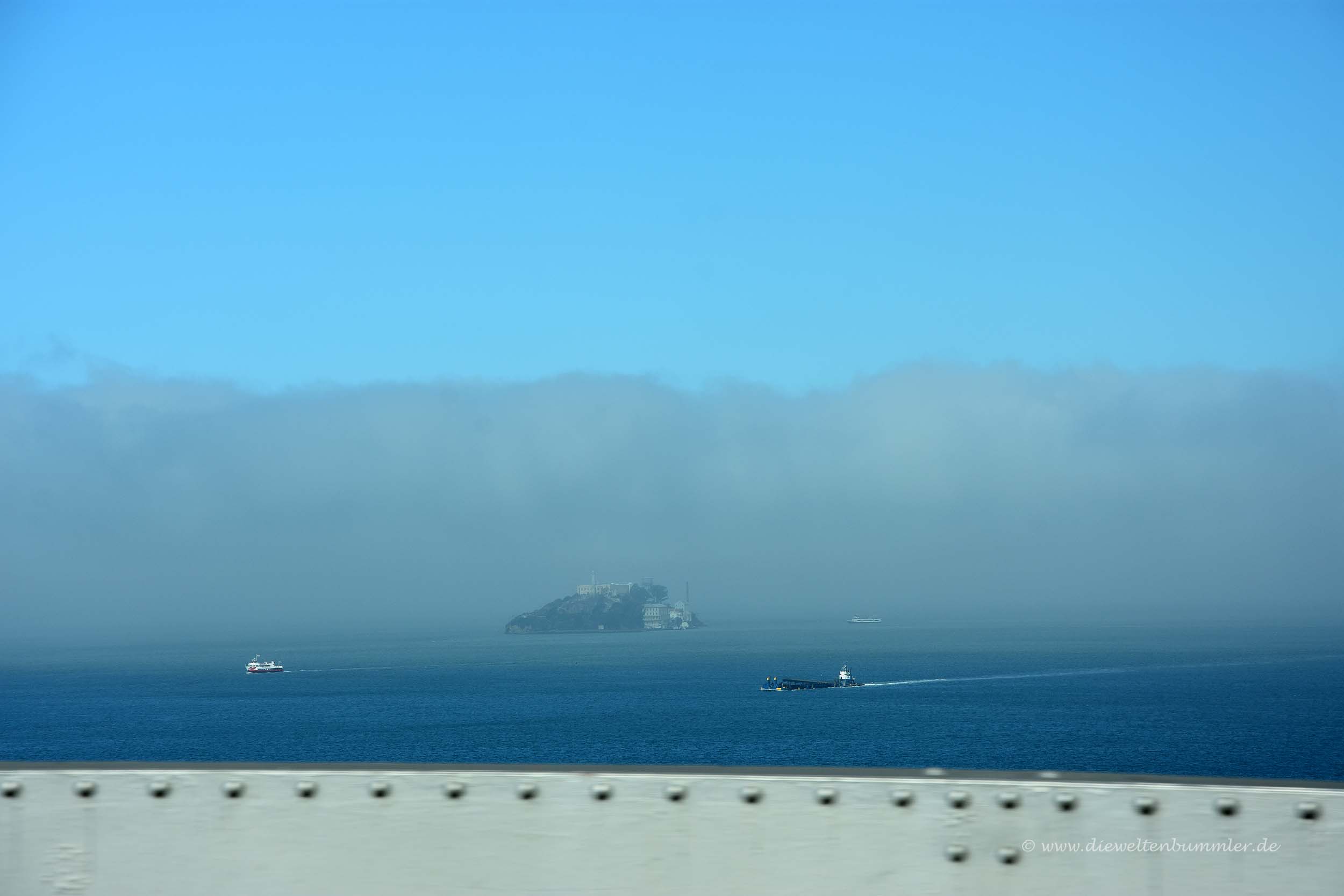 Doch schon mit Alcatraz wurde es schwieriger, denn sie war nur schemenhaft durch Nebel zu erahnen. Während über uns blauer Himmel und bestes Wetter herrschte, war am Horizont hinter der Skyline eine große Nebelwand zu erkennen. Das war zwar ein ziemlich interessanter Anblick, aber wir ahnten schon, was das bedeuten würde.