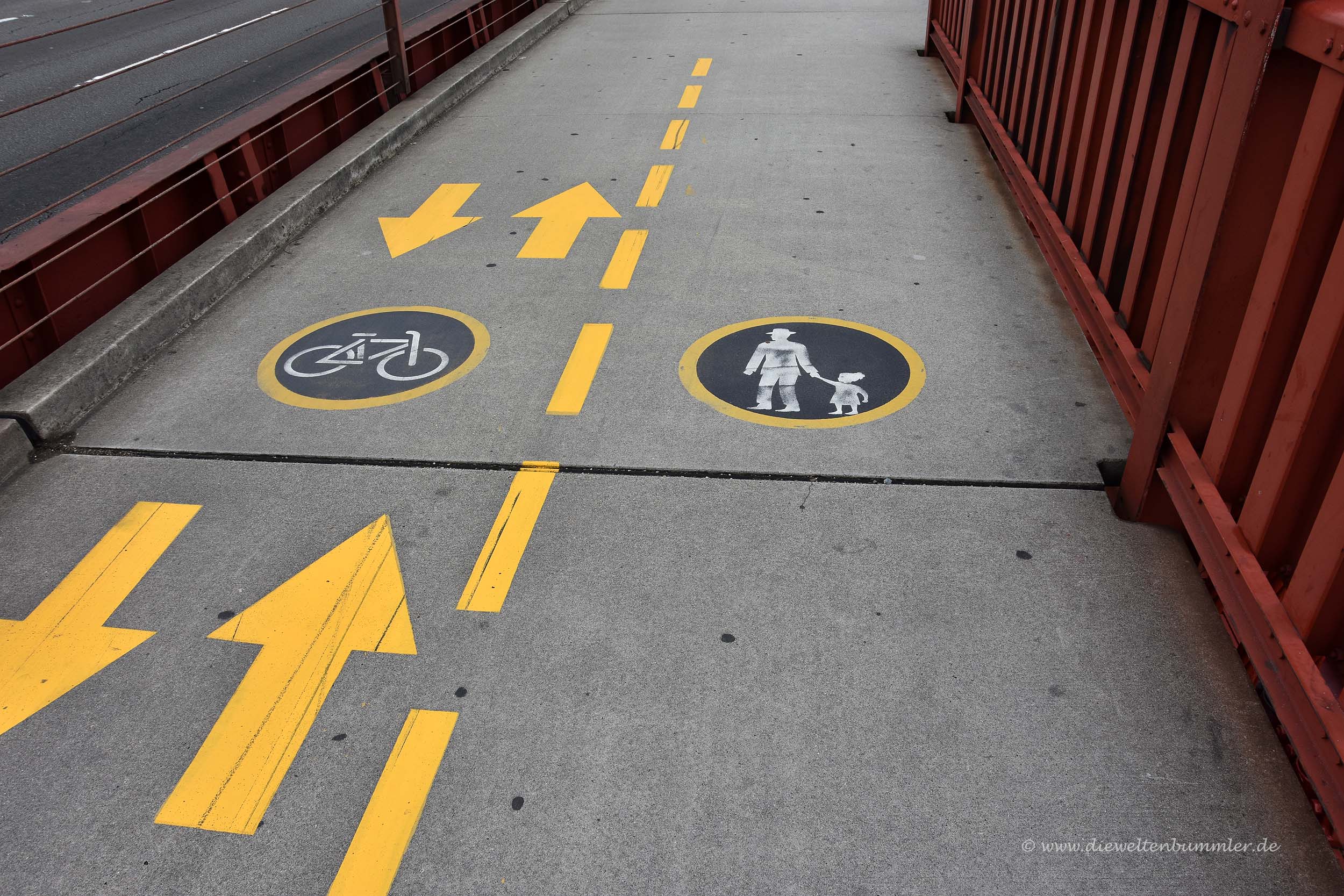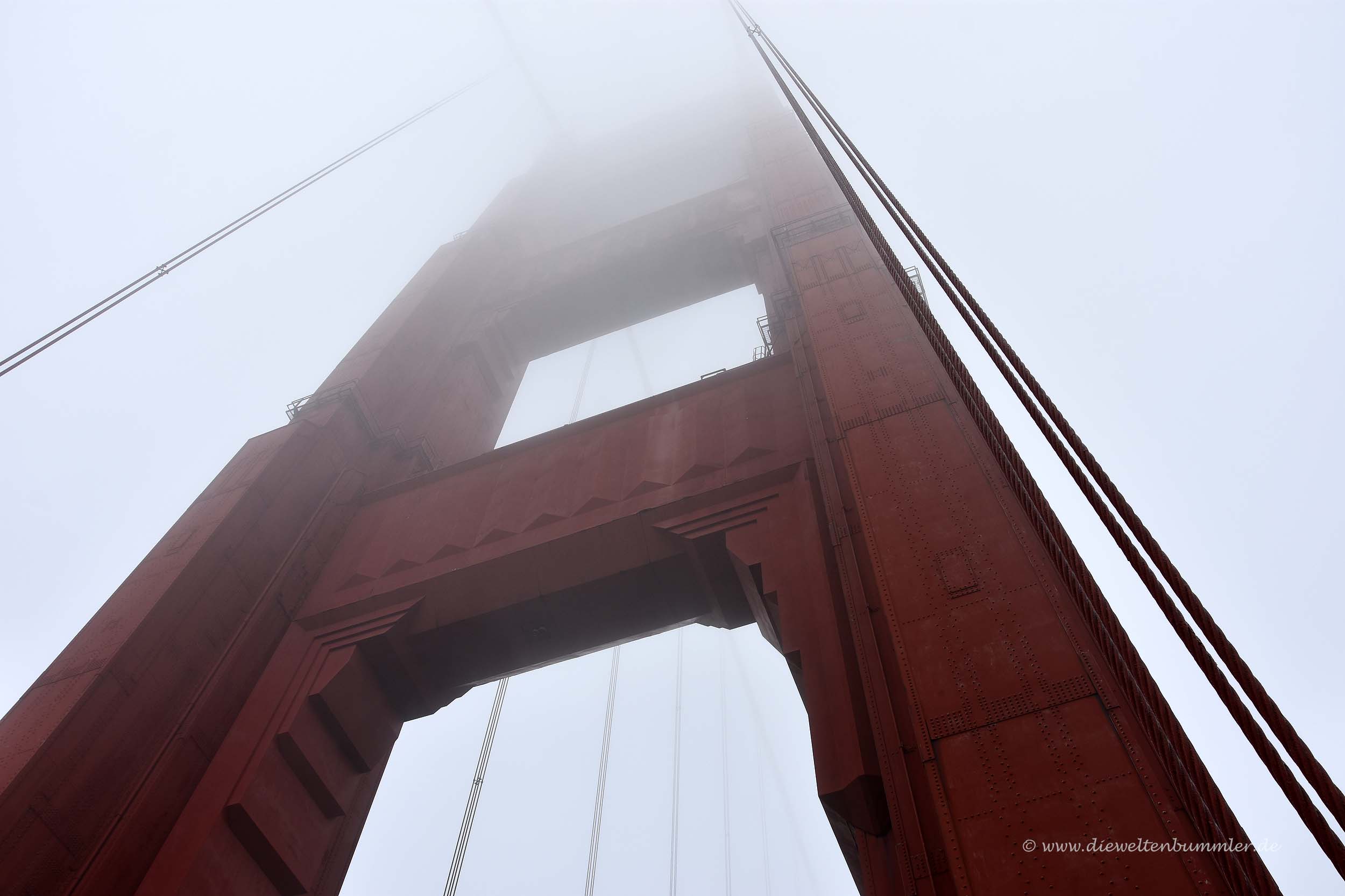 Es war so nebelig, dass man gerade einmal den unteren Teil des ersten Brückenpfeilers sehen konnte. Das war natürlich schade, aber eine Tatsache, mit der wir ebenfalls rechnen mussten. Kurios war eben nur die Tatsache, dass es in Downtown keinen Nebel gab, obwohl es gerade einmal fünf Kilometer Luftlinie sind.