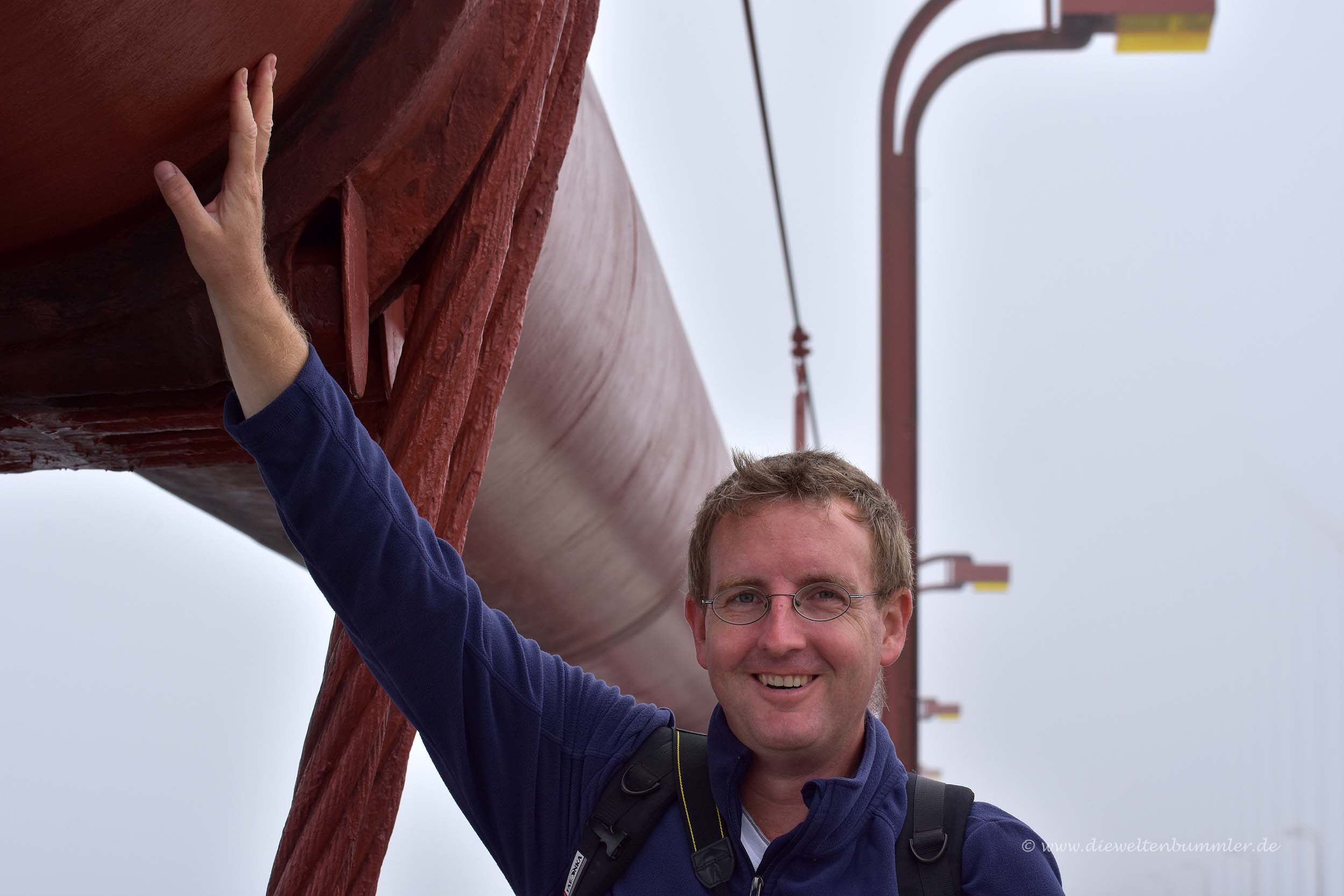 Nachdem wir den Kolibri ausgiebig auf die Speicherkarte bannten, machten wir uns daran, die Brücke zu überqueren. Verdammt laut war es durch den Verkehr und interessanterweise hatte die Brücke auch ein Nebelhorn für den Schiffsverkehr. Außerdem war es ziemlich kalt. Ich war heilfroh, dass ich noch einen leichten Pulli im Auto hatte. Von wegen in Kalifornien ist es immer warm. Die Leute um uns herum liefen in dicken Jacken umher. Zusammen mit dem Nebel war es richtig herbstlich.