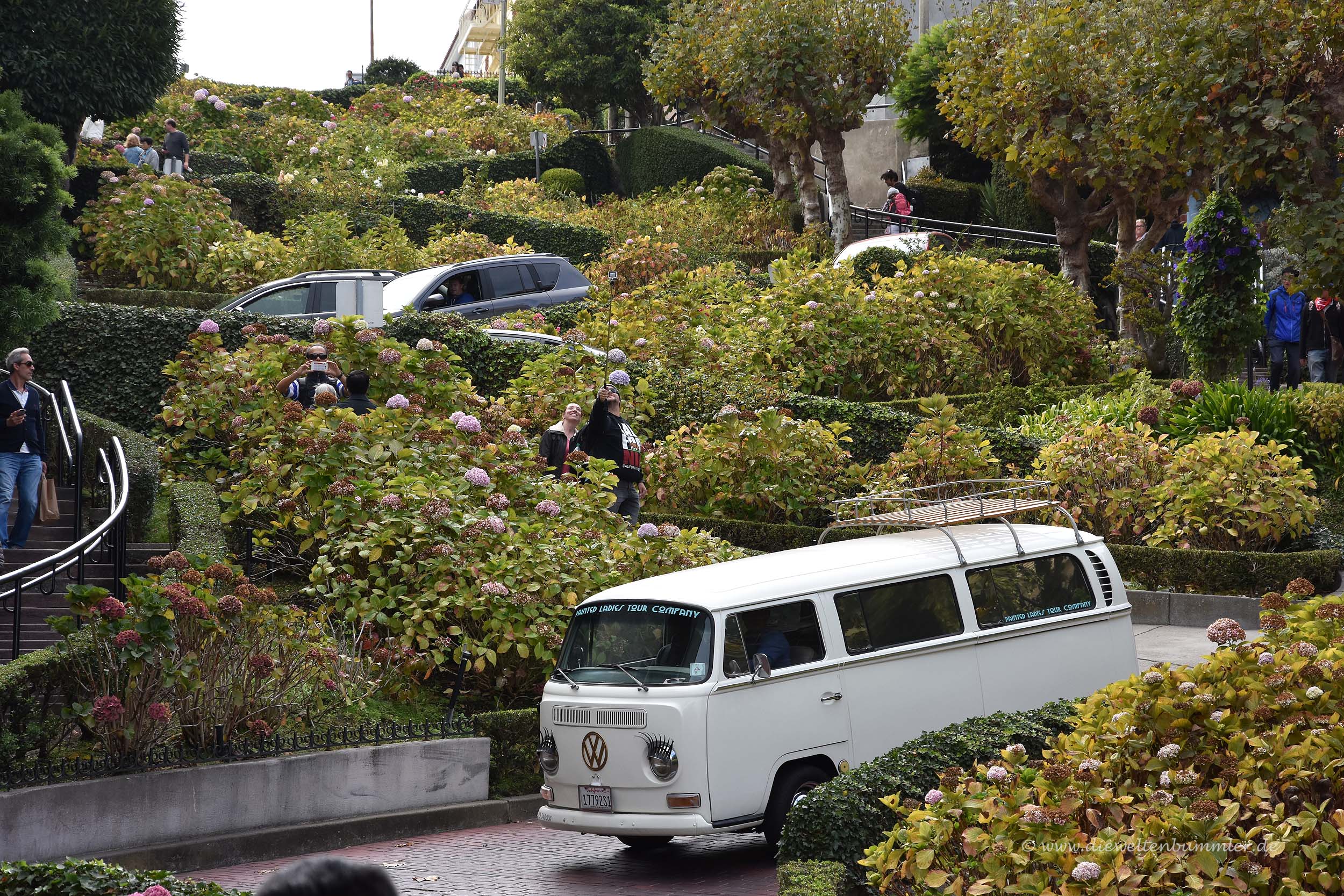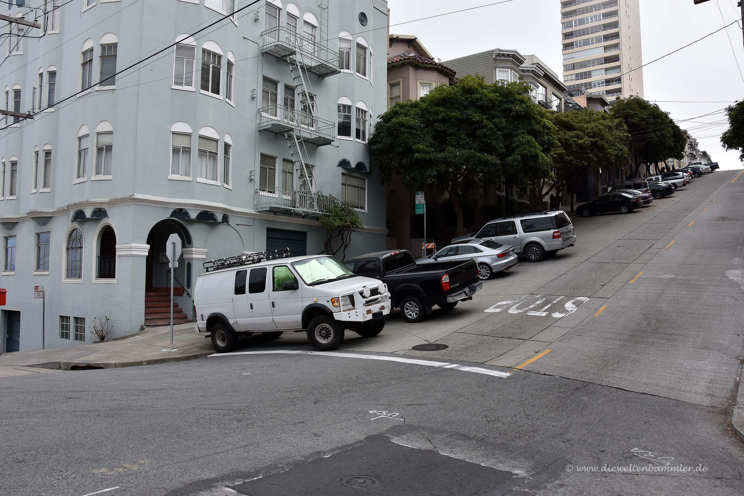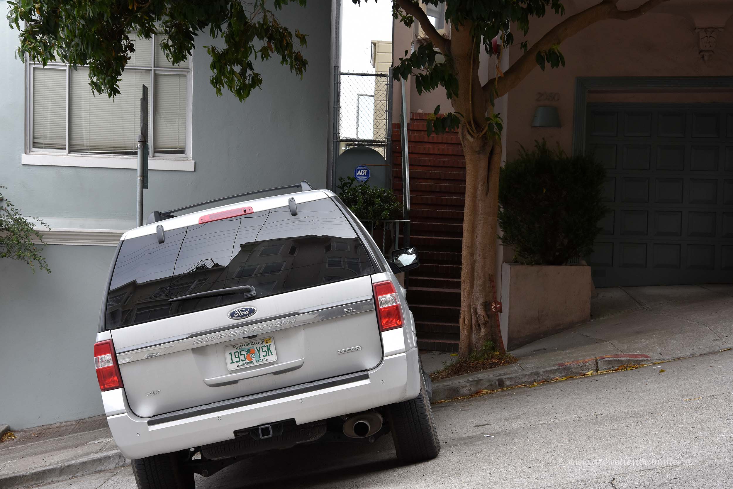 Anschließend machten wir Bilder von anderen Touristen, die ebenfalls die Straße hinab fuhren und spazierten die Lombard Street auch mal zu Fuß hinauf. Es war schon recht interessant, aber irgendwie auch kurios. Außerdem machten wir natürlich auch zahlreiche Bilder von parkenden Fahrzeugen, die extrem schräg an den Straßenrändern von San Francisco standen.