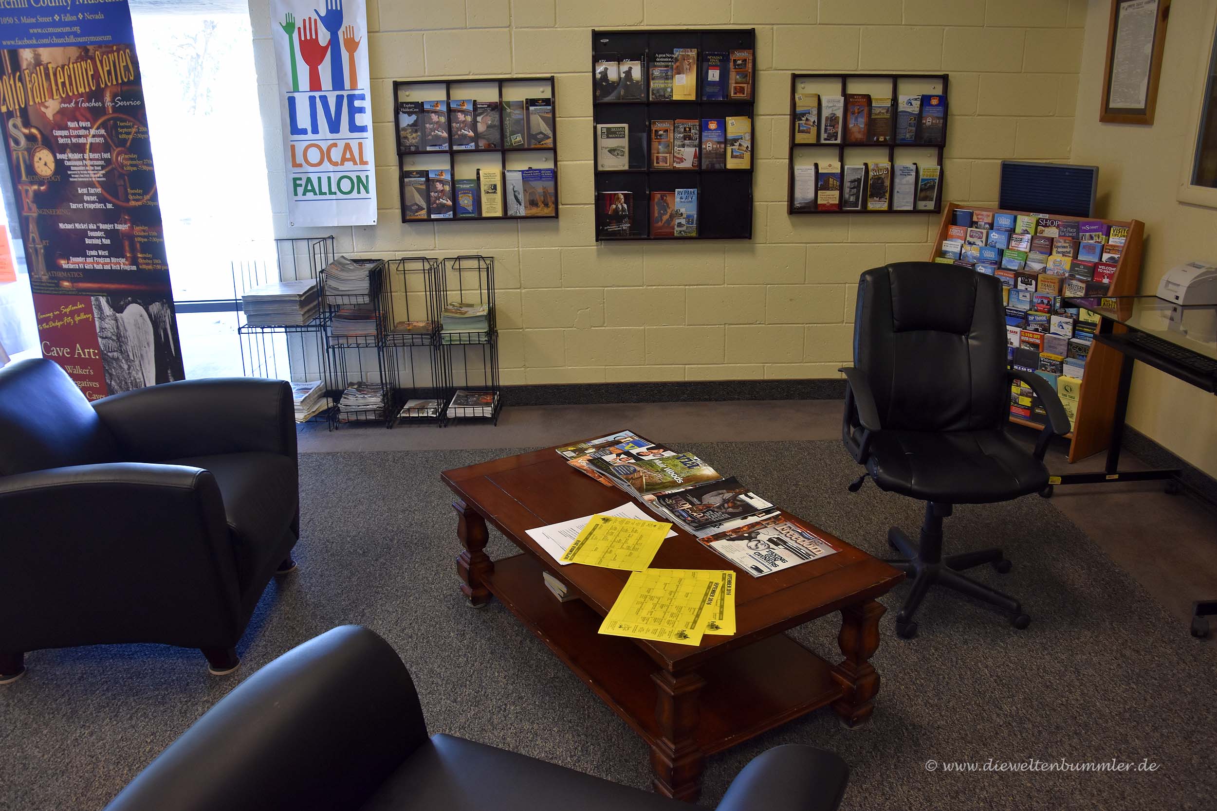 Ja, die Straße war wirklich recht ruhig, aber ob es nun der einsamste Highway der USA war, will ich mal so dahingestellt lassen. In Fallon steuerten wir direkt das Tourismusbüro an und wunderten uns angesichts des Ortes, dass es hier überhaupt eine Tourismusinformation gab. Ein großes Hinweisschild auf den Highway 50 versprach uns, dass wir hier richtig seien. Im Inneren gab es eine Sitzgruppe in einer Ecke, wo man sich mit Tee und Kaffee verköstigen konnte und es einige Informationen über die Region gab.