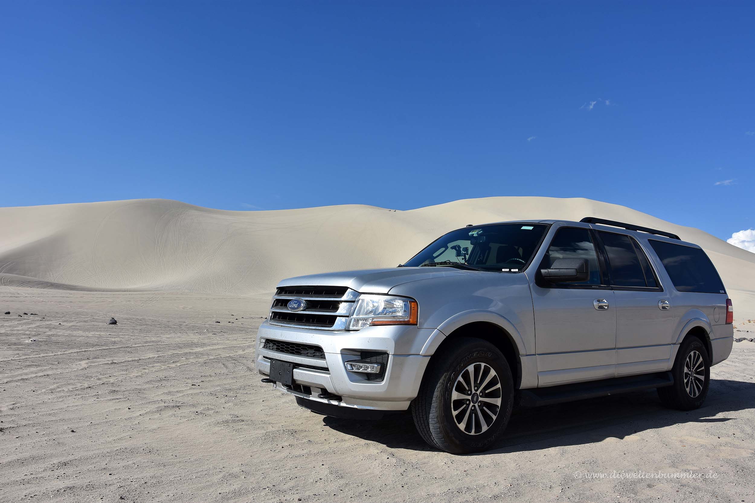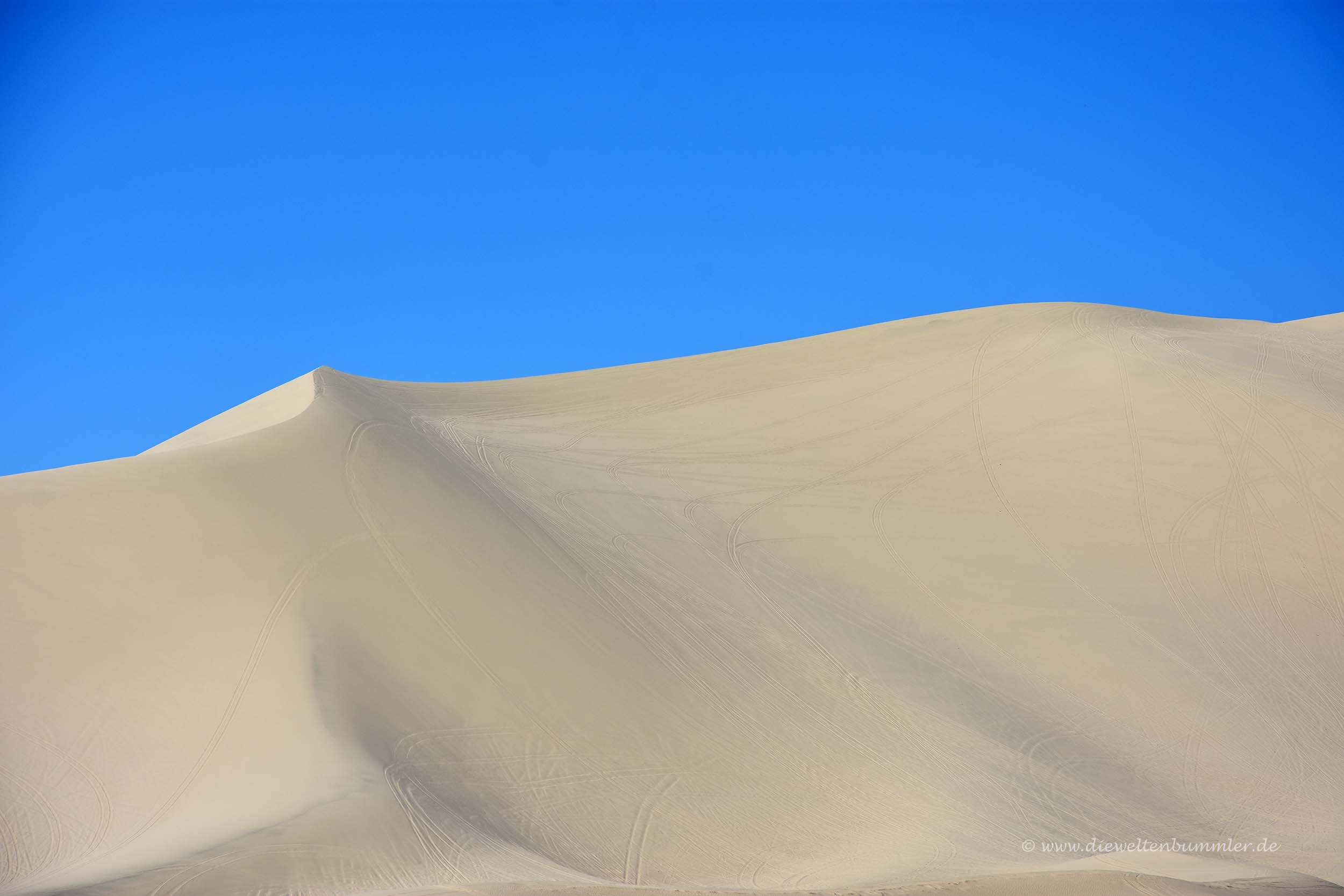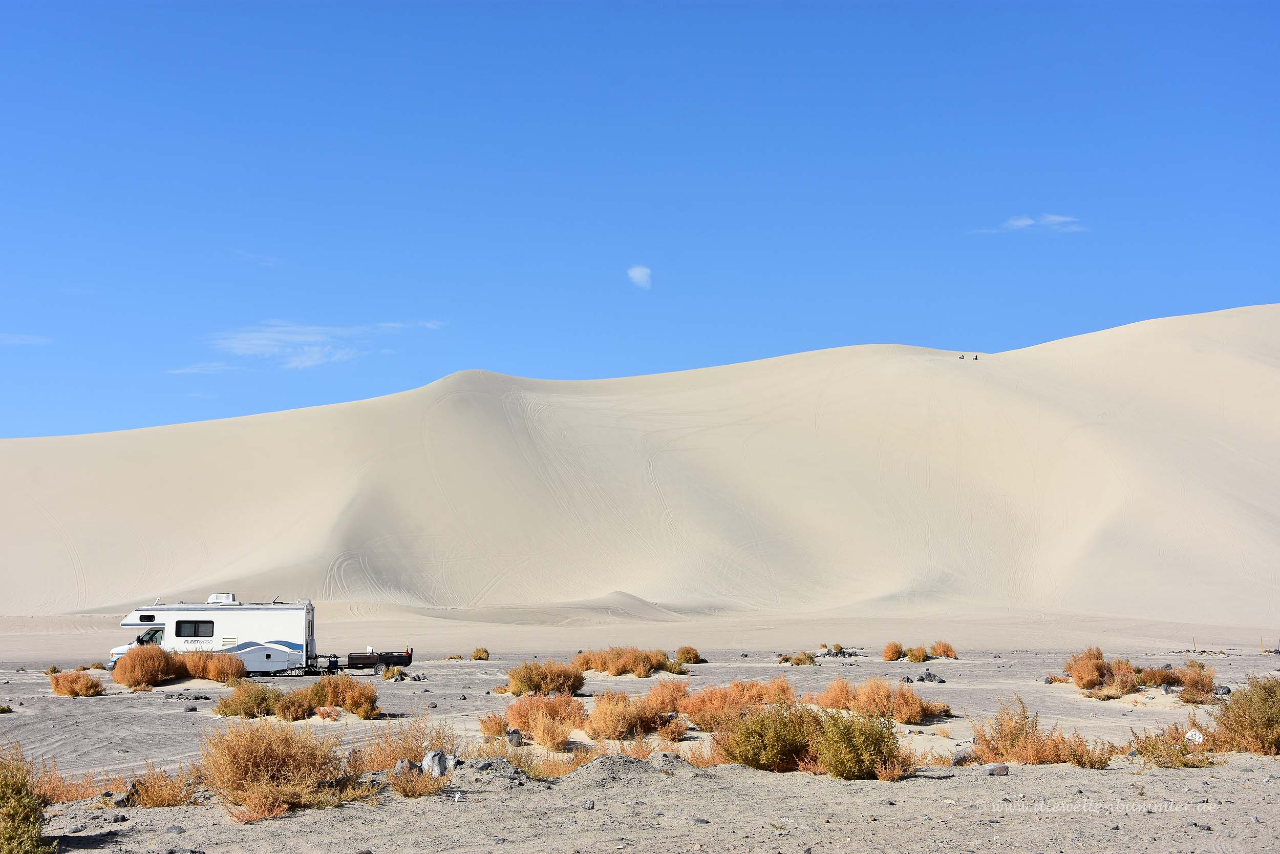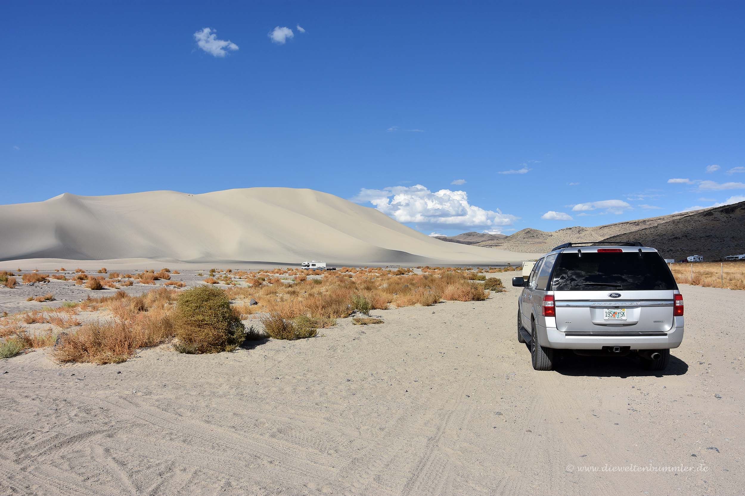 Und wieder einmal hatten die Amerikaner es geschafft, die Europäer in einem Größenverhältnis zu übertrumpfen. Die Düne ist 180 Meter hoch und fast drei Kilometer lang, womit sie höher und größer ist als die berühmte Dune du Pilat in Frankreich. Und dabei steht sie einfach irgendwo hier in der Wüste rum und ist völlig unbekannt. Mal wieder faszinierend.