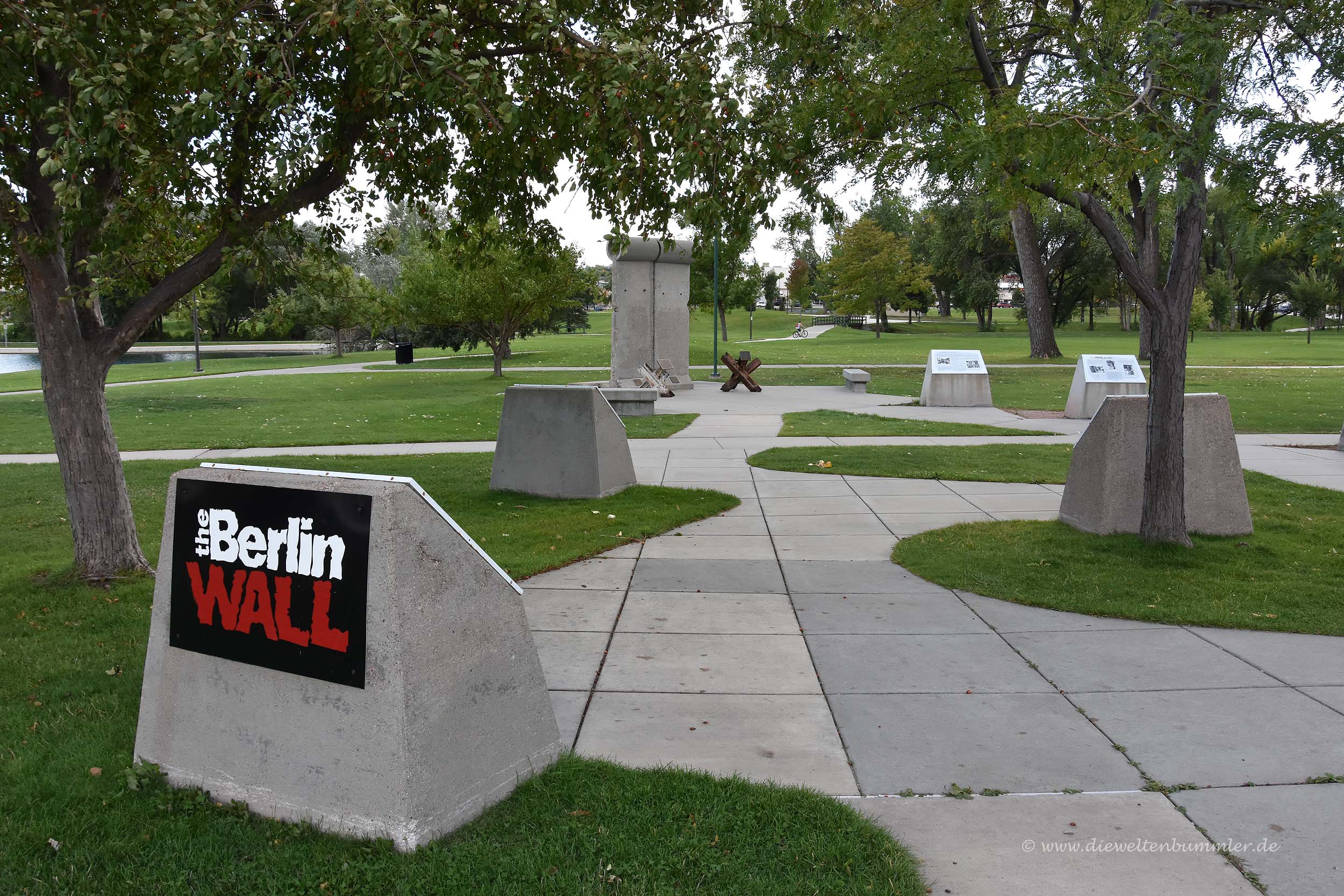 Am frühen Abend erreichten wir dann Rapid City, wo wir bisher noch keine Übernachtungsmöglichkeit online ausfindig machen konnten, die uns, unserem Geldbeutel und unseren Wünschen entsprach. Als ich linker Hand eine Art Touristeninformation sah, steuerte ich den Wagen zu einem Parkplatz. Aus der Touristeninformation wurde nichts, aber was wir sahen, war auch interessant. In einem kleinen Park am Rapid Creek gab es eine Kunstinstallation, die die Geschichte der Berliner Mauer beschrieb. Von der Teilung Deutschlands bis hin zur Wiedervereinigung inklusive einem originalen Stück Berliner Mauer war hier die Historie ausführlich dargestellt. Der Hintergrund dazu war, dass Rapid City Partnerstadt von Potsdam ist. Gut, ob Potsdam oder Berlin, für Amerikaner ist das ohnehin egal. Die merken den Unterschied vermutlich gar nicht.