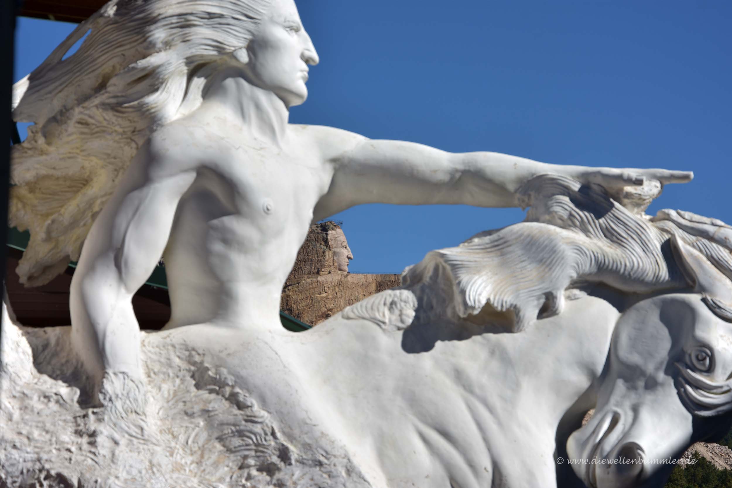 Das Crazy Horse Memorial ist sozusagen das indigene Gegenstück zum Mount Rushmore und bereits seit 1948 in Bau. Es wird auch noch sehr lange dauern, bis diese Monumentalskulptur fertiggestellt sein wird. Komplett ohne staatliche Unterstützung lebt die Fertigstellung von den Eintrittsgeldern und dem Verkauf von Andenken und Indianerschmuck. Doch das große Besucherzentrum hat es auch in sich und bietet allerlei interessante Eindrücke.