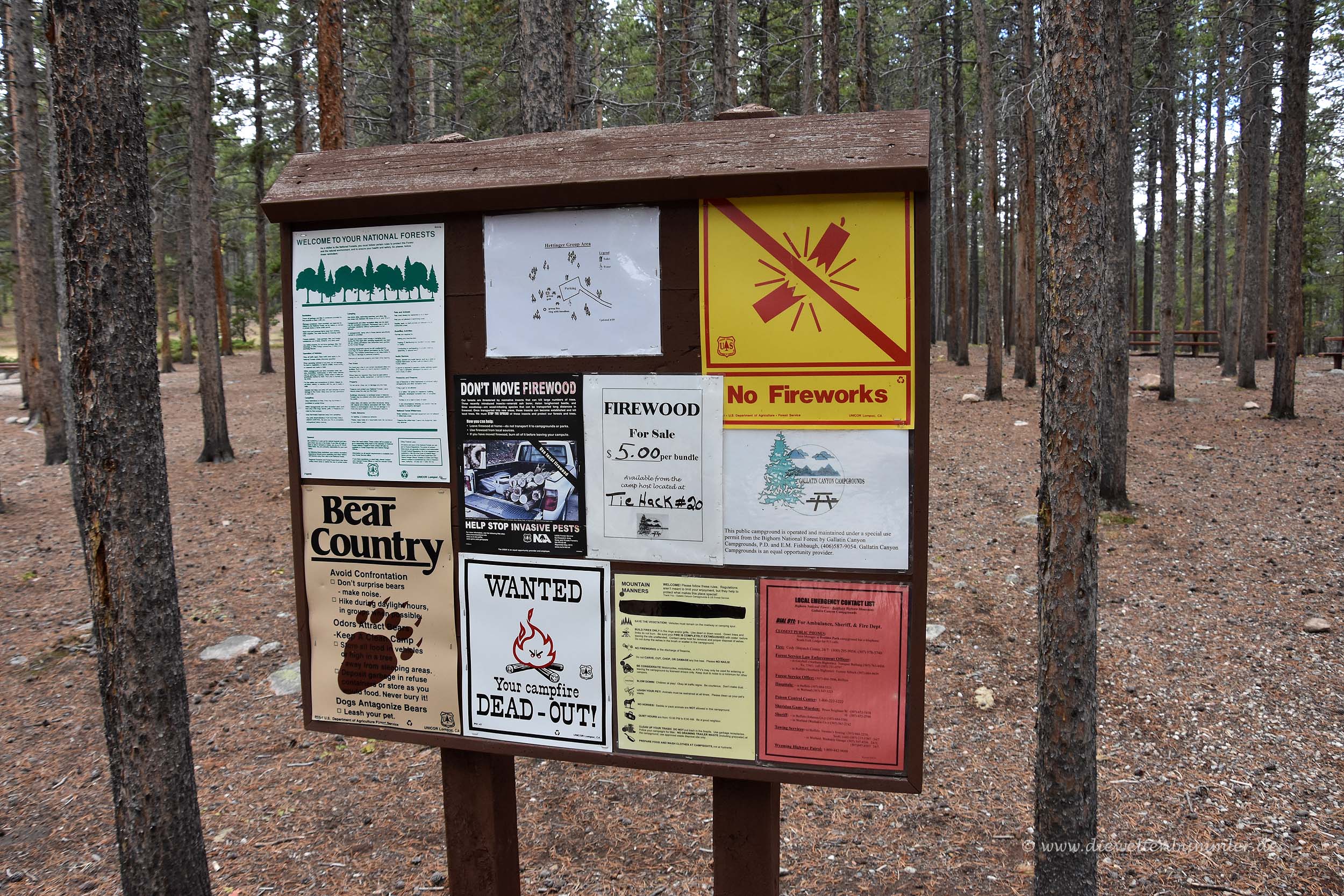 Wir folgten der Straße weiter nach Westen bis zum östlichen Eingang des Yellowstone-Nationalparks. Dort zeigten wir unsere Jahreskarte vor, bekamen ein Prospekt und konnten direkt weiter fahren. Gleichzeitig wurde das Wetter aber derart schlecht und es begann sehr stark zu regnen, dass wir über die Sinnhaftigkeit dieser Fahrt nachdachten. Im Nationalpark gab es keine geeigneten Übernachtungsmöglichkeiten für uns und bei so einem starken Regen wollten wir uns den Park auch nicht unbedingt anschauen.