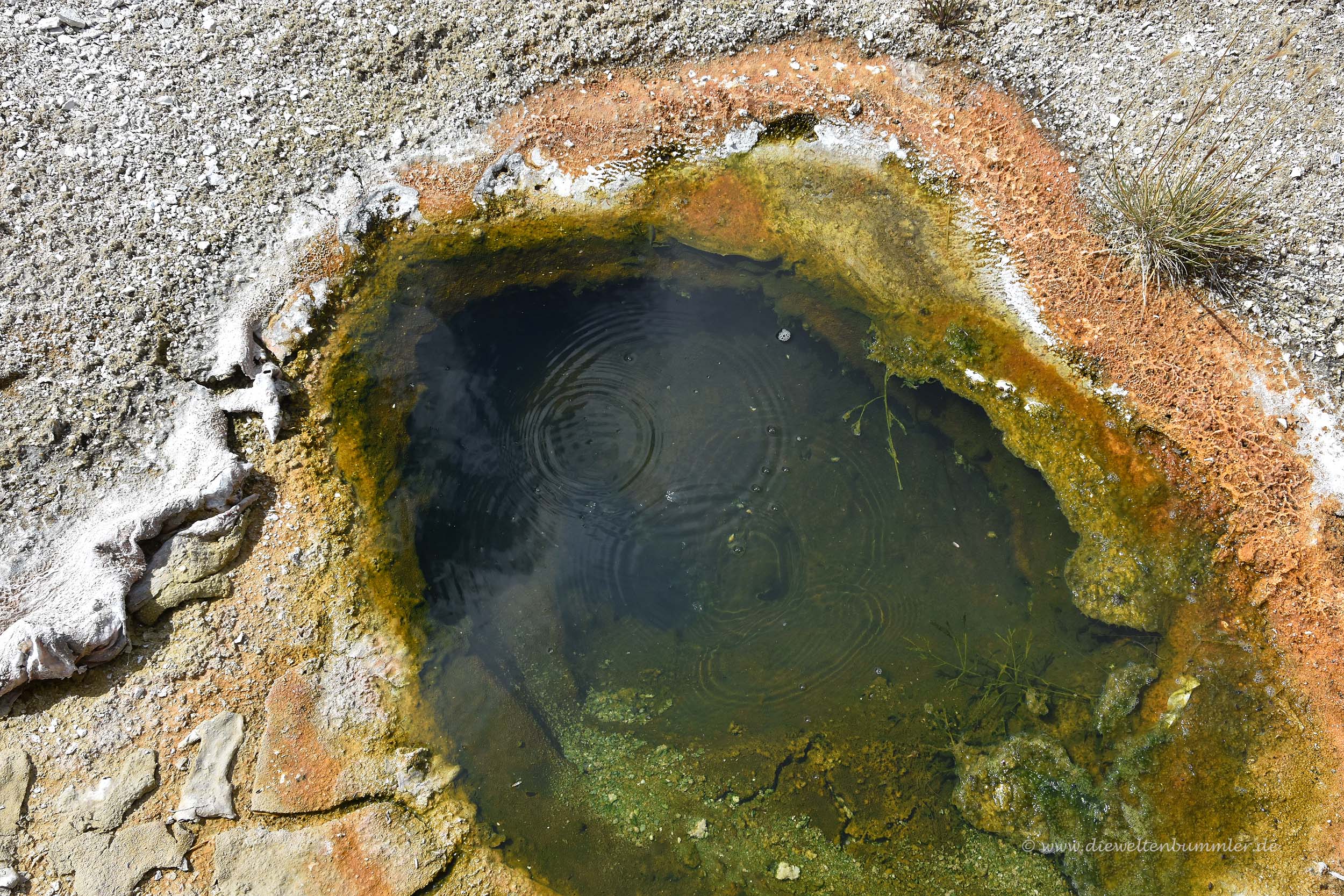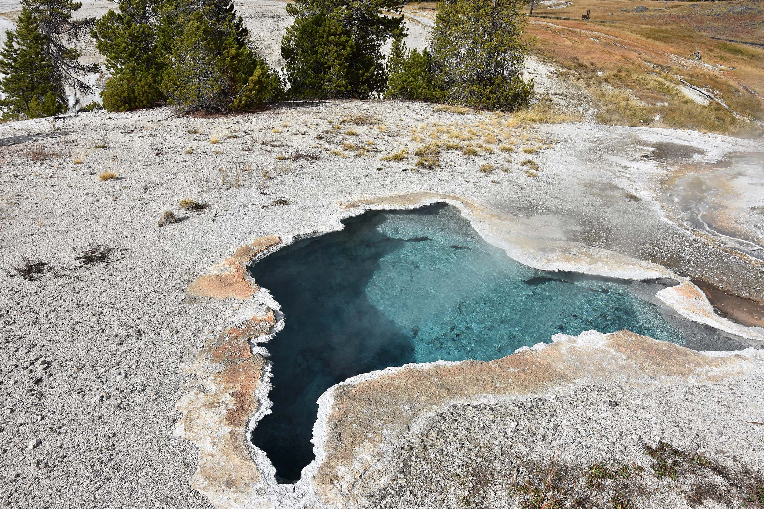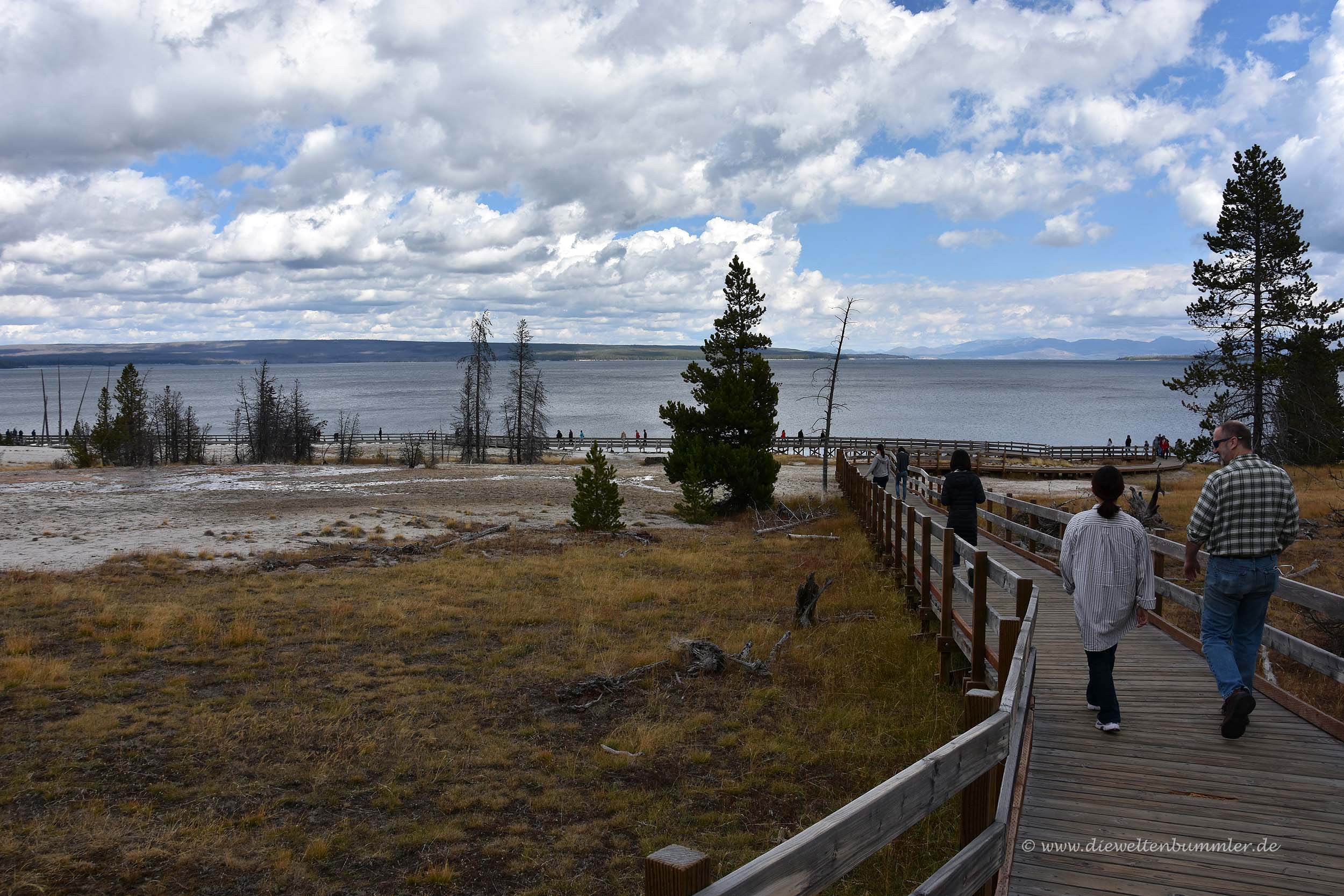 Wir sahen, dass man auf eine bewaldete Anhöhe hinter dem See stehen müsste, um von dort einen schönen Überblick auf das Wasserloch zu erhalten. Aber wir erkannten dort keine Menschen zwischen den Bäumen und vermuteten, dass es dann dort auch keinen entsprechenden Wanderweg geben würde. Leider hatten wir im gesamten Yellowstone-Nationalpark auch keinen Handy-Empfang und so konnten wir auch nicht mal eben bei Googlemaps nachschauen. Denn dann hätten wir gesehen, dass es dort sehr wohl einen Weg gibt. Dieser ist von einem ganz anderen Parkplatz aus zu erreichen und deutlich länger. Aber das hätten wir gerne gemacht.