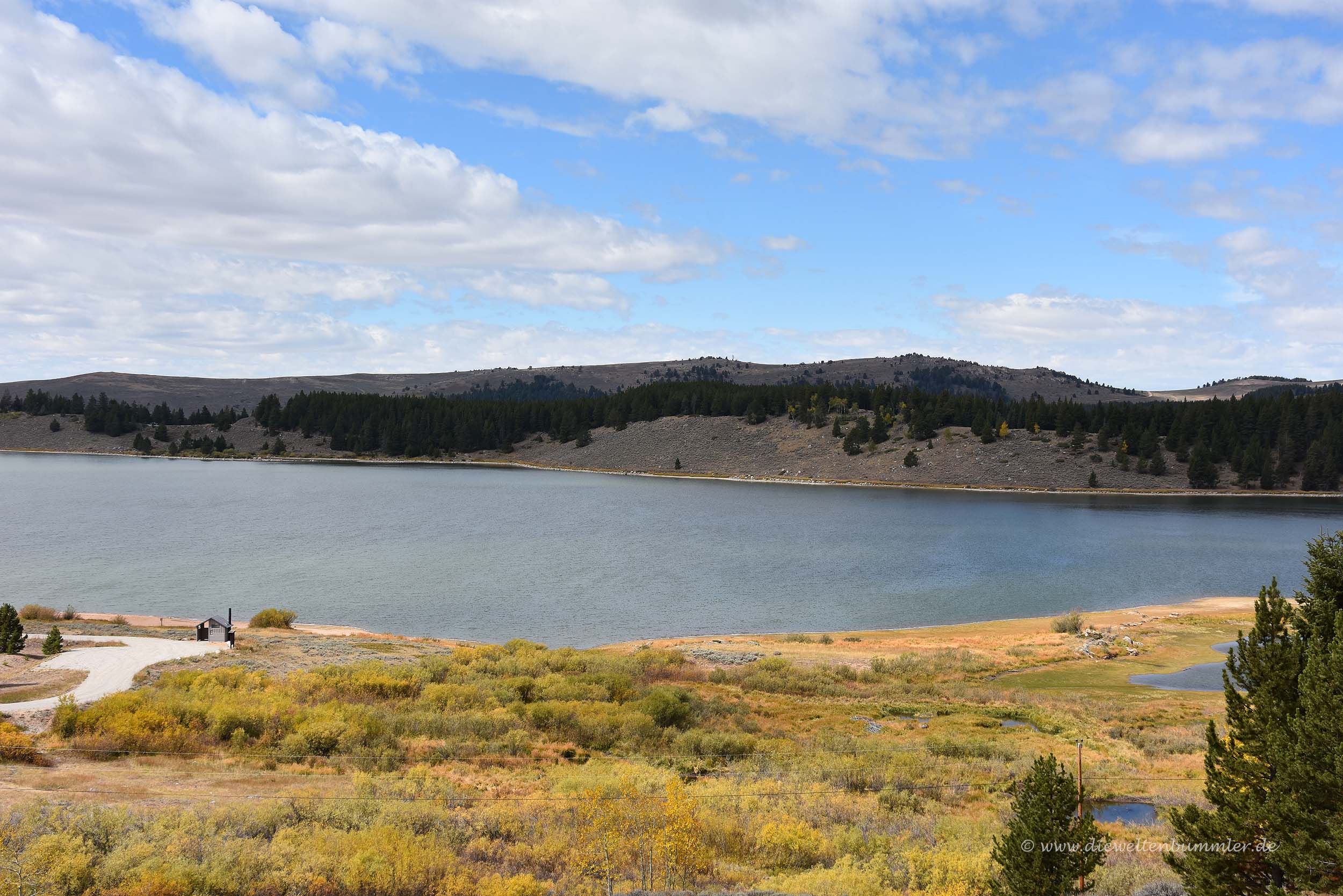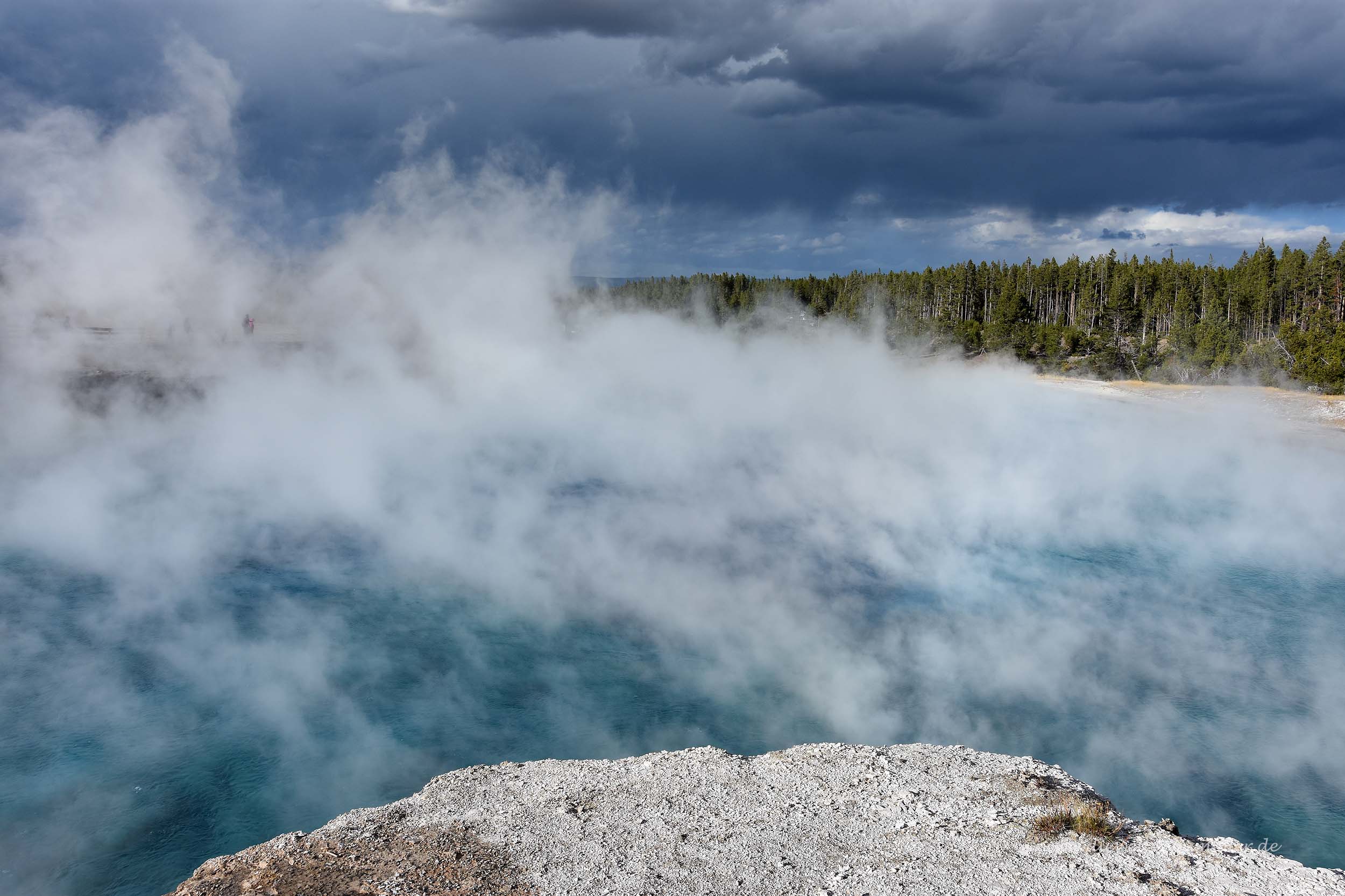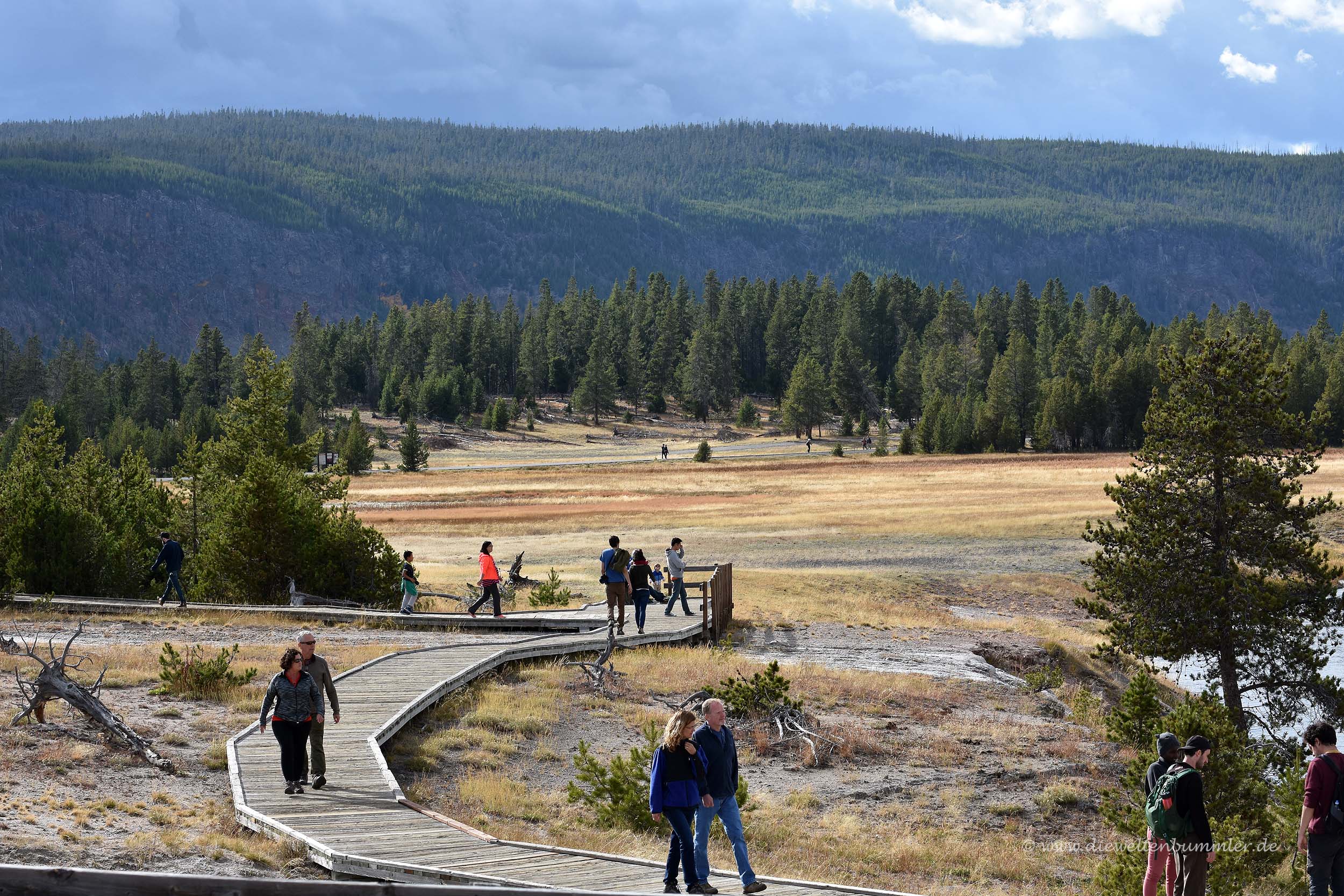 Wir sahen, dass man auf eine bewaldete Anhöhe hinter dem See stehen müsste, um von dort einen schönen Überblick auf das Wasserloch zu erhalten. Aber wir erkannten dort keine Menschen zwischen den Bäumen und vermuteten, dass es dann dort auch keinen entsprechenden Wanderweg geben würde. Leider hatten wir im gesamten Yellowstone-Nationalpark auch keinen Handy-Empfang und so konnten wir auch nicht mal eben bei Googlemaps nachschauen. Denn dann hätten wir gesehen, dass es dort sehr wohl einen Weg gibt. Dieser ist von einem ganz anderen Parkplatz aus zu erreichen und deutlich länger. Aber das hätten wir gerne gemacht.