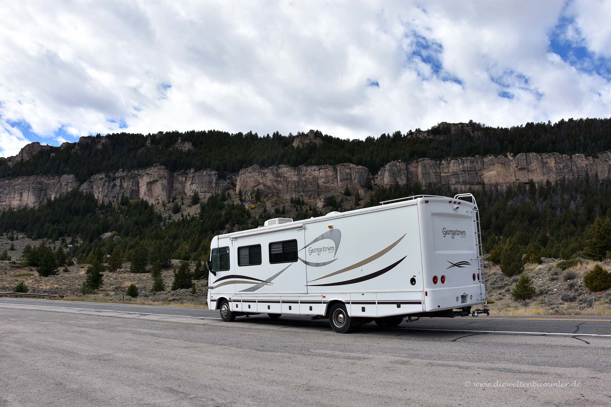 Wir beschlossen, noch weiter nach Westen zu fahren. Es war eigentlich noch relativ früh am Tag und der Yellowstone-Nationalpark reizte uns natürlich heute schon. Durch ein enges Tal erreichten wir die Staumauer vom Buffalo Bill Reservoir, warfen einen Blick in das kleine Besucherzentrum und staunten über das Expeditionsfahrzeug auf dem dortigen Parkplatz. Es stammte aus der Schweiz, doch die Insassen waren nirgendwo zu sehen. Es gab auch leider keine Webseite auf dem Auto, mich hätte interessiert, wo man in den USA mit einem Expeditionsfahrzeug fahren müsste. Bisher hatten wir nicht den Eindruck, dass man das unbedingt benötigt.