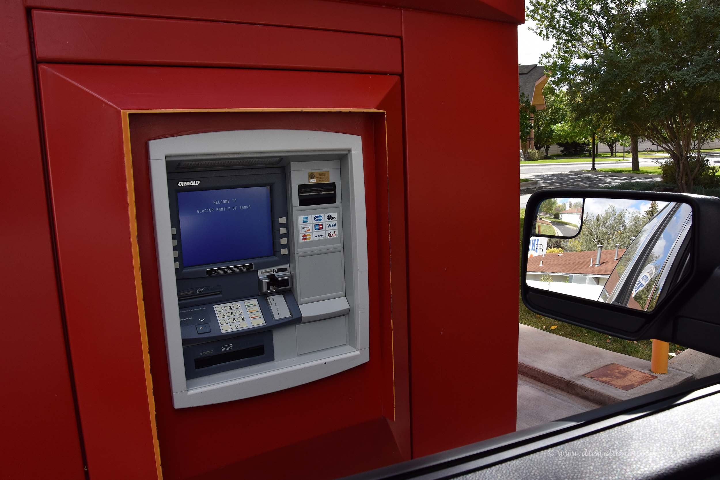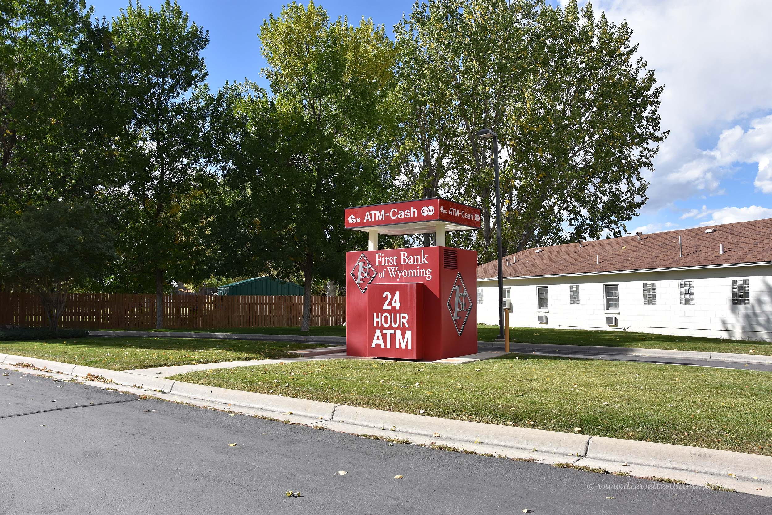 Nach einer langen Fahrt erreichten wir irgendwann endlich Cody. Dieser Ort gilt als einer der Ausgangspunkte für eine Tour in den Yellowstone-Nationalpark. Neben den vielen Hotels und Motels fiel uns noch etwas anderes in Cody auf. Dort sahen wir zum ersten Mal einen Drive-In-Schalter für einen Bankautomaten. Dieser steht in einer kleinen Grünanlage und ist mit dem Auto total bequem erreichbar. Er ist nicht dafür vorgesehen, dass man zu Fuß dorthin gelangt. Typisch amerikanisch halt.