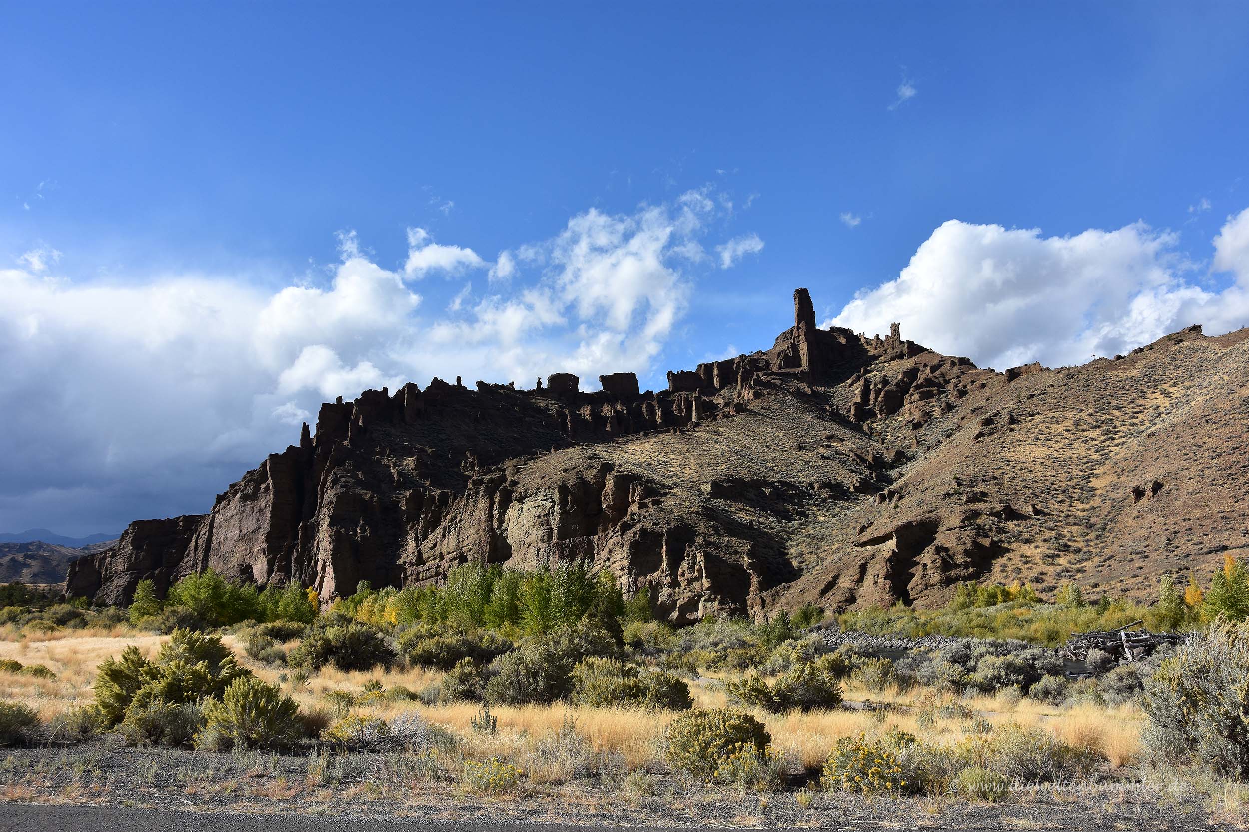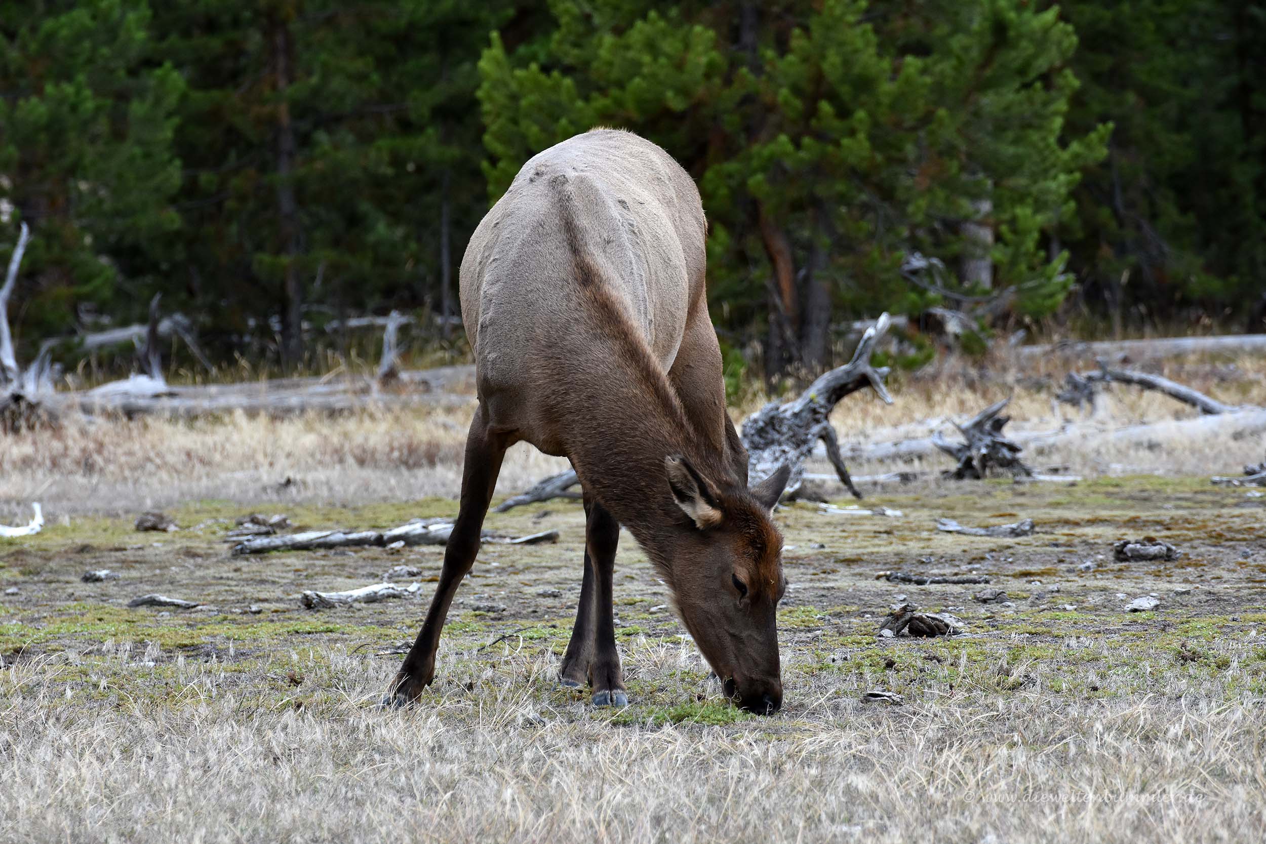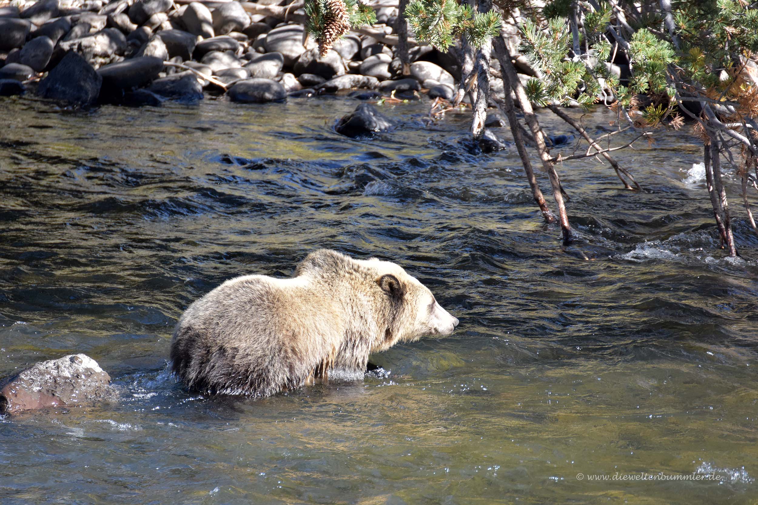 Gut erholt begannen wir also den Tag mit etwas Verspätung, denn um 9 Uhr aufzustehen, waren wir nicht wirklich gewohnt. Ziemlich schnell waren wir wieder auf der Straße in Richtung Yellowstone-Nationalpark. Wir fuhren erneut am Stausee vorbei und in das immer enger werdende Tal hinein. Schon bei der Fahrt am Vorabend hielten wir rechts und links immer Ausschau nach Tieren, denn eine Gams und ein Damwild entdeckten wir auch ohne Mühe. Ich wendete sogar einmal, weil ich während der Fahrt glaubte, einen Bären unten im Fluss gesehen zu haben. Doch dieser Bär entpuppte sich als unbeweglicher Fels.