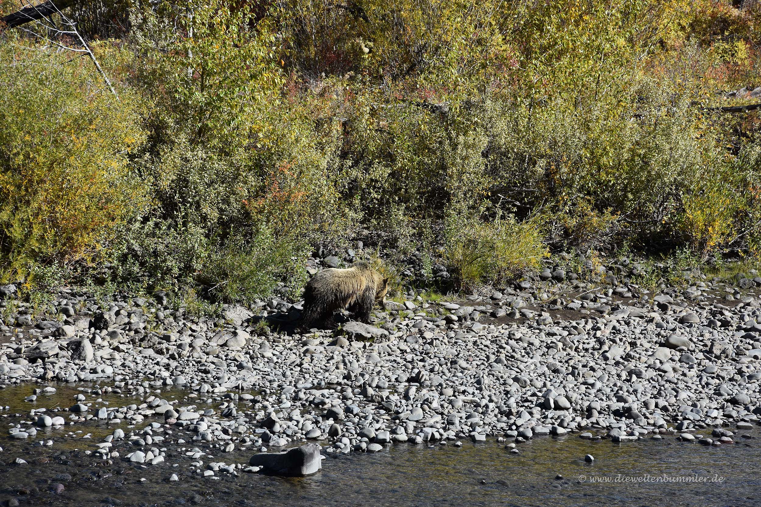 Doch an diesem Morgen sollten sich meine Augen nicht täuschen. Auf der rechten Seite ging es gleich hinter einer Leitplanke etwas abwärts zu einem schmalen Flüsschen. Und auf dem gegenüberliegenden Ufer saß etwas großes, das sich dieses Mal tatsächlich bewegte. Es war ein Bär, es war wirklich ein frei laufender Bär. Ich trat auf die Bremse, steuerte den Wagen so weit wie möglich nach rechts, damit der Verkehr noch durchpasst. Doch die hinter uns wollten gar nicht weiter fahren. Denn auch aus den anderen Fahrzeugen heraus hat man Meister Petz entdeckt. So standen wir mit mehreren Autos und anderen Touristen zusammen oben auf der Straße und beobachteten, wie der Bär durch das Wasser trottete, gelangweilt nach oben blickte und später im Dickicht verschwand. Was für ein Ereignis und dabei waren wir noch gar nicht im Nationalpark.