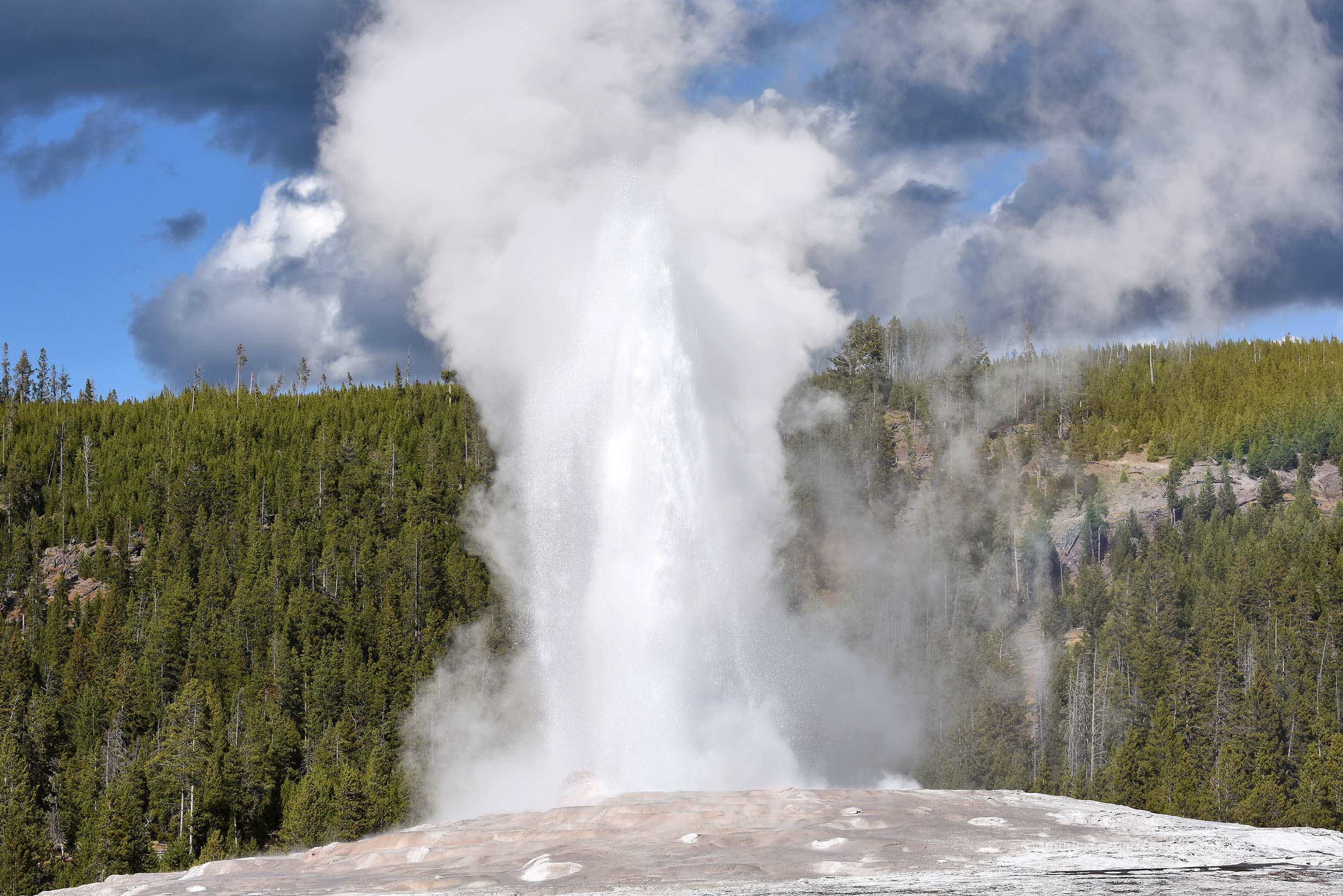 Die Wartezeit wurde durch einen Ranger verkürzt, der mit einer Schautafel von Besuchergruppe zu Besuchergruppe ging und die geologischen Gegebenheiten vor Ort erklärte, was ich ziemlich hilfreich fand und entsprechen Applaus verdiente. Irgendwann kündigte sich der Ausbruch des Old Faithfuls genauso an, wie es der Ranger beschrieb und alle Besucher einschließlich uns, drückten auf ihre Auslöser. Denn das Schauspiel ist nur von kurzer Dauer.