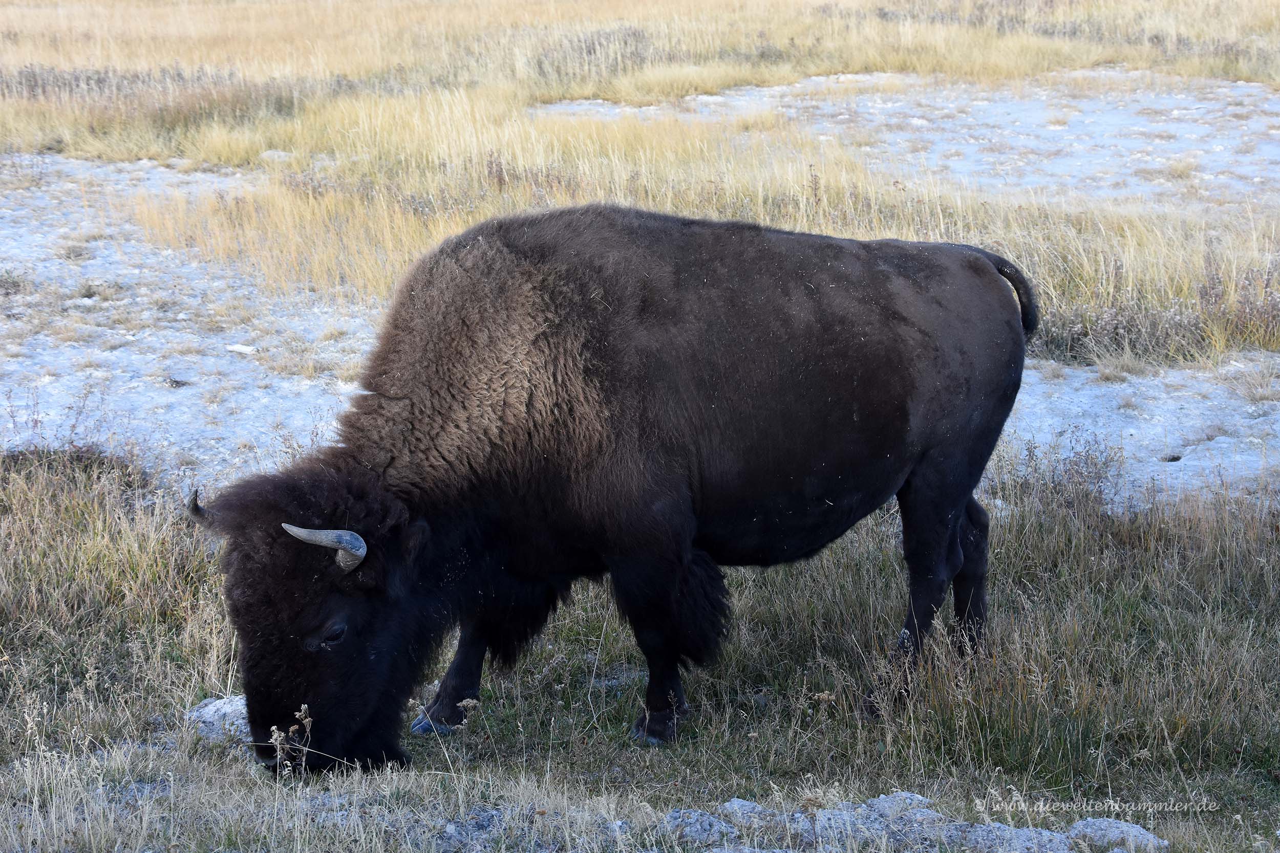 Nach dem kurzen, aber beeindruckenden Stelldichein des Old Faithful, spazierten wir noch zu kleineren Geysiren und suchten auf dem Großparkplatz erstmal unseren Wagen, bevor wir zu einem weiteren Parkplatz fuhren. Von dort aus konnte man durch ein weiteres Geysir-Becken zum West Geysir gelangen. Doch an diesem Geysir erlangte etwas anderes unsere Aufmerksamkeit, denn Ranger standen dort bereit und warnten die Besucher vor einigen Bisons, die hier frei umher liefen und grasten.