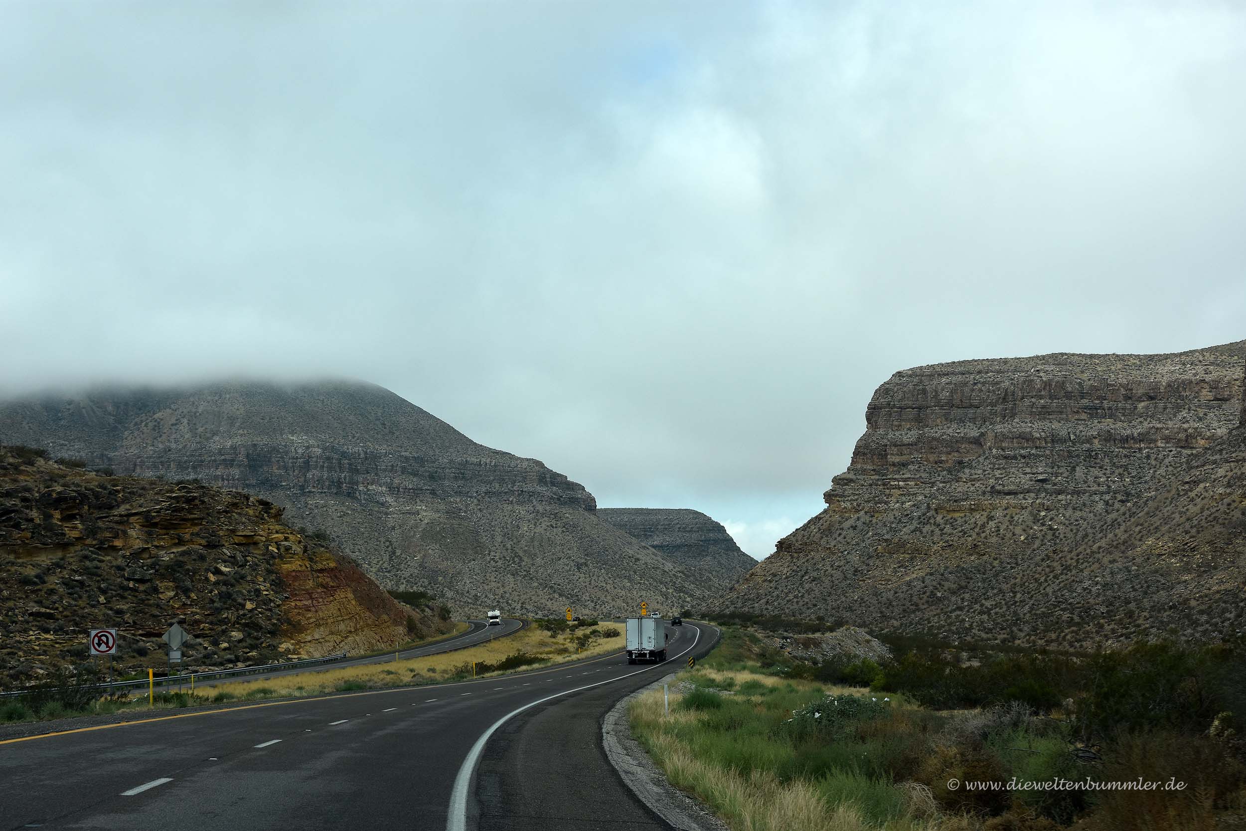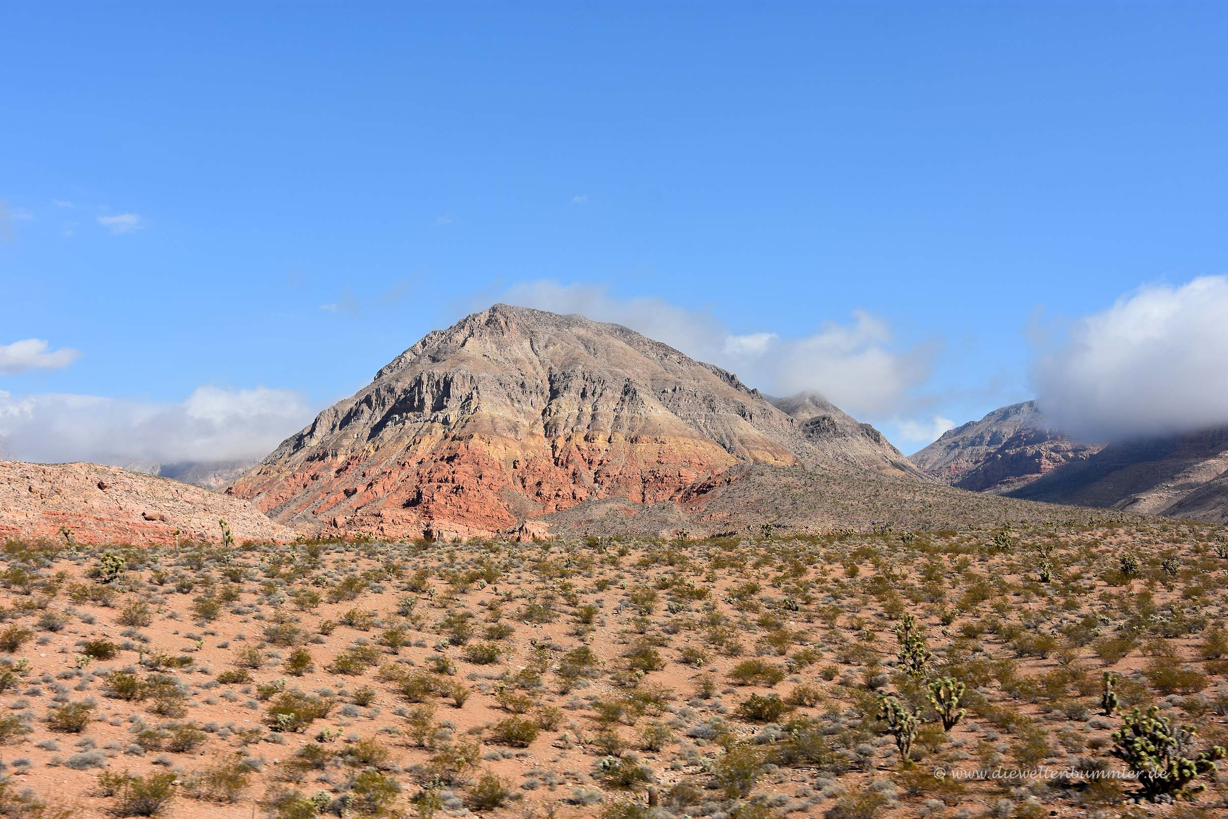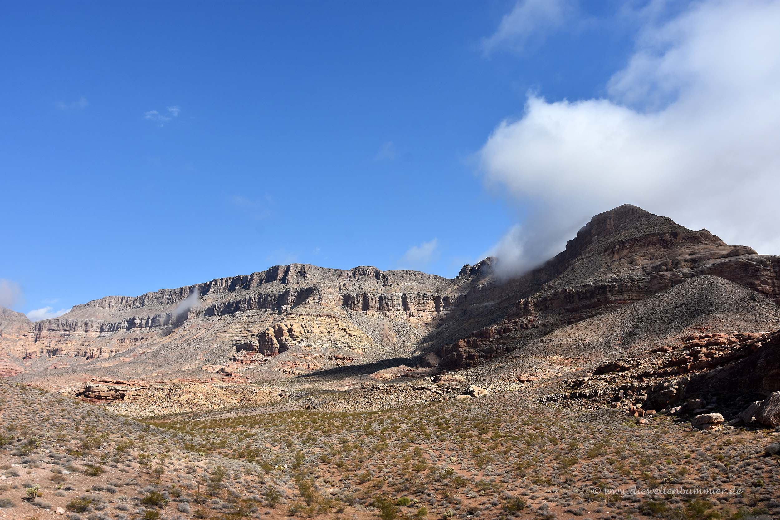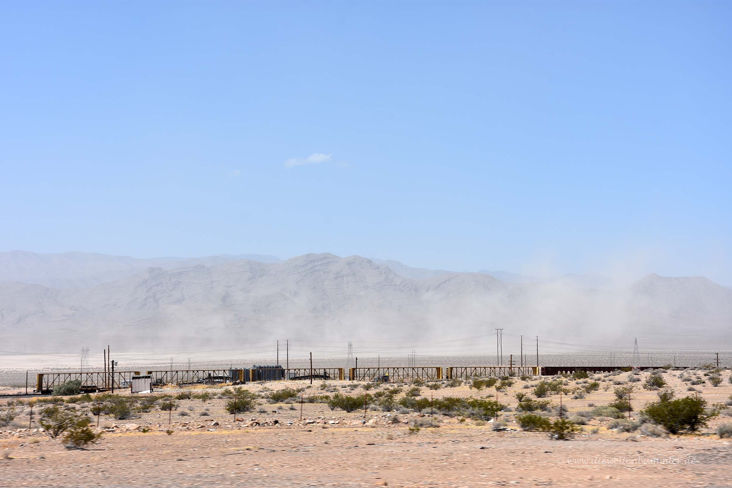 Nach dem Besuch am Dreiländereck fuhren wir vorsichtig über die Schotterstrecke wieder zurück zur Interstate in Arizona und folgten dieser nach Nevada, wo wir ein weiteres Mal die Bundesstaaten-Grenze überquerten. Die Strecke durch die Wüste hatte nicht viel zu bieten außer sehr viel Wind und dadurch auch extrem viel Wüstenstaub. Wir wussten nicht, ob man das schon als Sandsturm bezeichnen könnte, aber für uns war das auf jeden Fall einer.