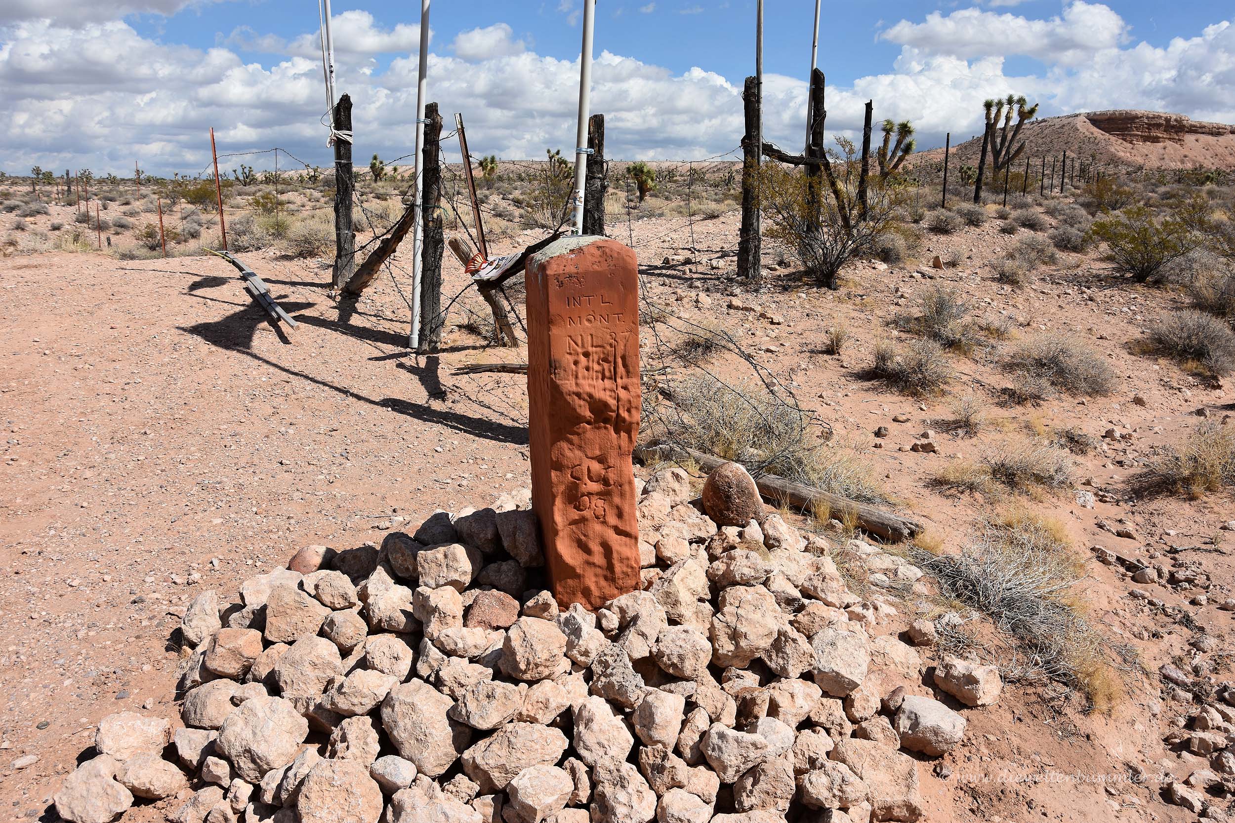 Kurios war das Dreiländereck deswegen, weil es -typisch amerikanisch- mit der Stars and Stripes bestückt war. Klar, dass die amerikanische Flagge nicht fehlen darf. Aber sie hier so in der Wüste zu sehen, wo sonst außer ein paar Yoshua-Trees nichts zu sehen ist, war schon ein seltsamer Anblick.