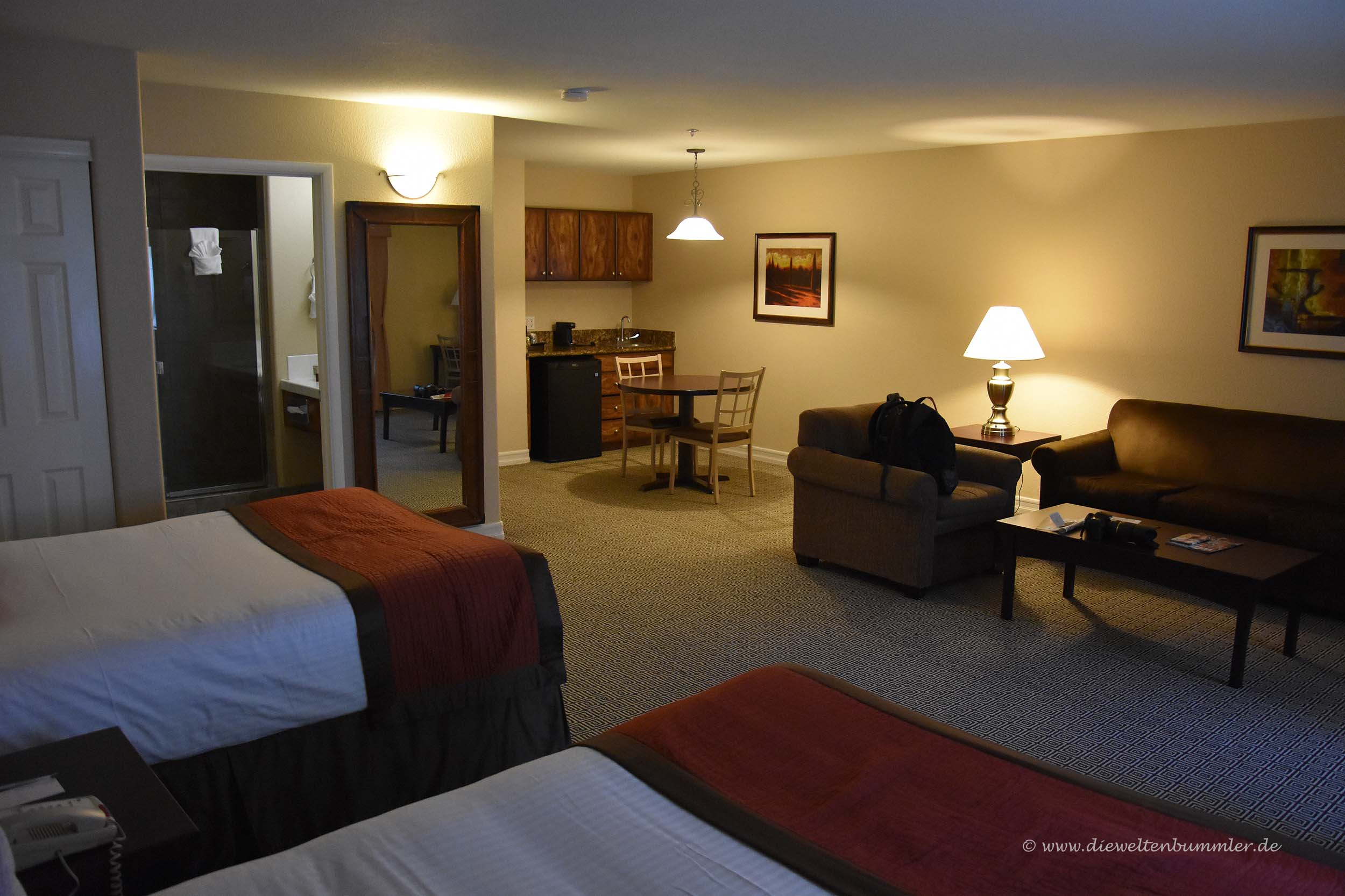 Nach einiger Zeit erreichten wir Las Vegas, wo wir das Hotel Tuscany für uns auswählten. Es war natürlich nicht ganz so günstig, immerhin waren wir in Las Vegas, aber es bot ein verdammt gutes Preis-Leistungsverhältnis, denn das Zimmer war auf der gesamten Reise das größte, was wir erlebt haben. Später sahen wir, dass dieses Zimmer an Wochenenden mal eben das Dreifache kosten würde. Na wie gut, dass wir Donnerstag hatten.