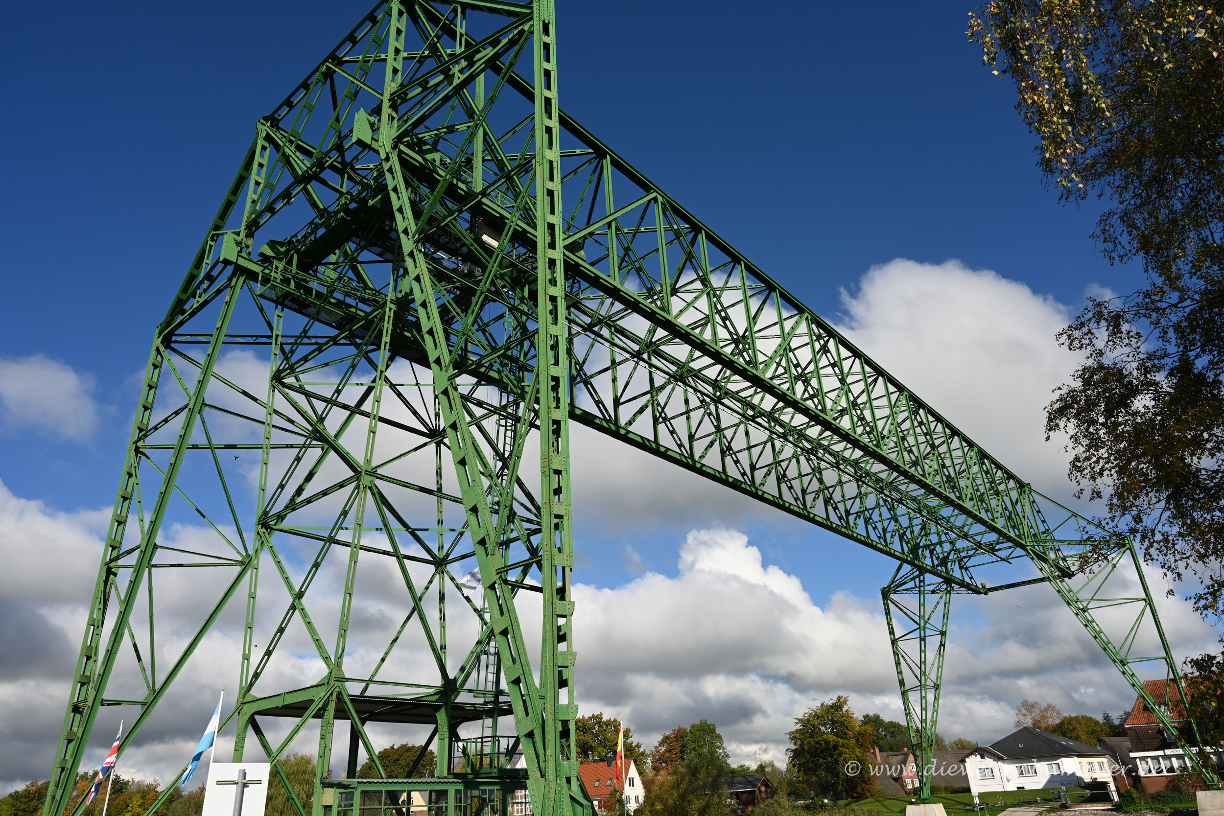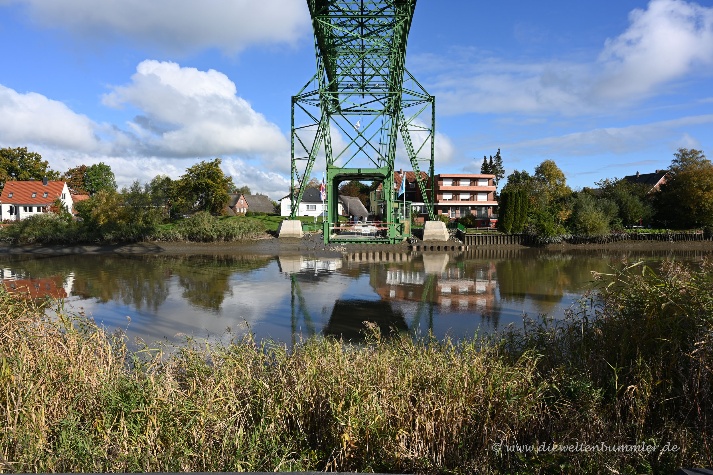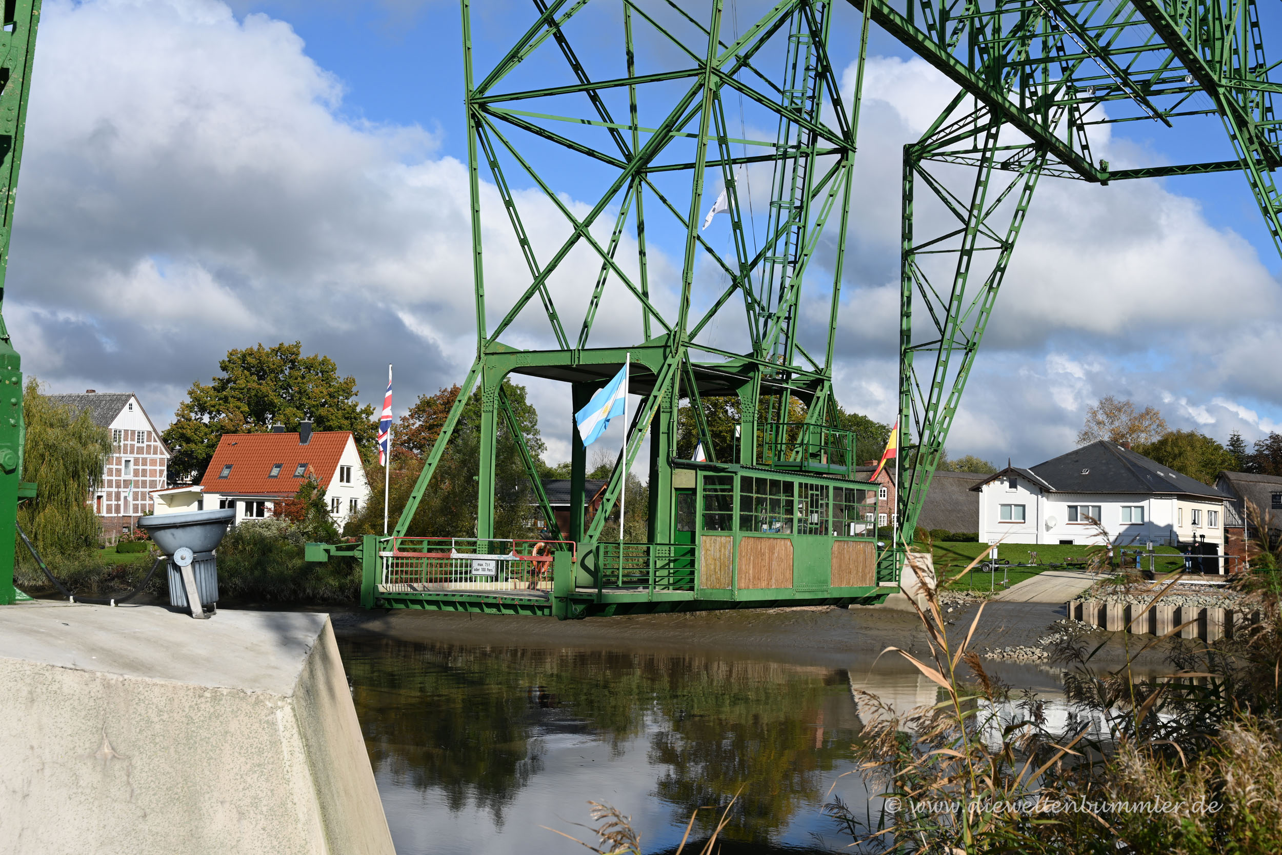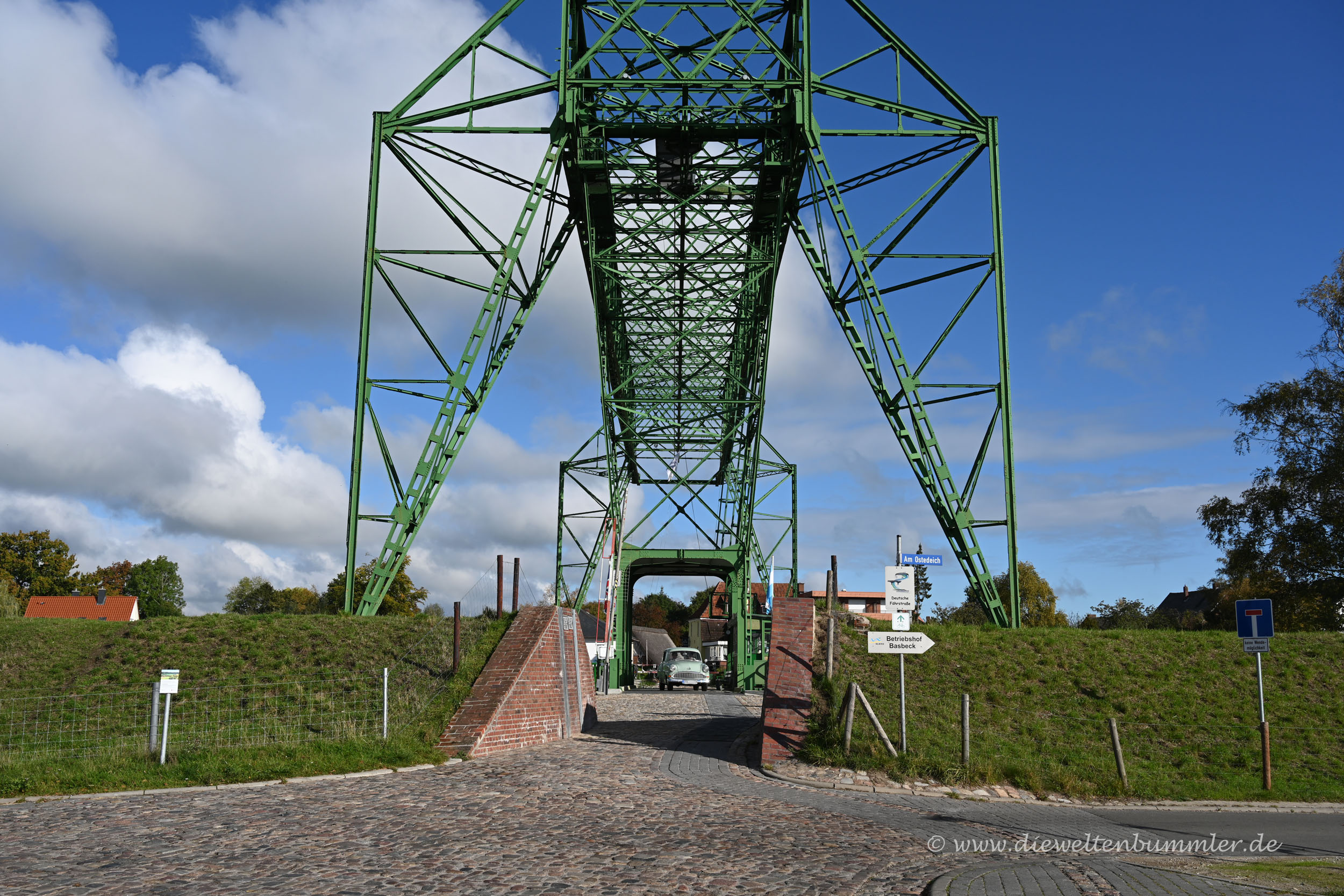 Da wir in der Vergangenheit schon mehrere Schwebefähre, so zum Beispiel in Wales oder England besuchten und selbst nutzten, interessierte uns diese Schwebefähre natürlich auch. Wir wendeten und folgten direkt mal dem Schild zum Ufer der Oste. Dort verbindet die über 100 Jahre alte Schwebefähre beide Ufer, doch schon seit den 1970er-Jahren dient sie nur noch touristischen Zwecken.