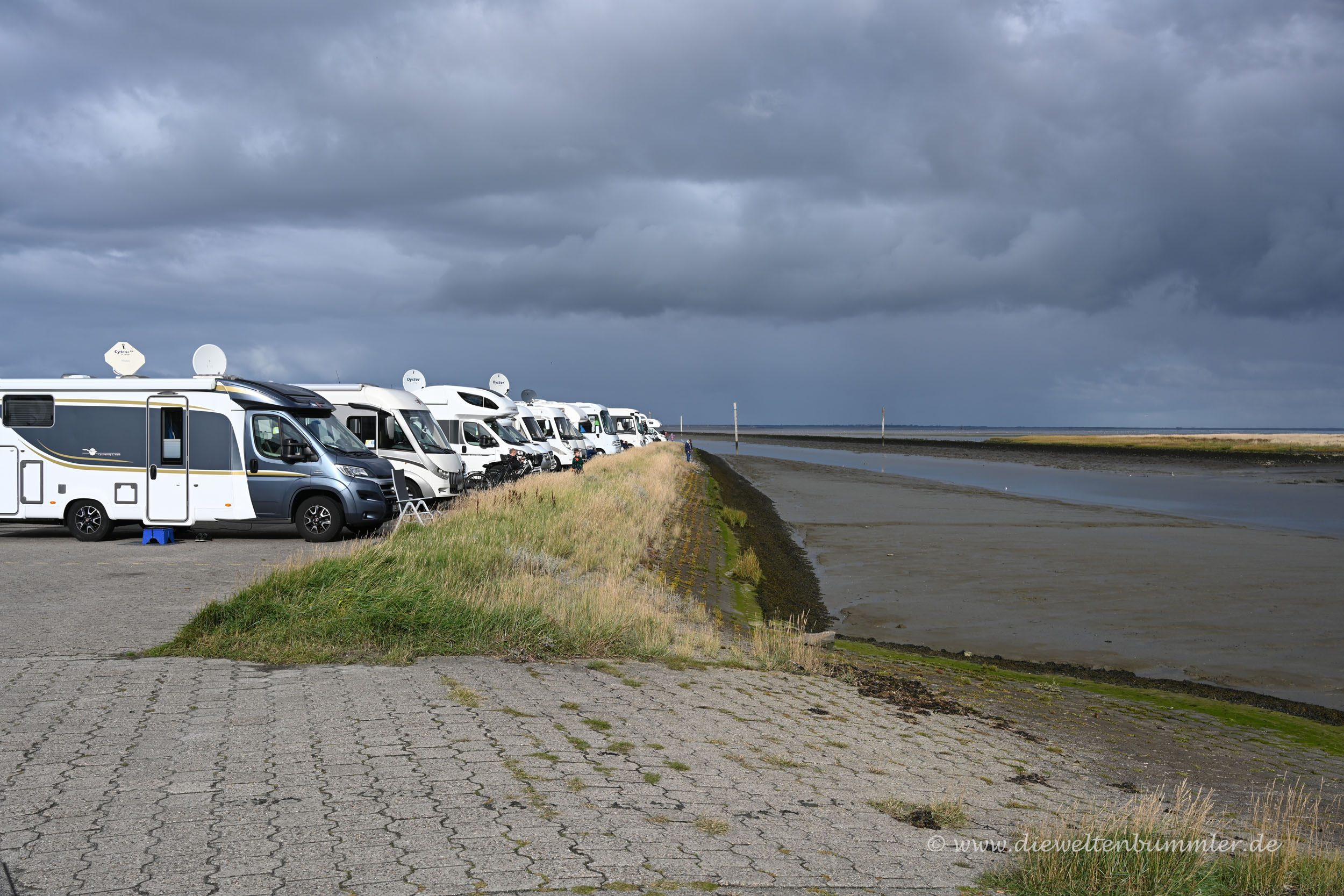 Das hatten wir schon lange nicht mehr. Und nach den Auswüchsen des Wohnmobiltourismus auf unserer letzten Reise im September wären wir schon froh gewesen, überhaupt einen Stellplatz zu bekommen. Aber dann auch noch mit direktem Blick auf die Harle und den Hafen war schon schön.