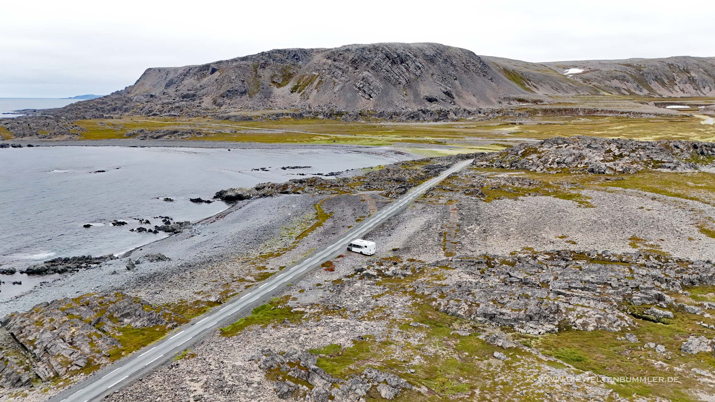 Wieder zurück auf dem Festland fuhren wir aber nicht sofort die Eismeerstraße wieder zurück. Denn die Landschaftsroute Varanger geht noch weiter. Über eine Asphaltstraße gelangt man noch weiter in den Norden und zwar in den Ferienort Hamningberg. Besonders schön dabei ist die Fahrt an sich. Die Straße verläuft nämlich durch eine bizarre und wunderschöne Felslandschaft, die ihresgleichen sucht. Es hatte uns unheimlich gut gefallen, doch wir beschlossen es so zu halten, wie wir das in amerikanischen Nationalparks machen, wenn die Straßen eine Sackgasse sind: Erstmal bis zum Ende durchfahren und dann gemütlich mit zahlreichen Zwischenstopps für Fotos wieder zurück.