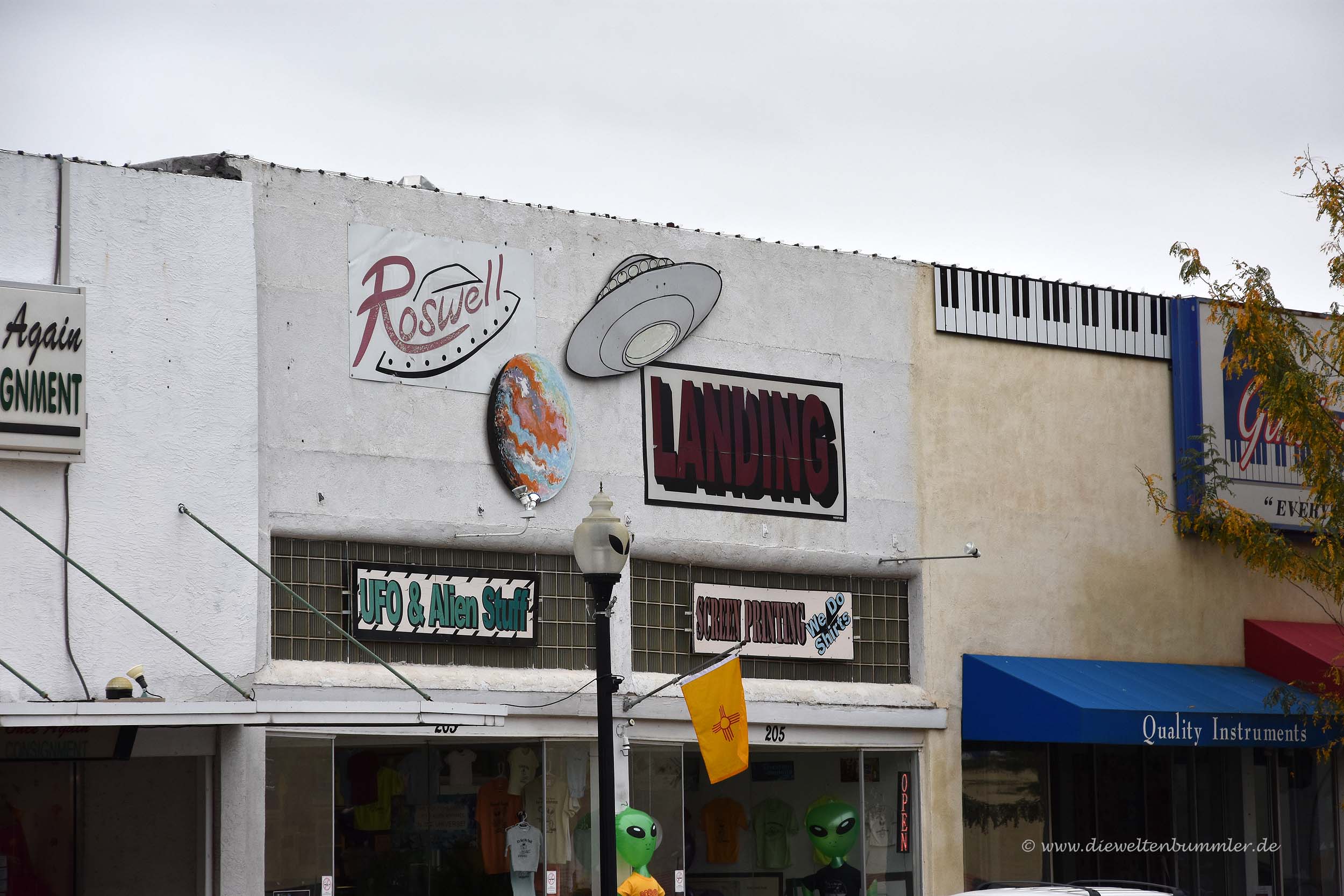 Unterbrochen wird dieses ewige Einerlei in Roswell nur von ein paar Geschäften, die ihre besten Tage definitiv hinter sich haben. Vermutlich waren es die Tage im Jahr 1947. Das Stadtzentrum besteht aus ein paar wenigen Souvenirläden, in denen grüne Alienmasken und einige Sachen mehr angeboten werden, die irgendwie in einem Zusammenhang mit Außerirdischen stehen könnten.