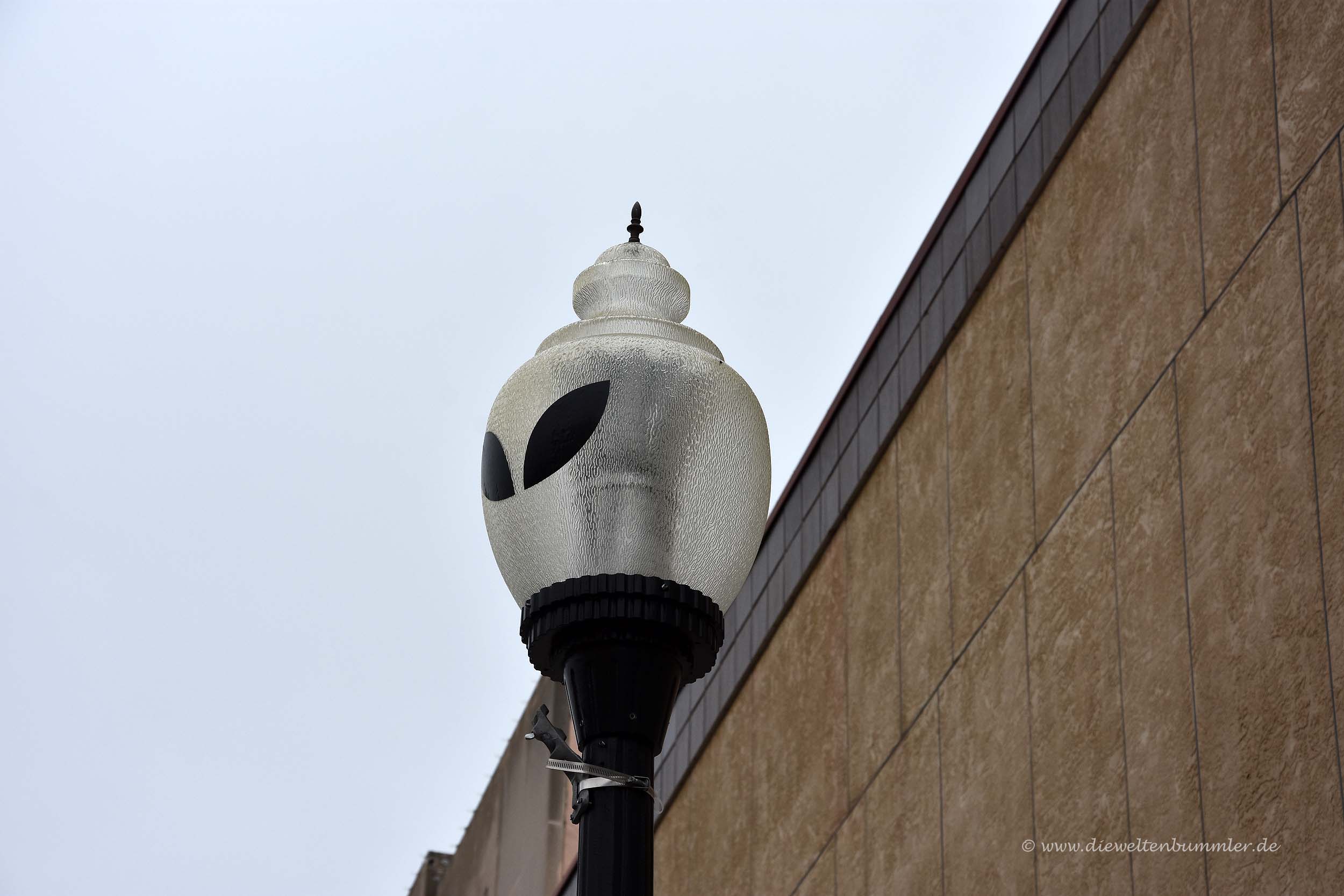 Drollig fand ich auch die Straßenlaternen, die zu Aliens verwandelt wurden. Zwei kleine Aufkleber auf dem Lampenglas, fertig ist der Außerirdische. So einfach geht das. Ein liebevolles Detail, das man vielleicht erst beim zweiten Blick bemerkt. Davon gerne mehr. Dann würde es sich auch lohnen, nach Roswell zu fahren und wer weiß, vielleicht käme ja auch mal ein Außerirdischer zu Besuch.