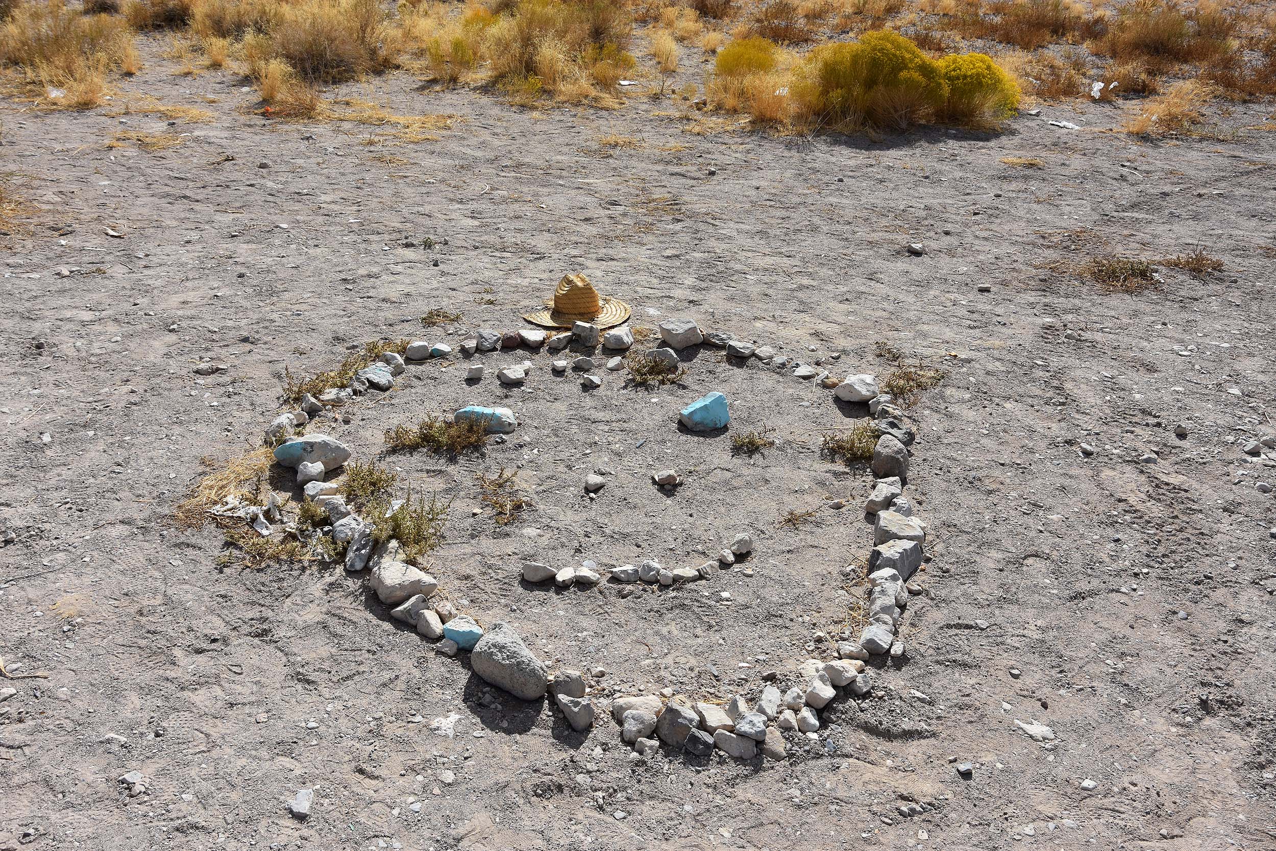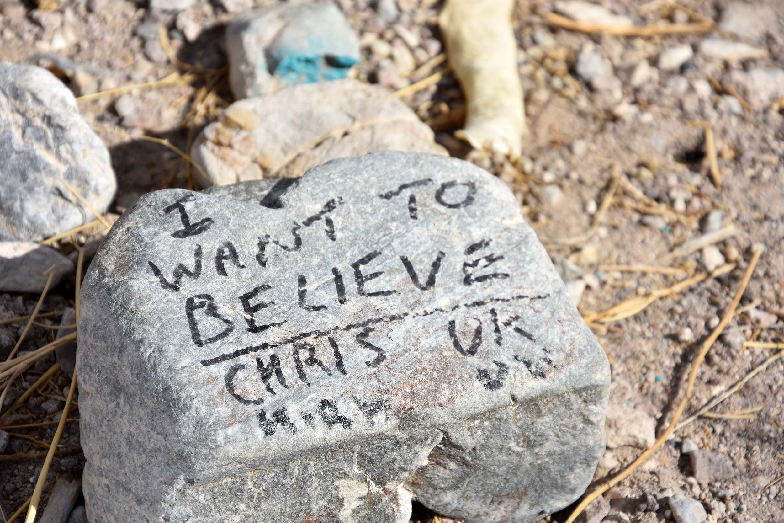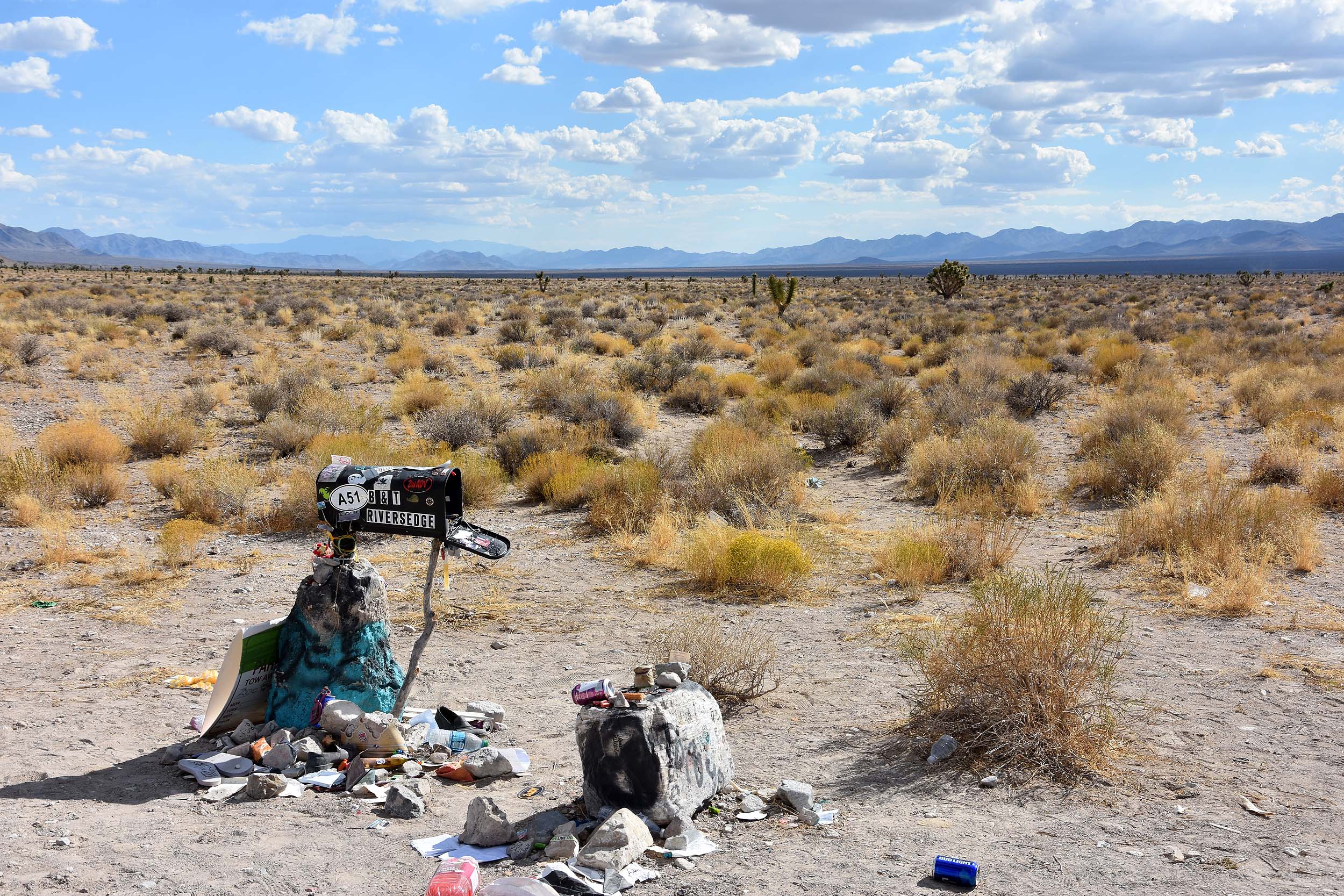 Schon bald kommt der sogennante Schwarze Briefkasten. Hier befindet sich der Abzweig zur Nellis Range-Basis, auf der sich der Groom Lake und die Area 51 befindet. Der Briefkasten gehörte einstmals einem Farmer, der der Basis am nächsten wohnt. Aber anstelle eines Briefkastens gibt es heute zahlreiche Erinnerungen an Menschen, die hier gerne mal ein Ufo sehen würden. Sieht ein bisschen aus wie eine kleine Müllhalde. Aber schaut man genauer hin, dann sind das Botschaften der Erdlinge an die Aliens. Zu lesen sind Sätze wie: „Holt mich ab“ oder „I want to believe“ usw.