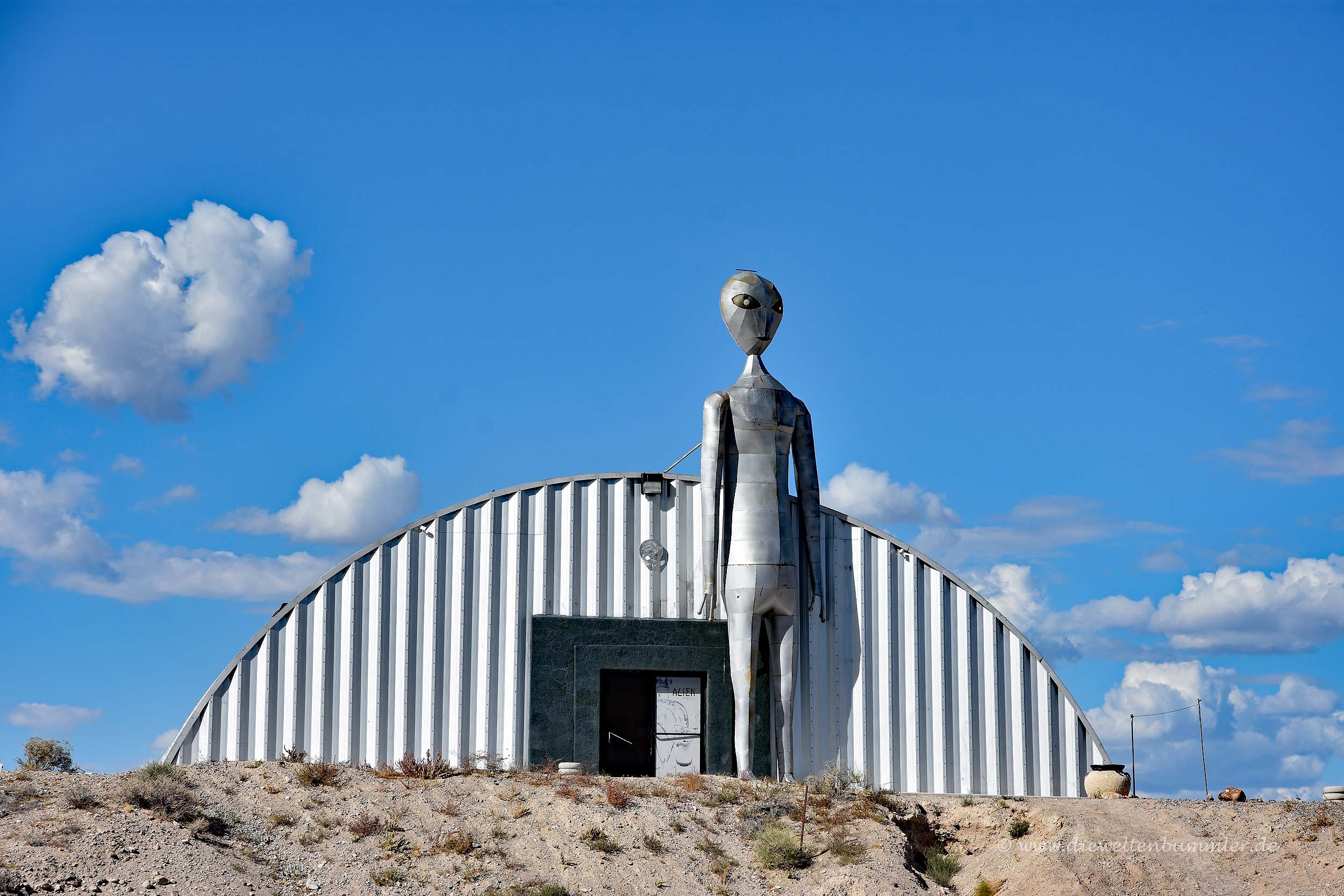 Die Straße 375 bzw. der Extraterrestrial Highway, der übrigens ganz offiziell so vom Gouverneur von Nevada so umbenannt wurde, endet in einem kleinen Weiler namens Chrystal Springs. Dieser Weiler ist noch kleiner und unbedeutender als Rachel. Aber was die Aliens betrifft, versucht man auch hier, ein wenig von der Bekanntheit des ET-Highway zu profitieren. Am Straßenrand befindet sich eine Art Lagerhalle mit der überdimensionalen Skulptur eines Außerirdischen vor der Tür.