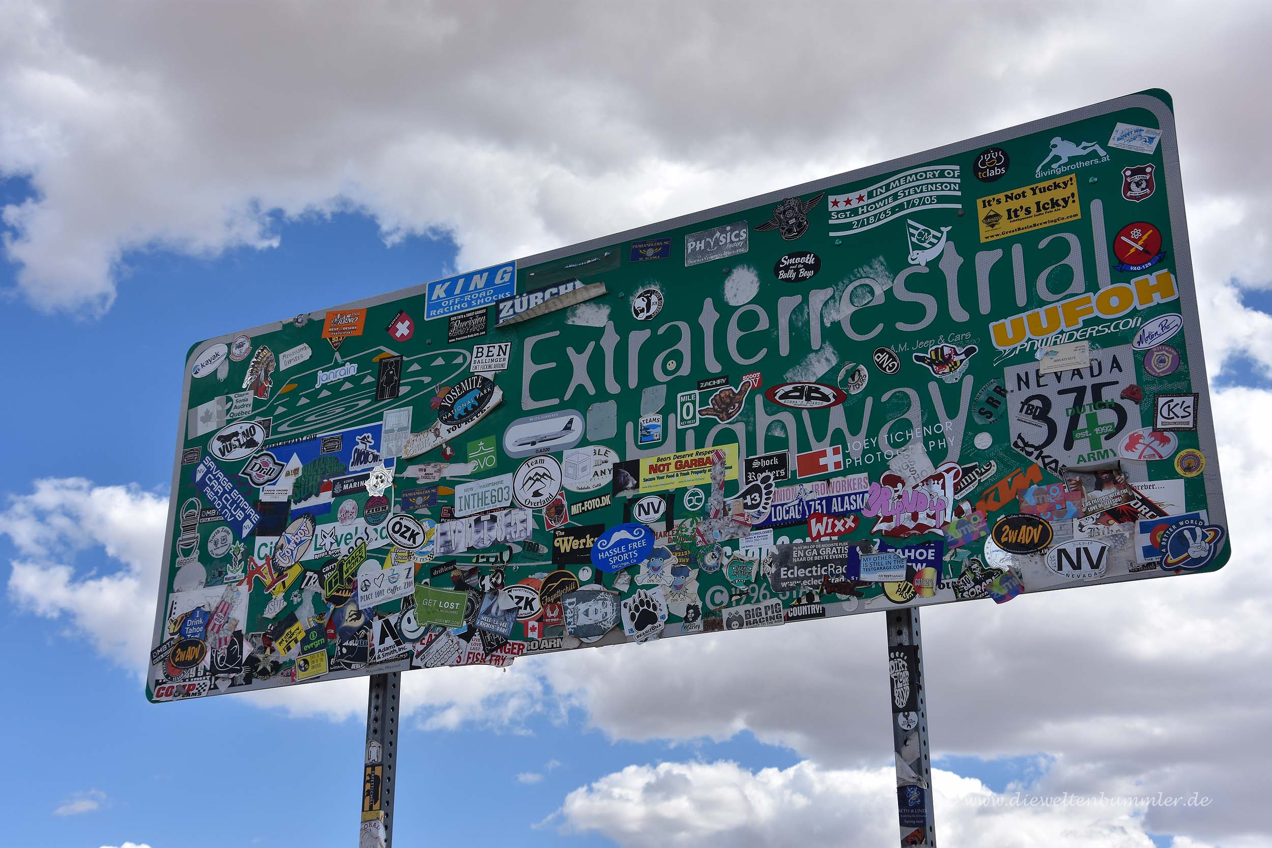 Gleich dahinter erschien ein für Amerika typisch grünes Verkehrsschild. Auf diesem war ein Ufo abgebildet und der Name der Straße als „Extraterrestrial Highway“ aufgeführt. Leider war dieses Schild von zahlreichen Aufklebern übersät, sodass der Schriftzug kaum zu lesen war. Also verirren sich doch ein paar Touristen nach Rachel. Oder es ist doch alles nur ein großer Schwindel.