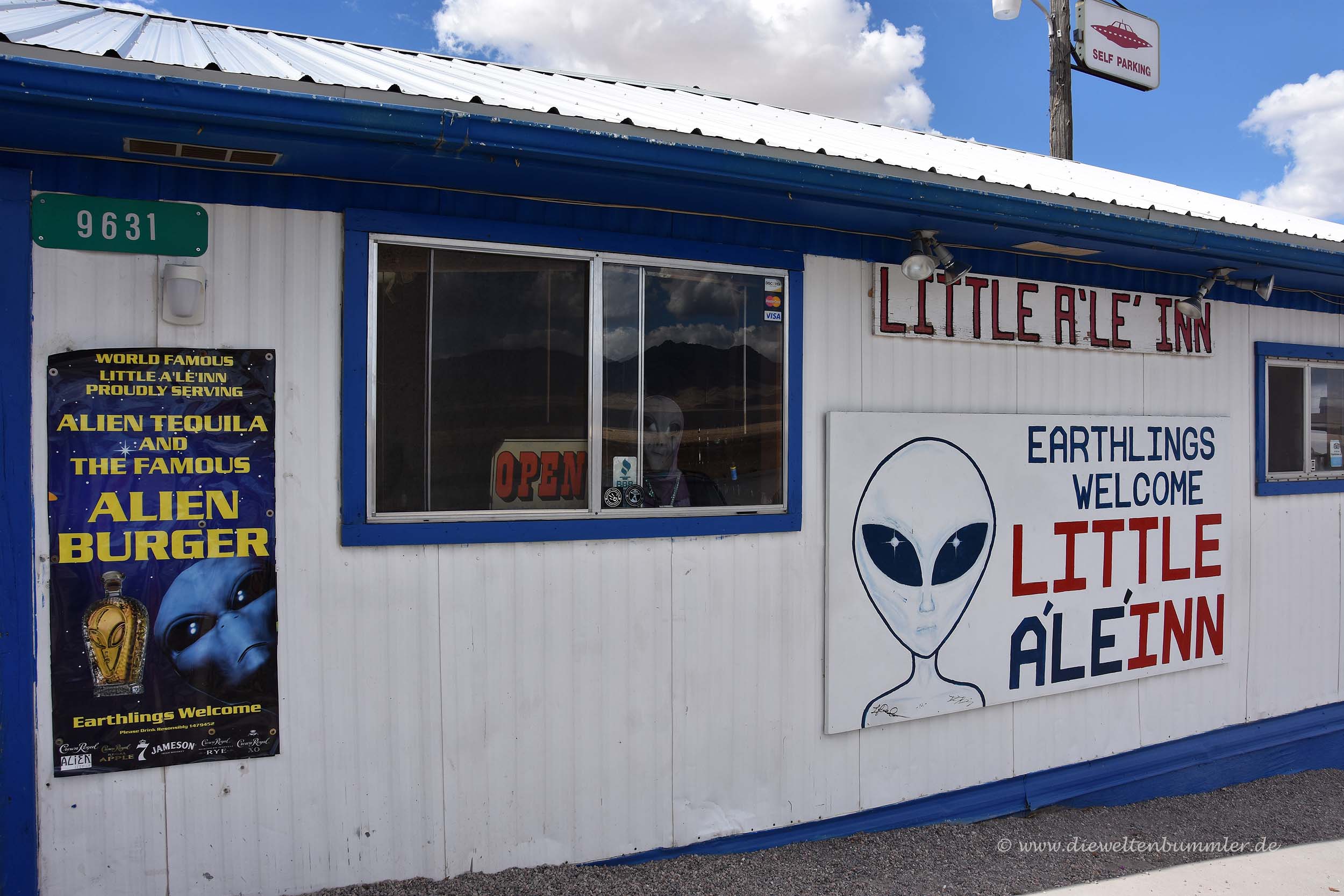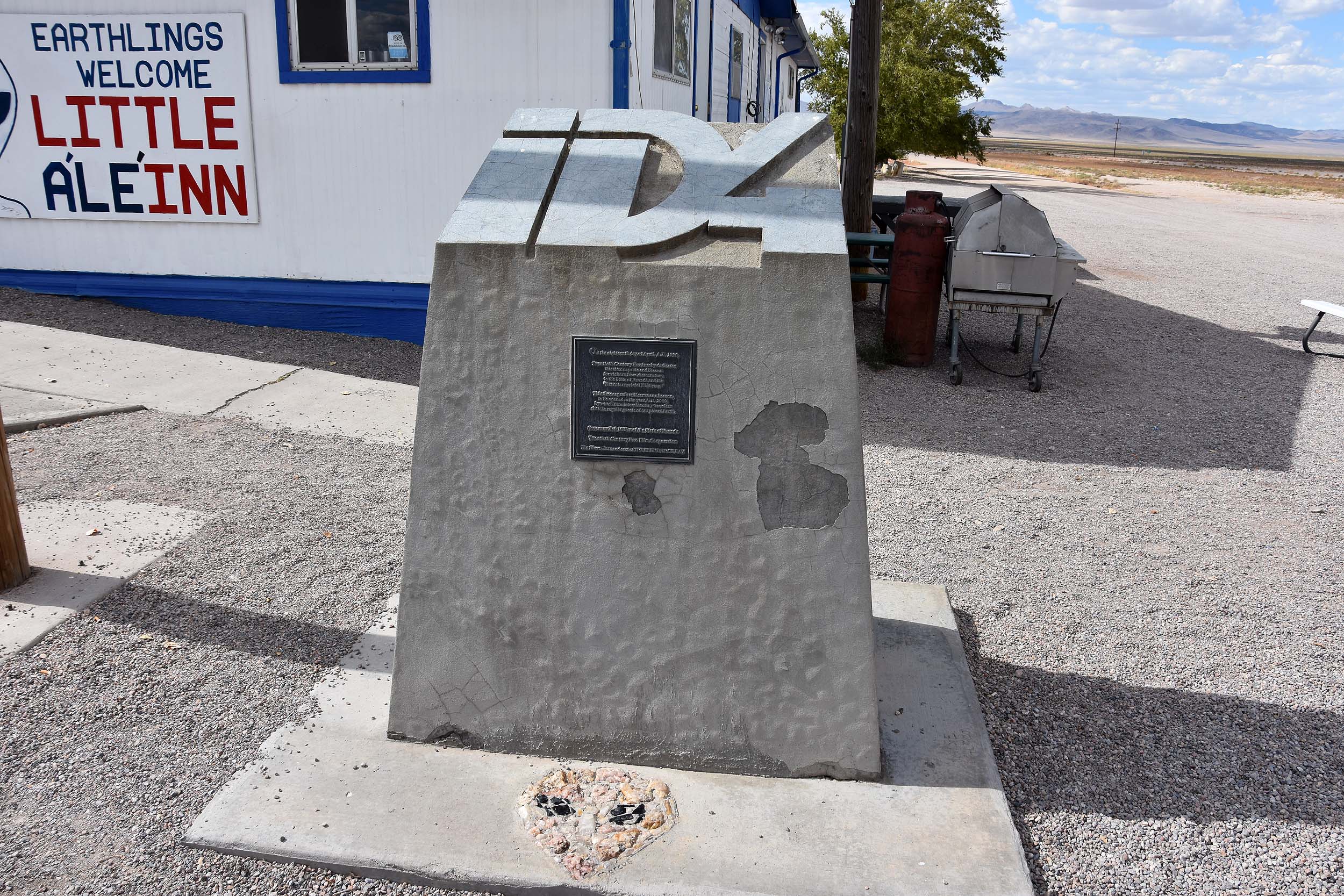 Außerdem gibt es ein paar Deko-Elemente wie das Parkplatz-Schild für Aliens und den kleinen grünen Außerirdischen, der Erdlinge willkommen heißt. Auffallend ist auch die Zeitkapsel aus dem Jahr 1996. Sie wurde verschlossen als der Außerirdischen-Film „Independence Day“ im Kino anlief. Laut der Infschrift soll die Zeitkapsel im Jahr 2050 wieder geöffnet werden – und zwar im Beisein von Außerirdischen, die dann auch auf unserem Planeten leben würden.