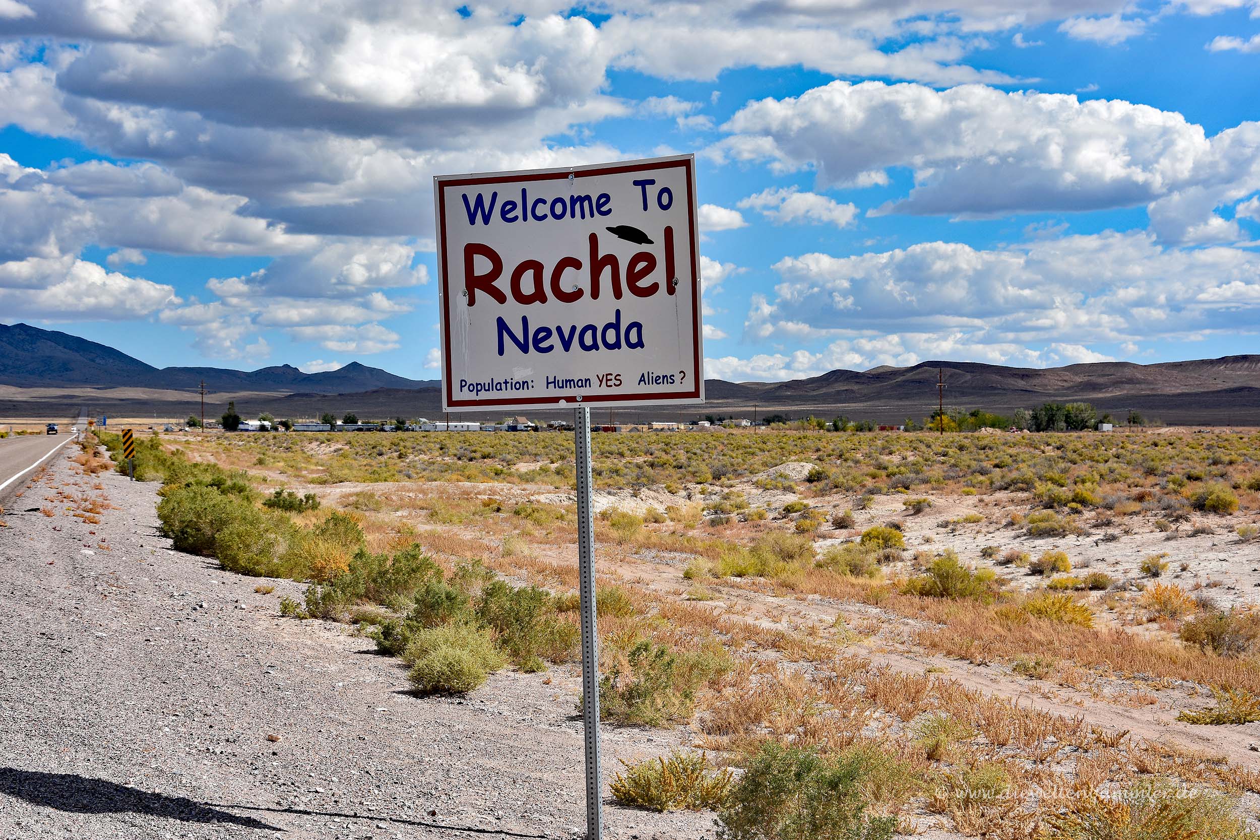 Wir näherten uns Rachel von Westen kommend, ein gut gefüllter Tank ist mangels Tankstelle auf der Strecke übrigens sinnvoll, und hielten ein erstes Mal an dem Ortseingangsschild von Rachel. Dieses verriet uns, dass dort menschliches Leben vorkommt. Ob auch Aliens dort weilten, wurde mit einem Fragezeichen offen gelassen.
