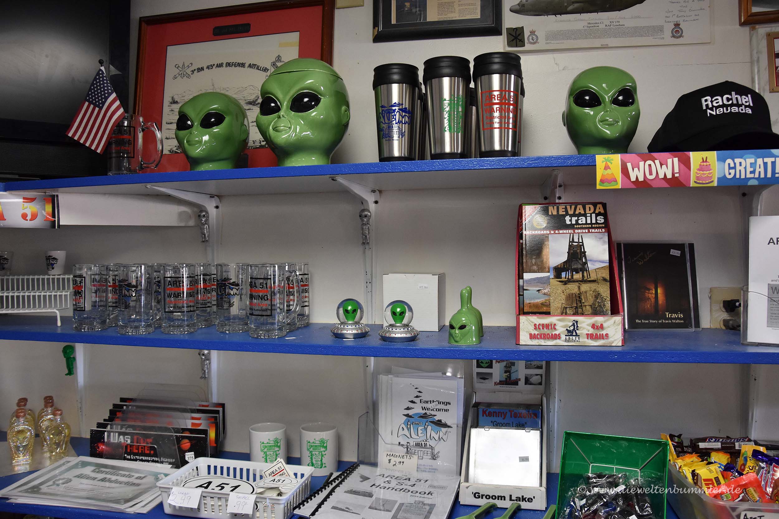Innen entpuppt sich die Lagerhalle als Geschäft, in dem alles mögliche angeboten wird, was irgendwie mit dem Weltall zu tun haben könnte. Ob das nun T-Shirts mit Aufdrucken von Star Wars und Star Treck sind, die dazugehörigen Figuren oder sogar Literatur über Jacky Kennedy. Immerhin hat ihr Mann Anfang der 1960er-Jahre als US-Präsident verkündet, dass die Menschheit noch im selben Jahrzehnt den Mond erreichen würde. Kurz gesagt, man versucht alles, was irgendwie als Außerirdisch bezeichnet werden könnte, an den Mann zu bringen. Dieser Laden konnte uns nicht wirklich überzeugen, aber die Fahrt über den ET-Highway gefiel uns ziemlich gut.