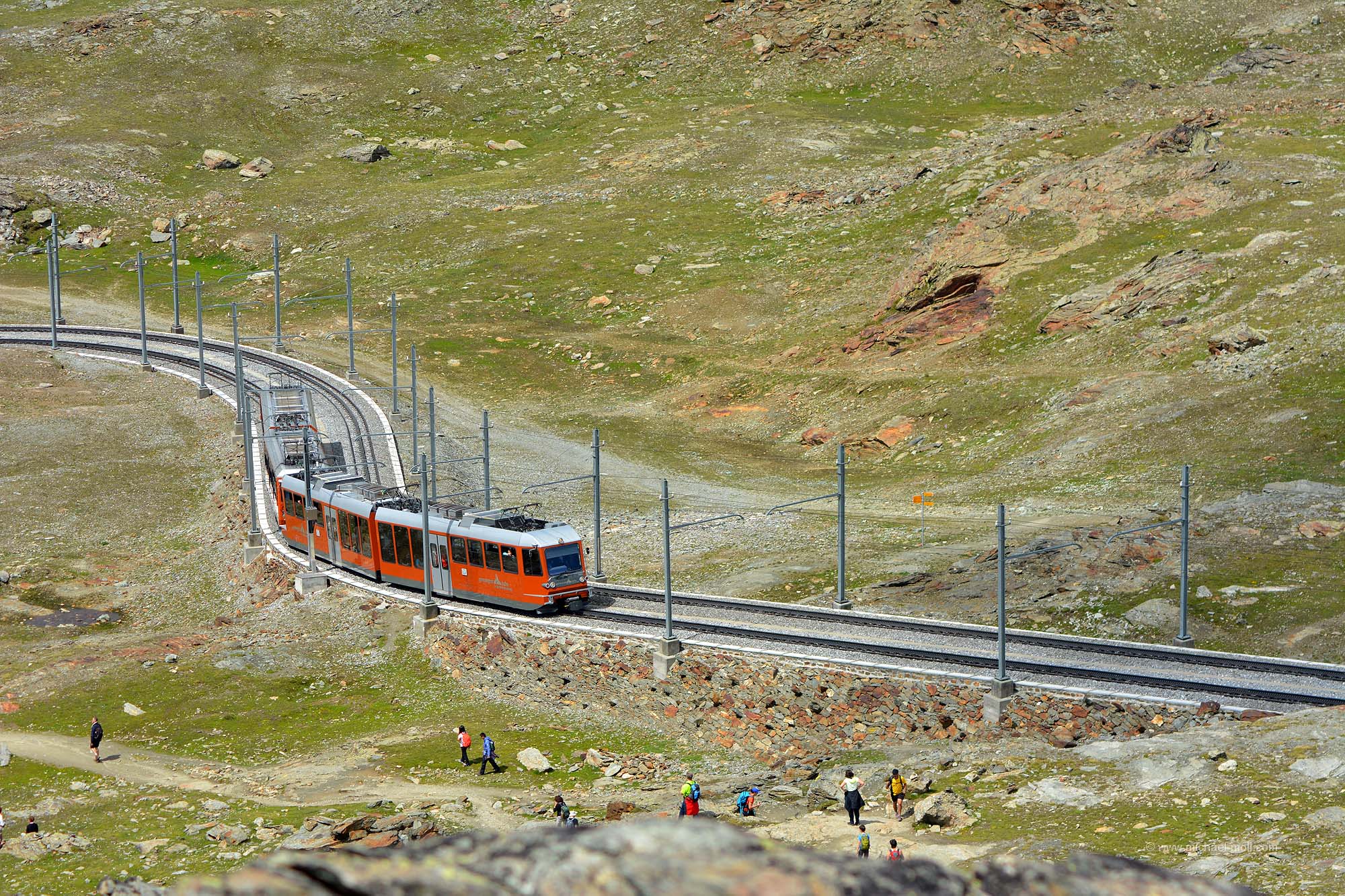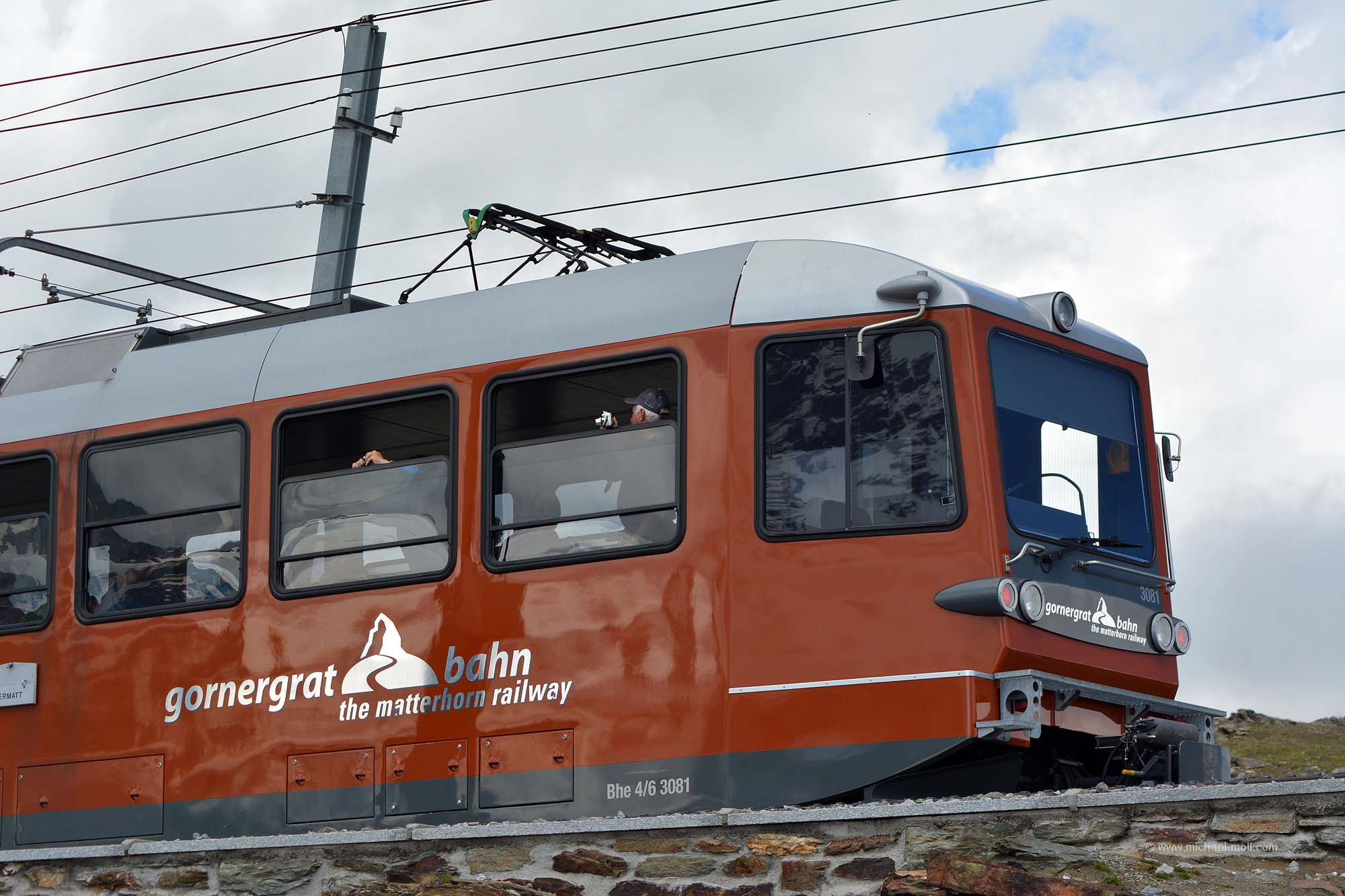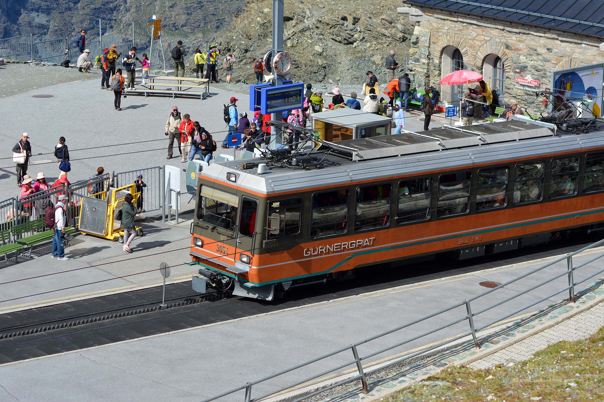 Nun geht es aber erst einmal so richtig hoch. Denn in Zermatt befindet sich die Talstation der Gornergratbahn. Diese Zahnradbahn fährt etwas über eine halbe Stunde und passiert die Bahnhöfe Findelbach, Riffelalp, Riffelberg, Rotenboden und schließlich Gornergrat. Dabei legt die Zahnradbahn noch einmal knapp 1.400 Höhenmeter zurück und man befindet sich in einer Höhe von 3.089 Metern. Die restlichen Höhenmeter bis zum eigentlichen Gornergrat auf 3.135 Metern legt man dann zu Fuß zurück.
