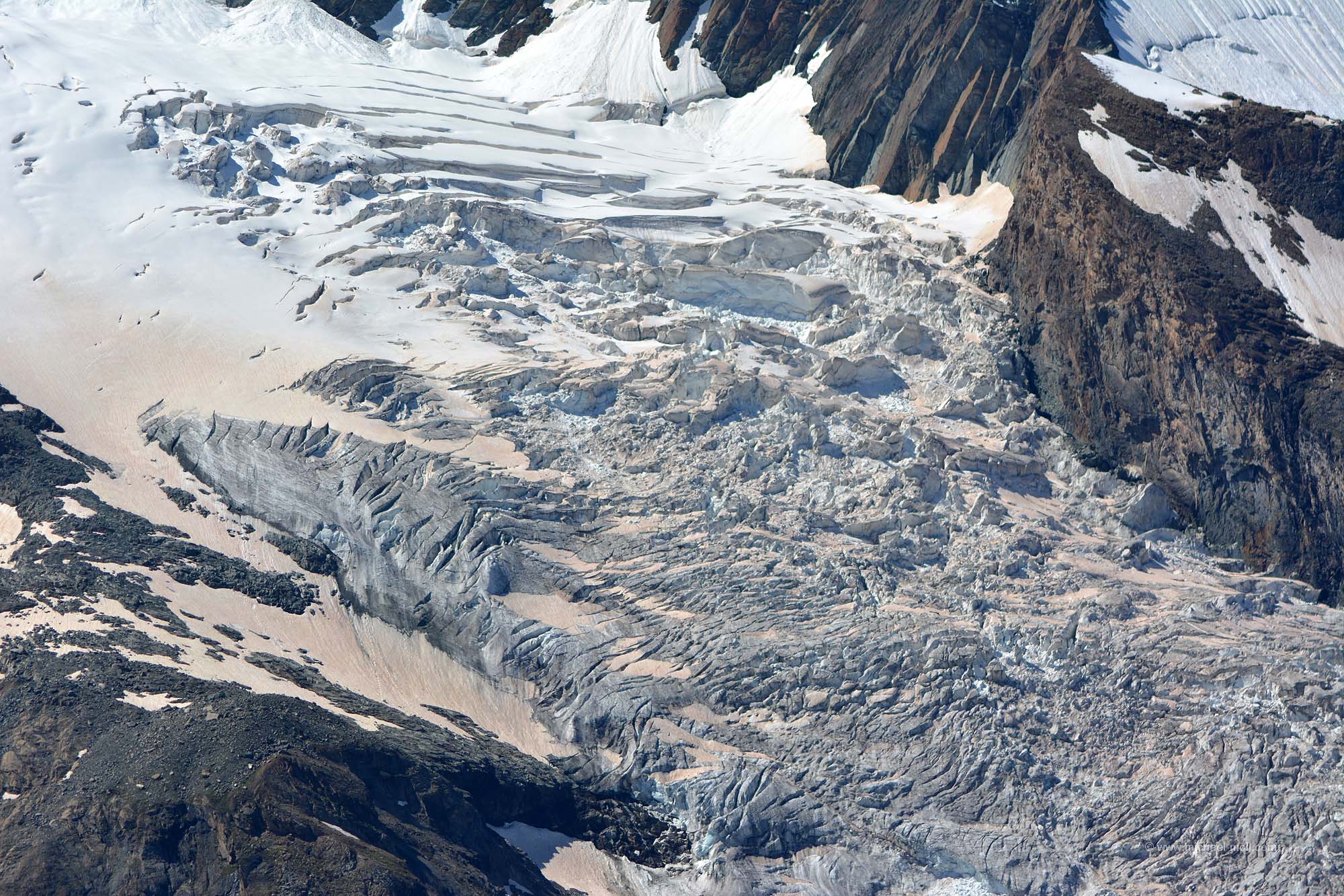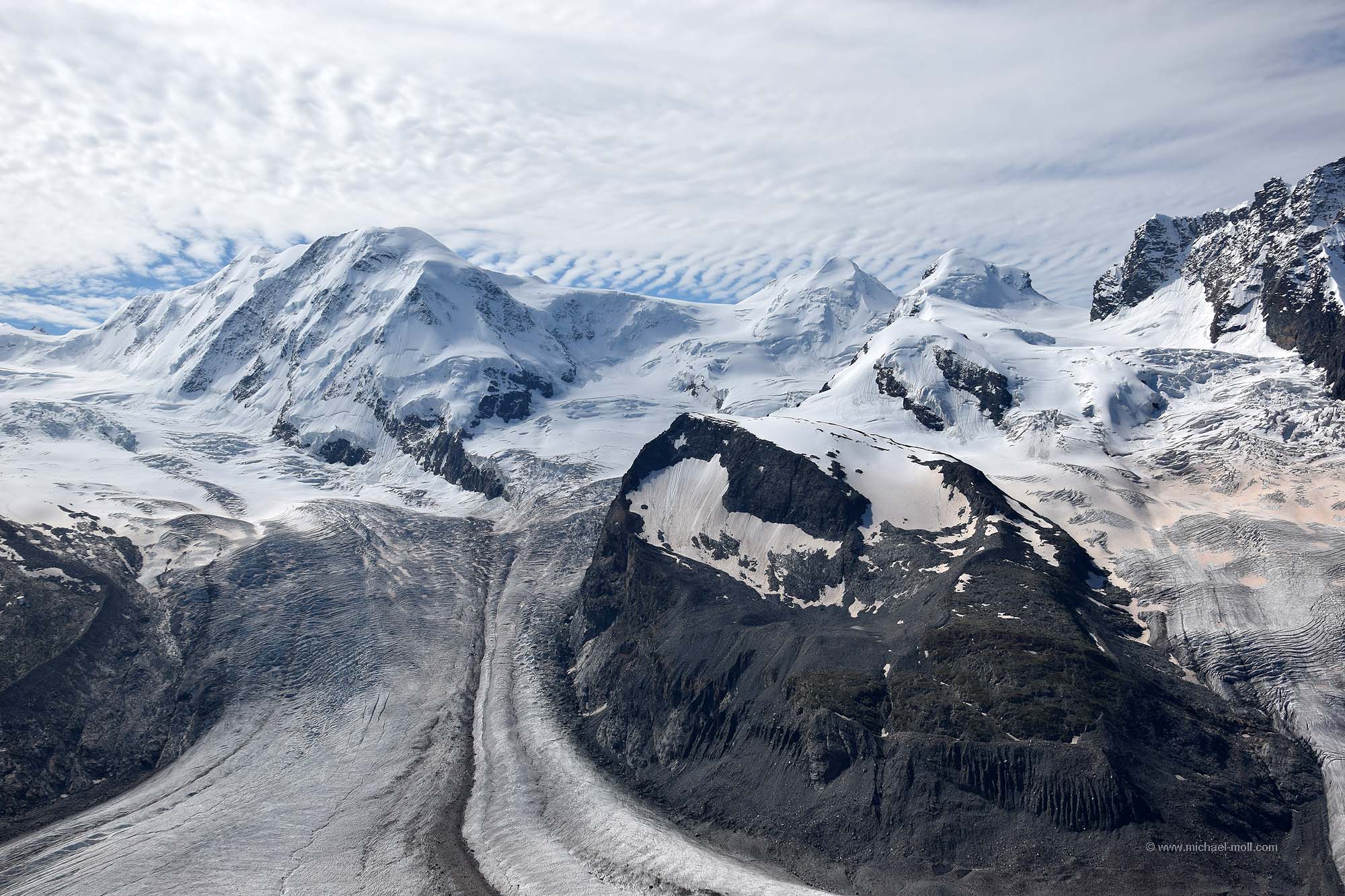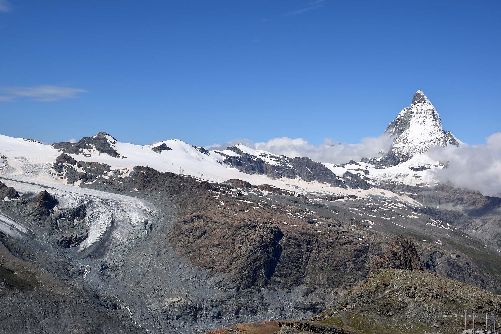 Unterhalb des Gornergrats bzw. südlich davon erstreckt sich der Gornergletscher mit einer Gesamtlänge von fast 13 Kilometern und trennt den Grat von dem dahinter liegenden Monte-Rosa-Massiv.